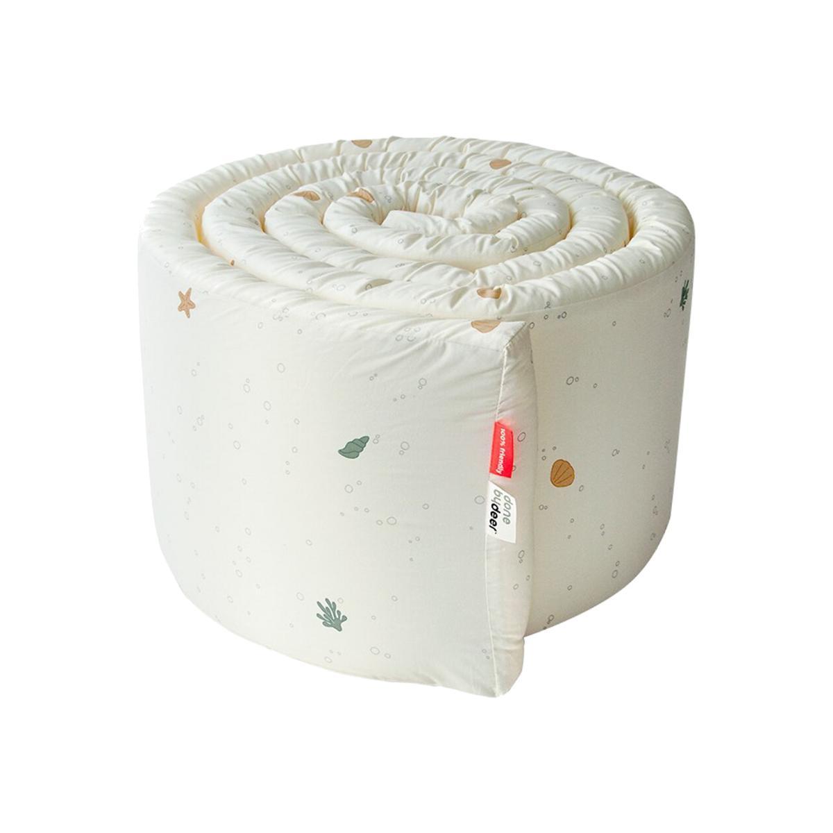 Product details. Make a comfortable and secure bed with a cosy cot bumper. This heavy-duty cot bumper is designed to fit a 60 x 120cm bed, but the foam is formable and can overlap to fit most cribs. The foam is thick and self-supporting on the sides of the bed. The Done by Deer Sea Friends cot bumper with seashells, coral reefs and starfish has matching linens to complement the cute and neutral ocean inspired theme. The cot bumper has a soft sand beige tone throughout with the elements of ocean life in a mix of mustard and green colours. Fabric content and care advice. Main fabric: 100% cotton. Padding: 100% foam. Please refer to the care instructions on the product label. Fabrics: Cover: 100% organic cotton with hidden zip. Filling: 100% PU foam. Care Advice: Washable at 40 ° C. Do not tumble dry. Do not dry clean. Max shrinkage: 2%.Oeko-Tex certified. Fits standard 60 x 120cm baby cots. Size: 350 x 26 x 4 cm.