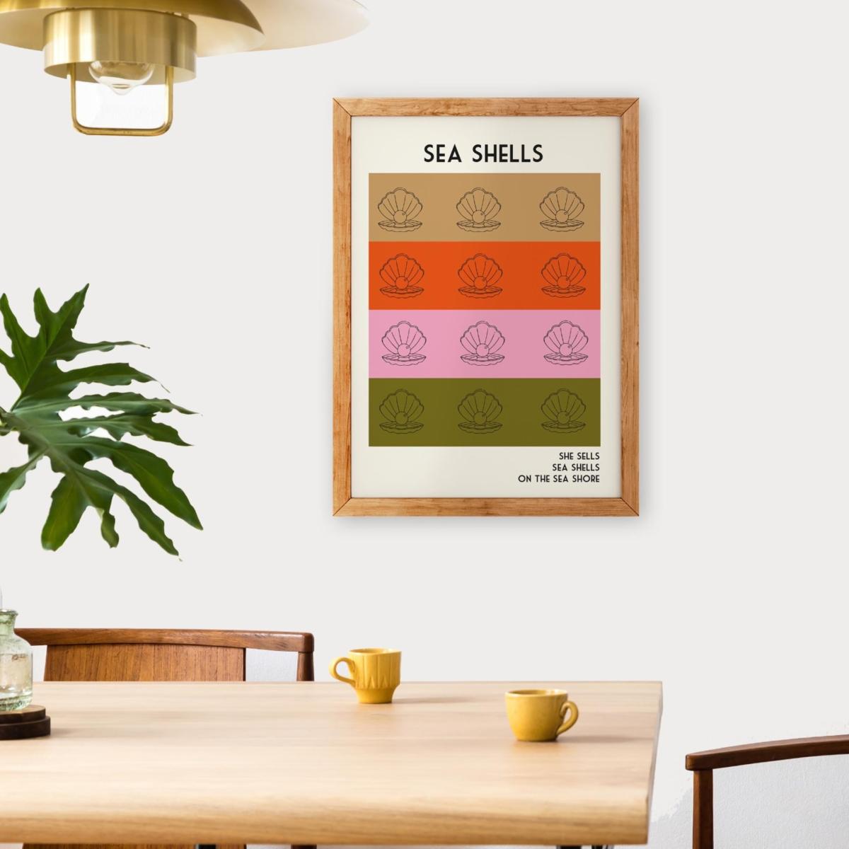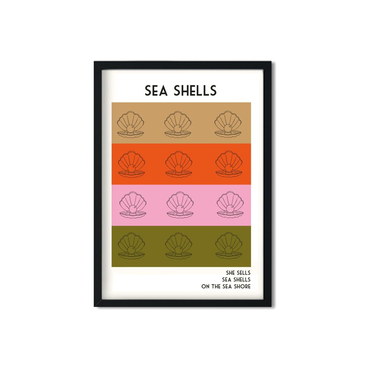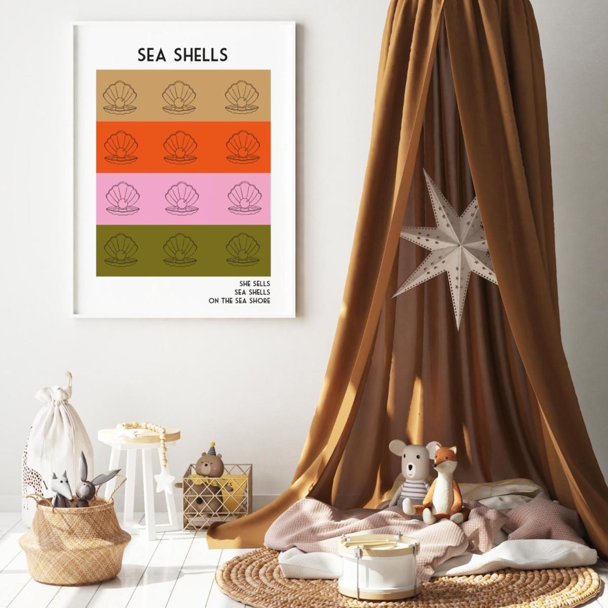 Add a playful nostalgia to your walls with our Sea shells art print. Inspired by the retro tongue twister (She sells sea shells on the sea shore). Taking influence from 1960s book covers and coastal posters, this print would go perfectly in any mid century style bathroom, paired with gold accents and a playful rug adding some beach side nostalgia to your space, or would look oh so lovely in your nursery surrounded by books and family photos. The retro colour palette will add some some retro seaside soul to any wall. Giclée printed on Munken pure smooth cream paper which is certified by the Rainforest Alliance Program for FSC® Standards.