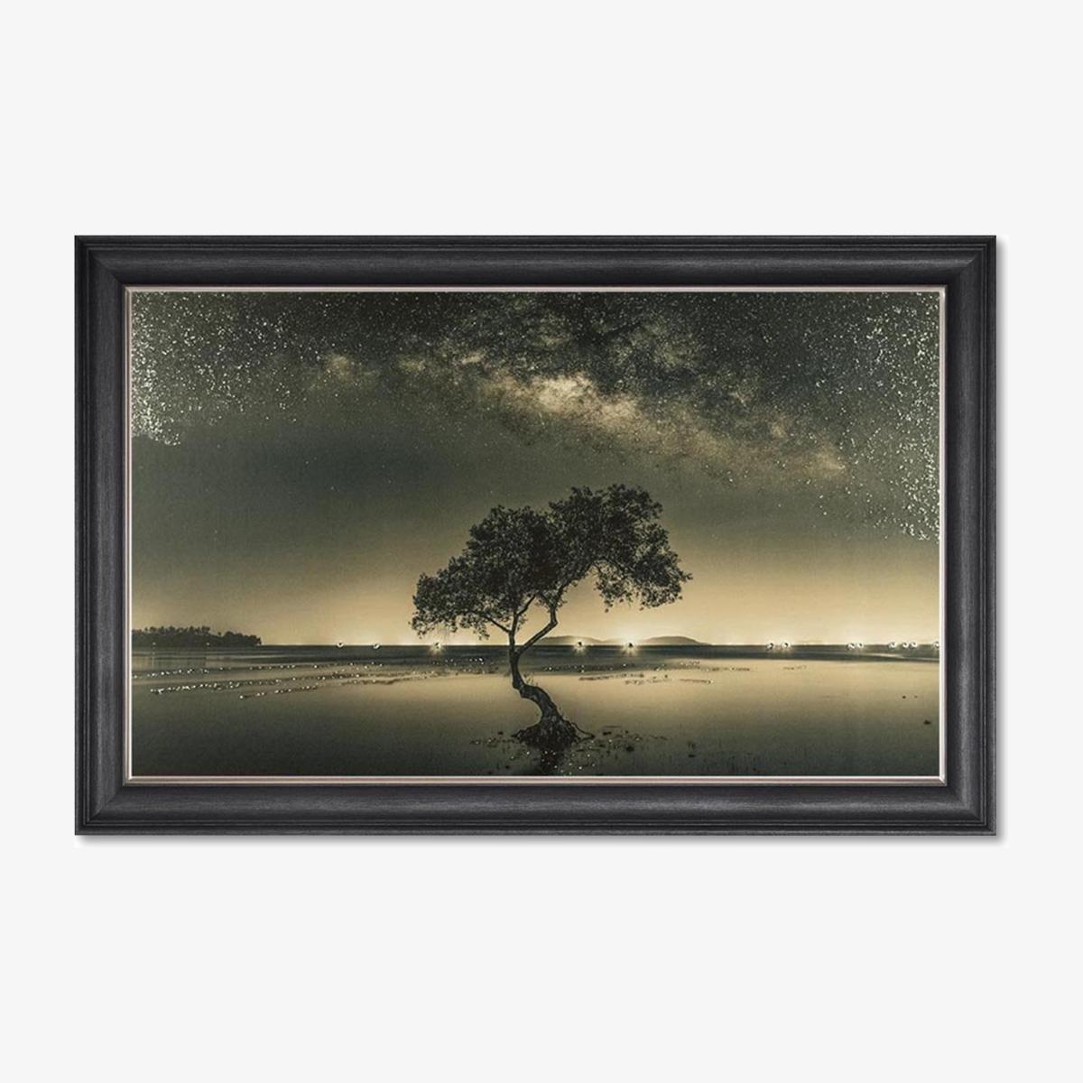 A truly beautiful piece depicting a solitary tree under a star-filled sky. Handmade in the UK, this artwork is a must for both traditional and contemporary interiors. Why you'll love it Evocative artwork of a tree under a starlit sky. Stunning composition that suits any decor scheme. Housed in an elegant black frame. Hand embellished liquid art. Handmade in the UK. This framed picture is part of the Furniture Village home accessories collection. What you need to know Supplied with a metal hanging fitting and nylon cord. Do not hang with string or wire. Indoor use only. Dimensions Height: 75 cm (30 in). Depth: 5 cm (2 in). Width: 115 cm (46 in).
