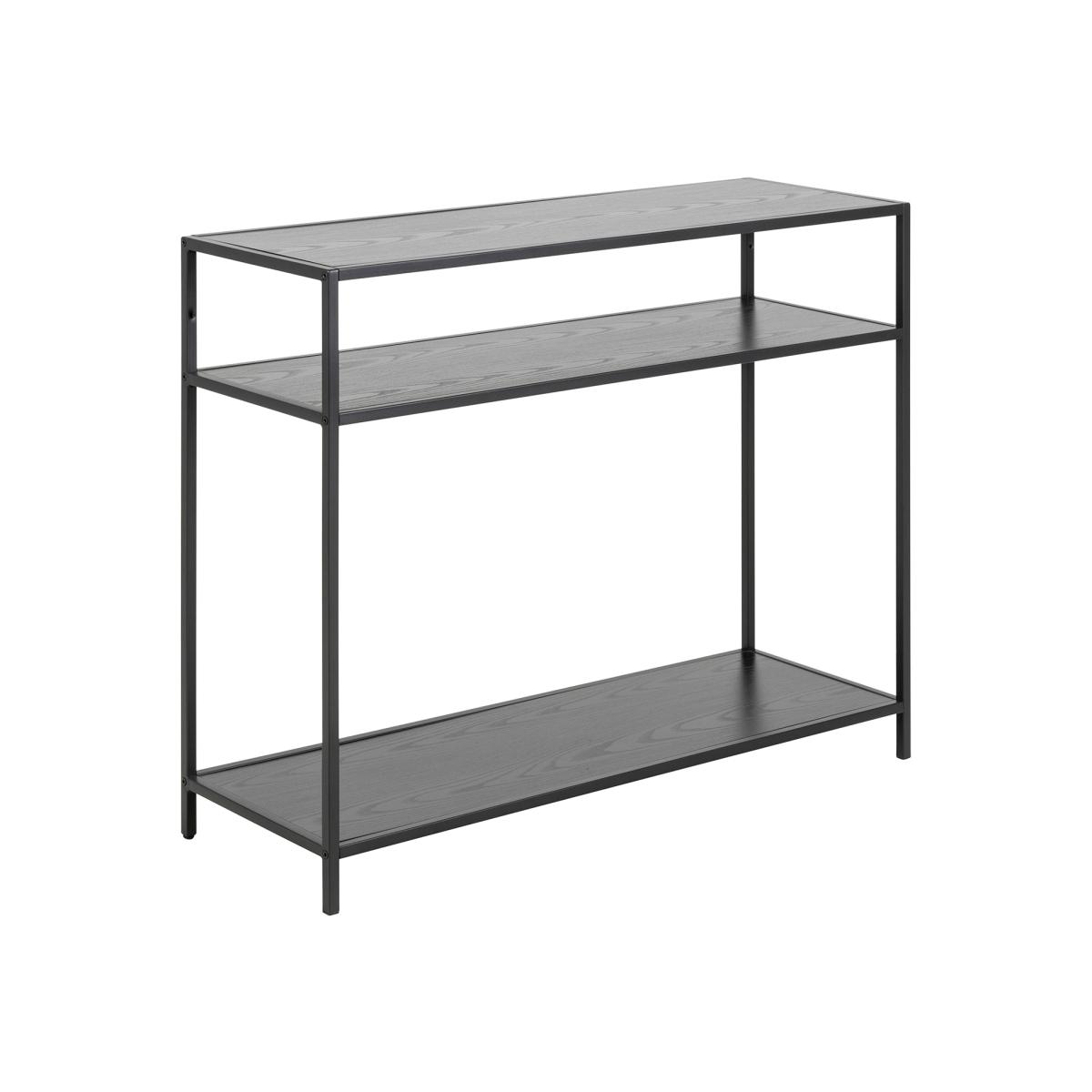 Transform your home decor with the Seaford Console Table. It's designed with a sleek black steel base and wood-effect design to create a striking look that's sure to elevate your space's style effortlessly. This console table features a spacious tabletop and shelf where you can store various personal belongings or style your favourite photos and decorations to adorn your living room or entryway.