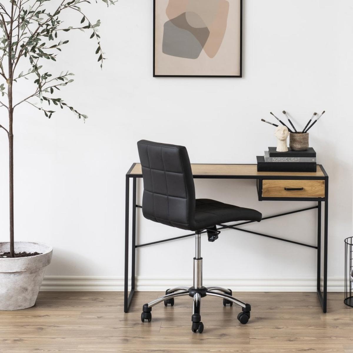I love this desk for its sleek, modern look that combines natural oak with striking black accents, making it versatile for a range of interiors. It works particularly well in contemporary, industrial, or minimalist schemes, adding a touch of warmth without overpowering the space. Practical styling tips include pairing it with ergonomic accessories and a simple desk lamp to maintain clean lines. To create visual interest, consider styling with a small desk organiser, a potted plant, or a framed print nearby. Its compact size and understated design make it perfect for home offices or bedrooms, where functionality and style are equally important.