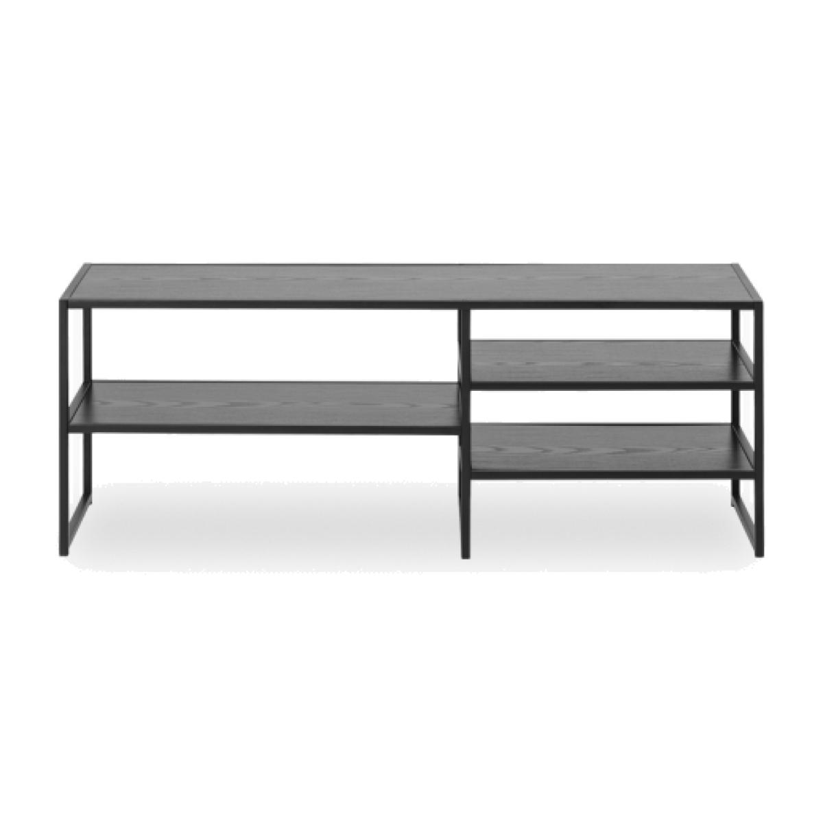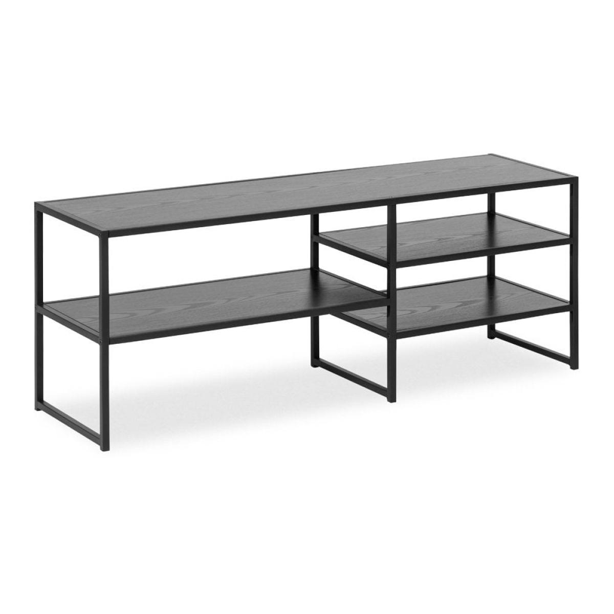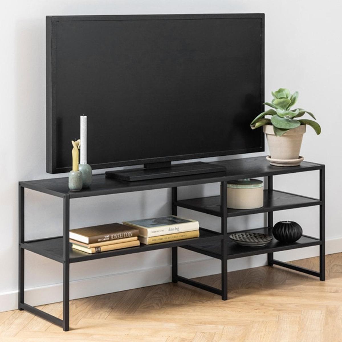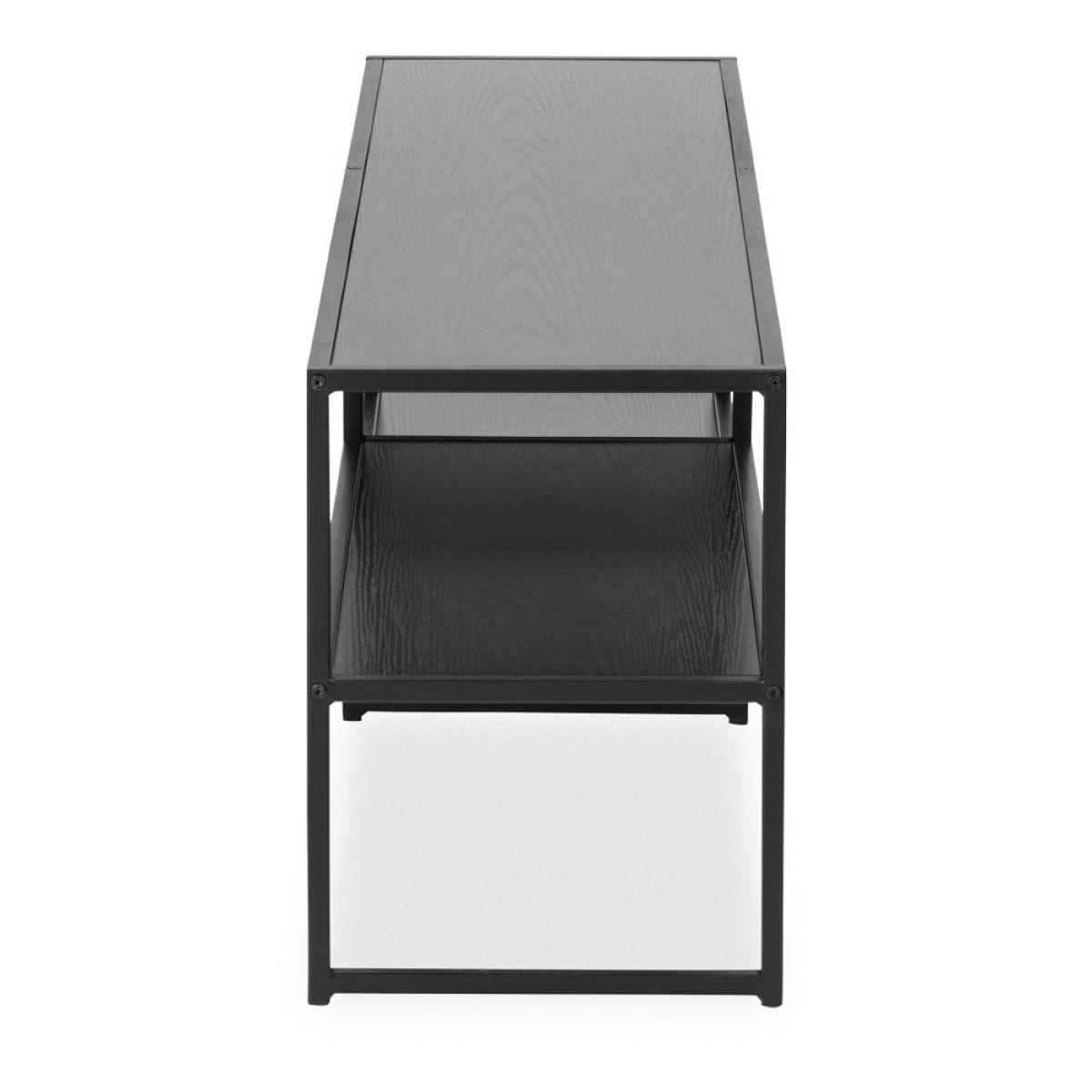 I love this black TV stand for its sleek, minimalist look that easily adapts to various interior styles, from modern to industrial. Its open design offers practical storage, making it perfect for displaying media equipment or decorative accessories without feeling bulky. To style it effectively, consider pairing it with monochrome or neutral tones to create a chic, understated vibe, or add textured accessories like woven baskets or plants to soften the look. It works particularly well in open-plan living spaces or rooms with contemporary decor, providing both function and simplicity. For a polished finish, keep the surface clutter-free and layer with a few choice decorative pieces or books to establish visual interest.