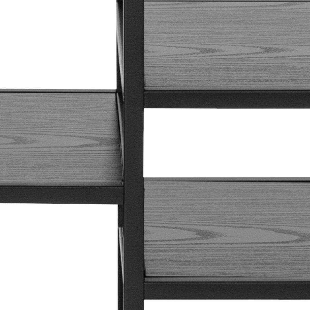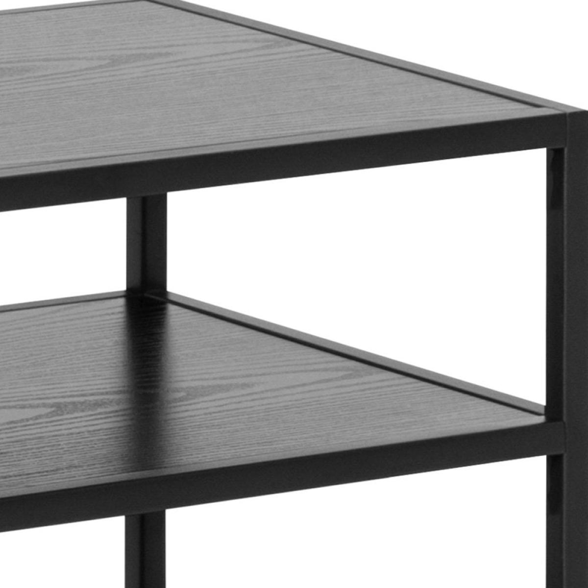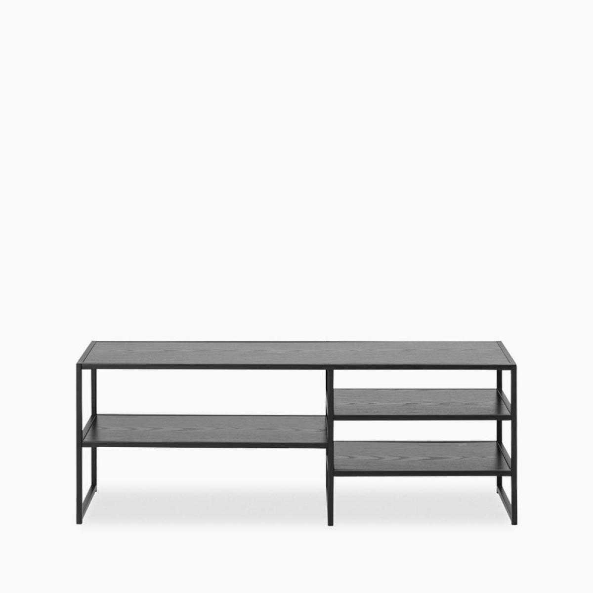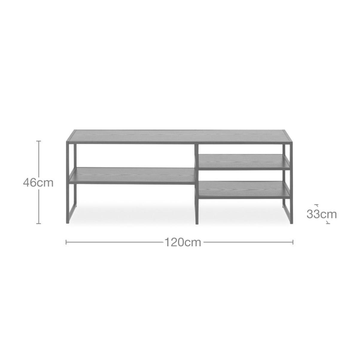 I love this black TV stand for its sleek, minimalist look that easily adapts to various interior styles, from modern to industrial. Its open design offers practical storage, making it perfect for displaying media equipment or decorative accessories without feeling bulky. To style it effectively, consider pairing it with monochrome or neutral tones to create a chic, understated vibe, or add textured accessories like woven baskets or plants to soften the look. It works particularly well in open-plan living spaces or rooms with contemporary decor, providing both function and simplicity. For a polished finish, keep the surface clutter-free and layer with a few choice decorative pieces or books to establish visual interest.
