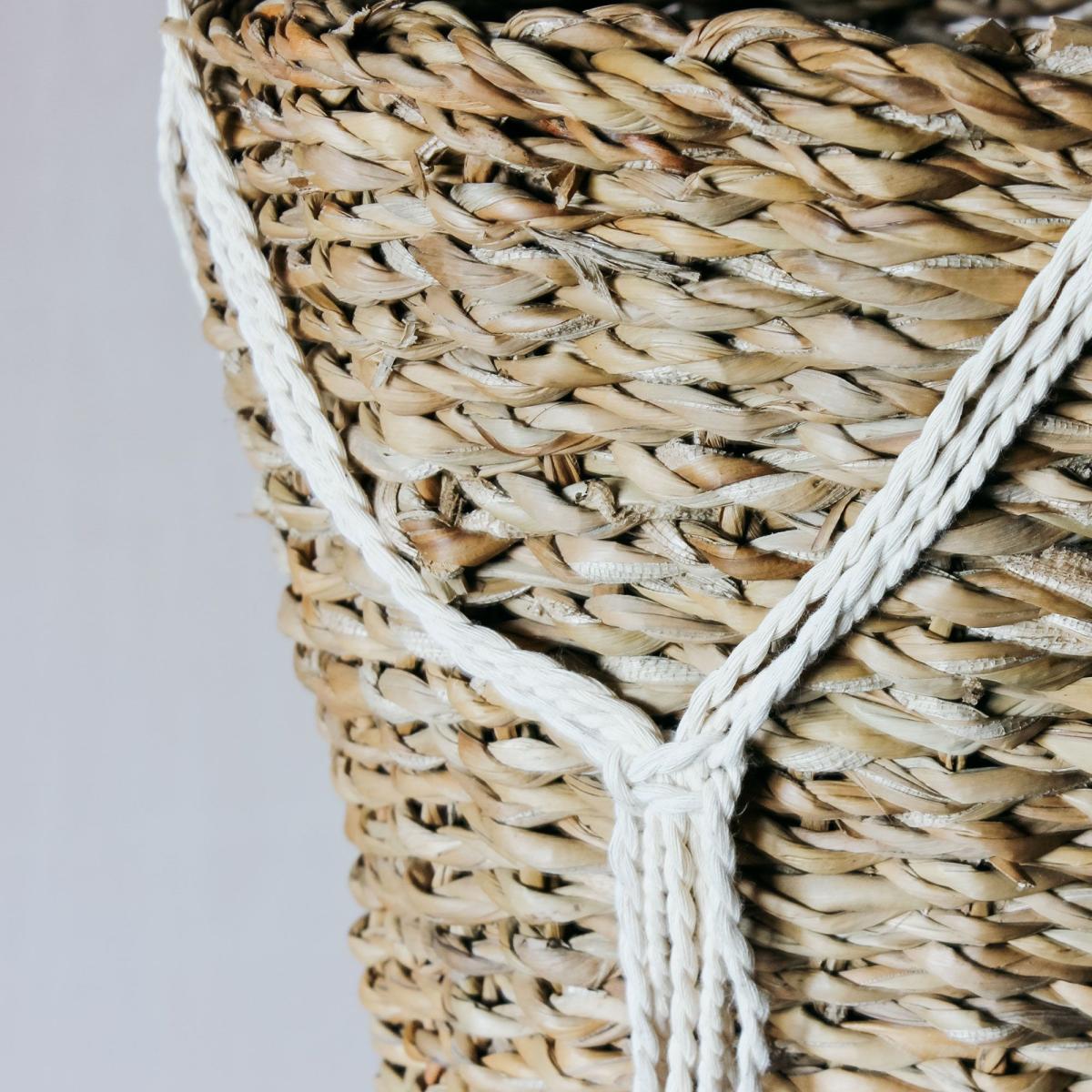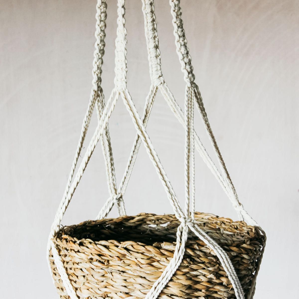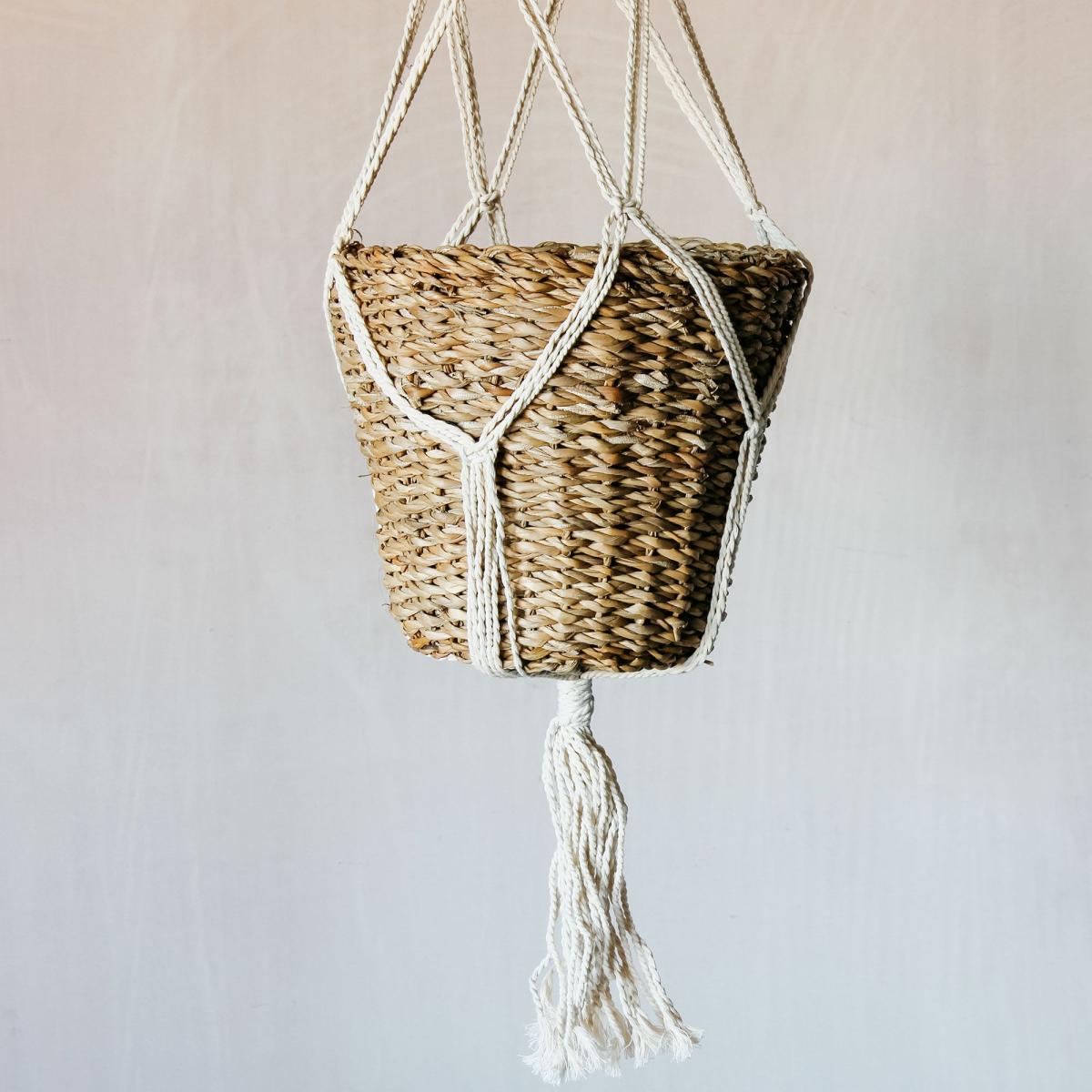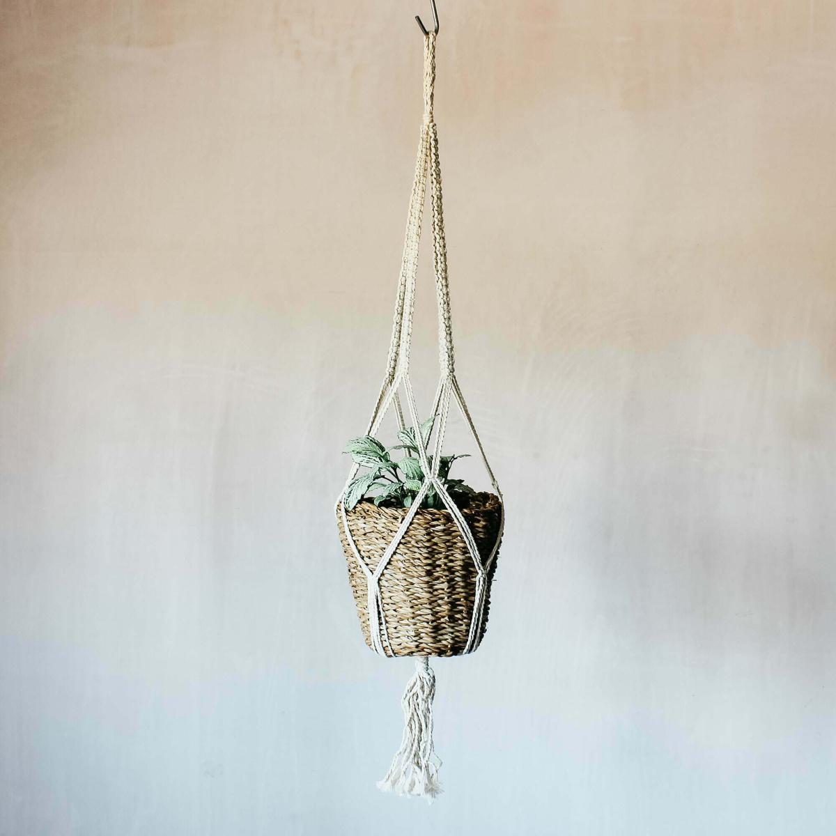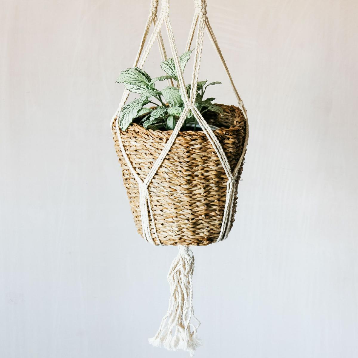 A bohemian accessory for your plant collection, this woven planter hangs within a macrame style design.