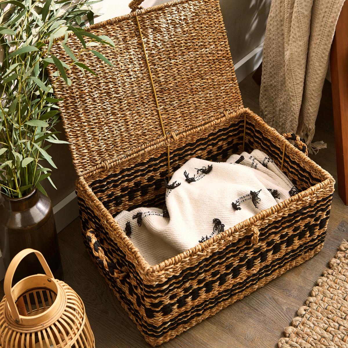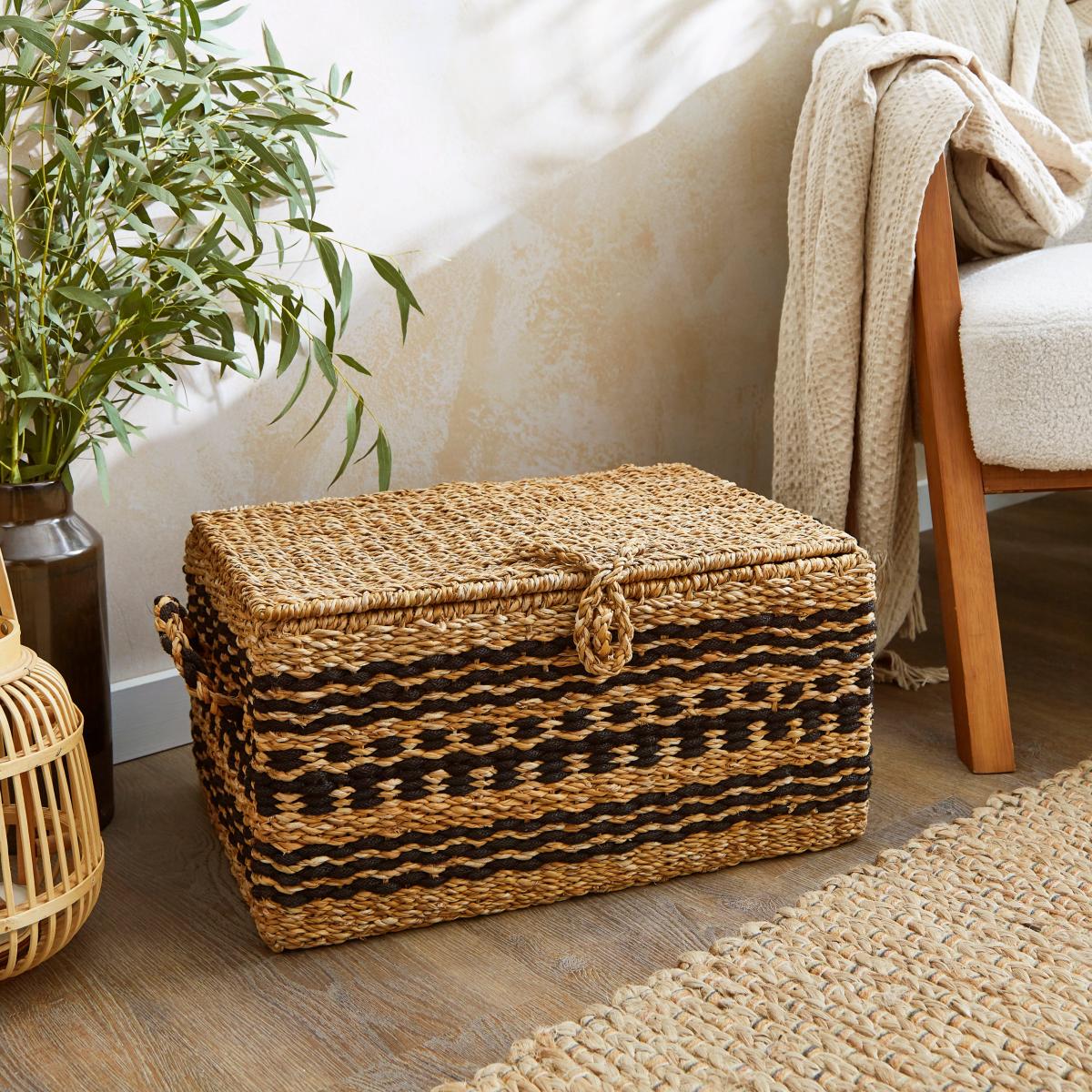 * Storage Trunk* Rectangular Shaped* Generous capacity* Handles for extra convenience* Handmade Elevate your storage game with this beautiful, large storage trunk. Its large capacity makes it perfect for organising various items, and the convenient handles add an extra layer of functionality. Handmade with care, this woven basket features a natural composition of sea grass, complemented by boho inspired patterned details in jute.