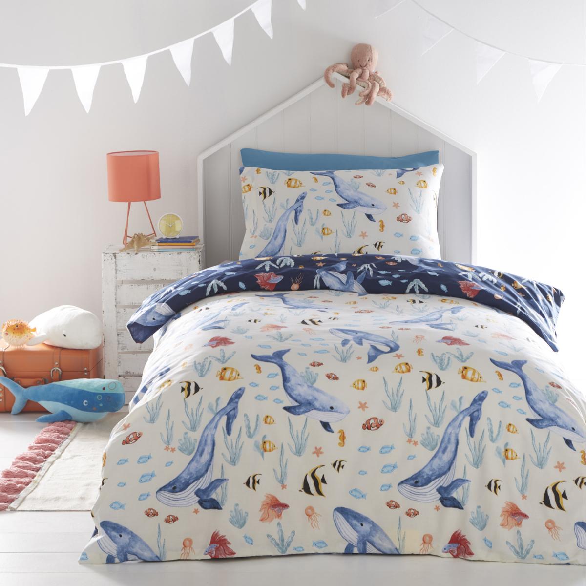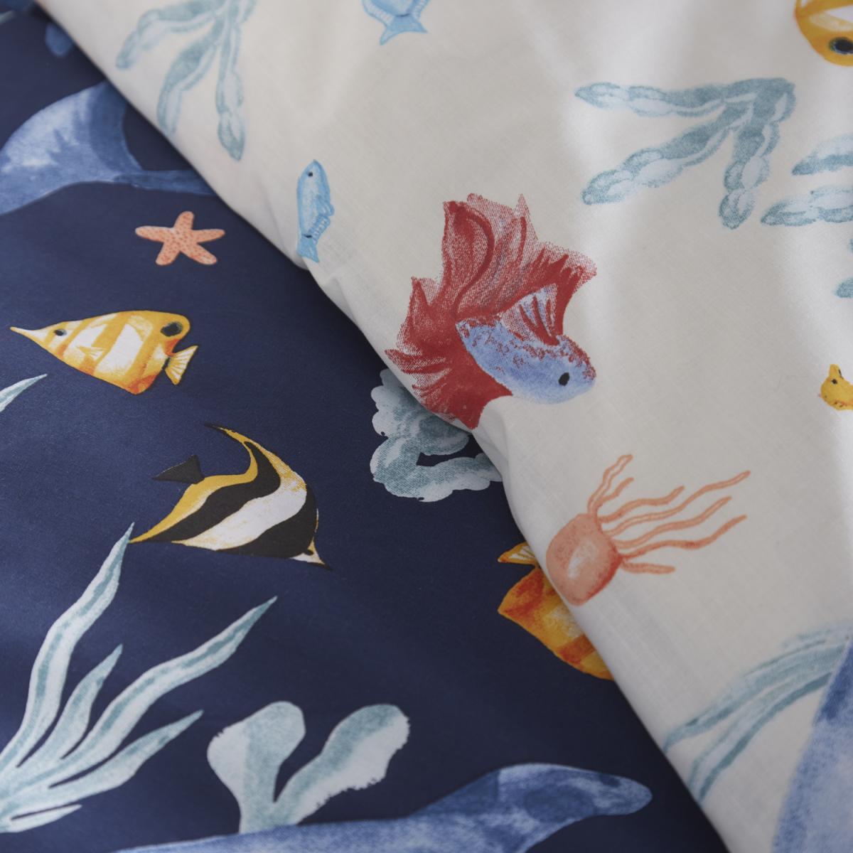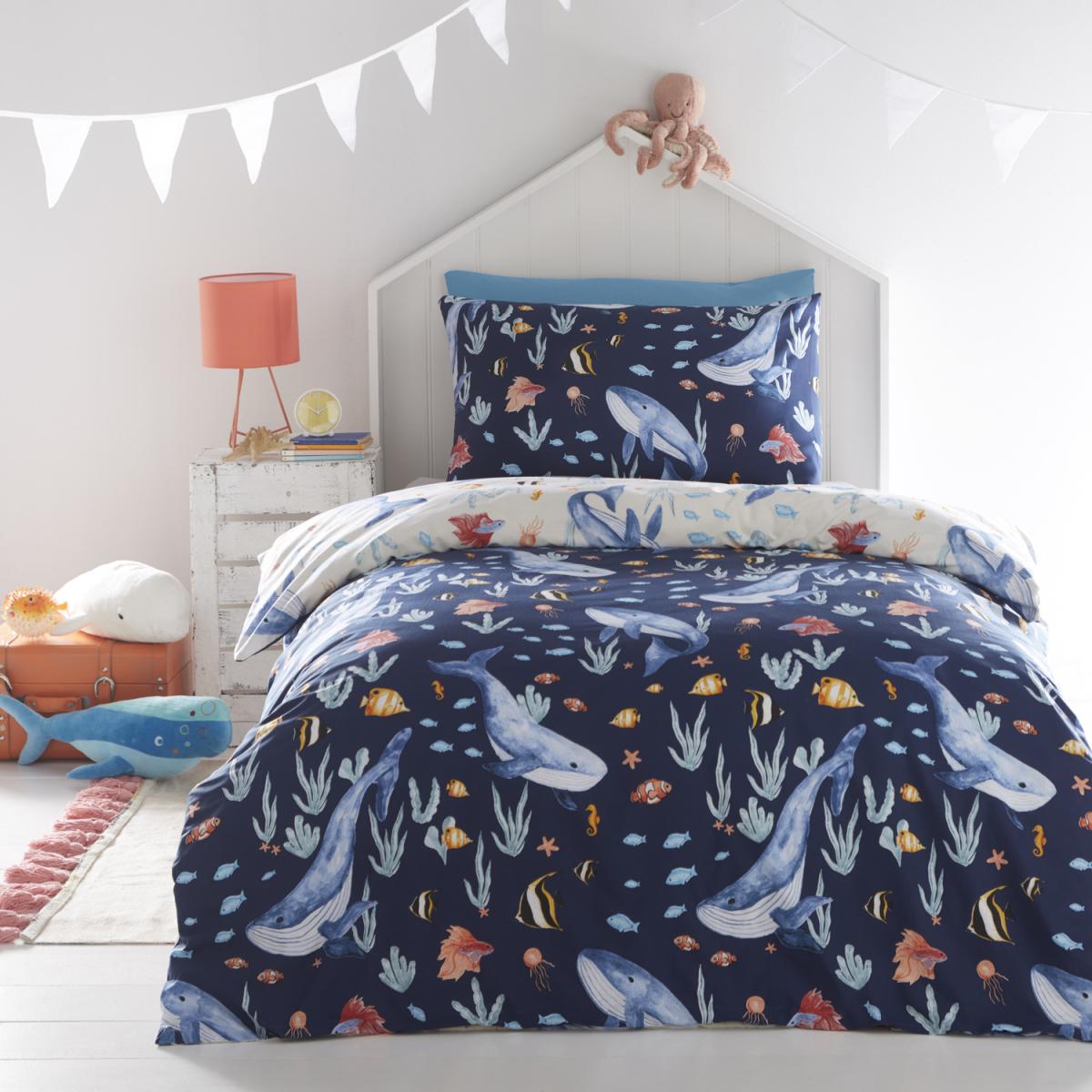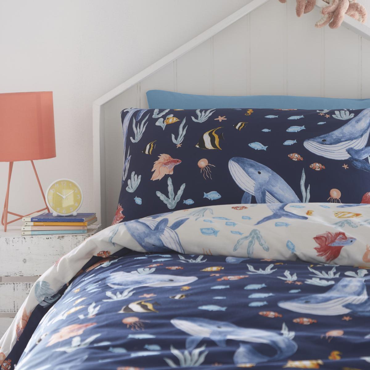 Explore the depths of the deep blue sea with friendly whales, colourful clownfish, seahorses and much more! This kids club design is truly reversible, with a navy front and cream reverse to pick from or even swap over from night to day.