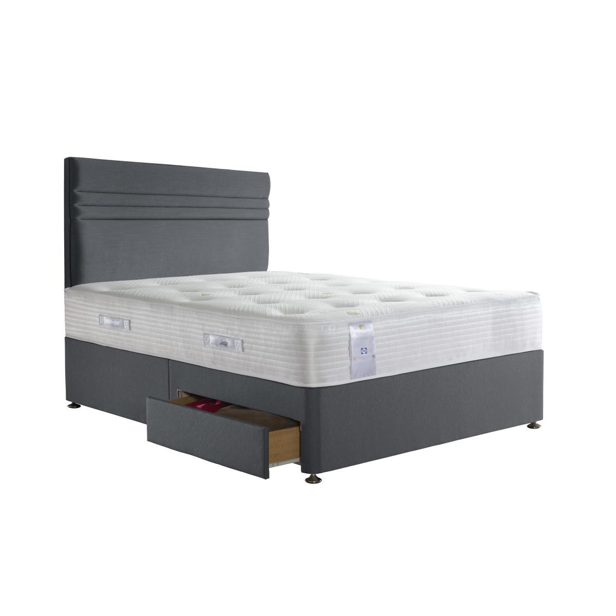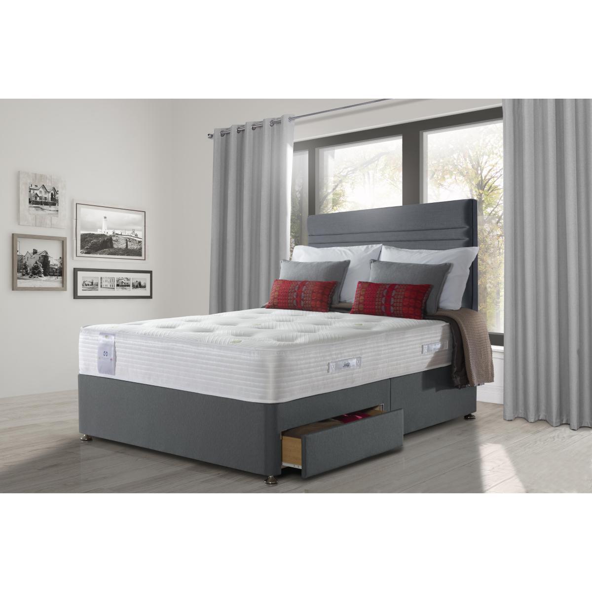 Combining revitalising gel with a superior pocket spring system and edge to edge to support, the mattresses in the Sealy Activsleep Geltex Pocket collection promise superb comfort for those who prefer a softer feel. Paired with stylish platform-top divan bases upholstered in a choice of fabric colours and offering optional storage drawers, pocket spring mattresses incorporate Geltex, a unique breathable gel-infused foam that’s designed to relieve pressure while adding welcome softness. They’re also a great choice for allergy sufferers as the soft knitted covers are infused with Purotex®, which releases friendly bacteria to combat dust mites and other allergens, and Adaptive®, which quickly evaporates moisture for cooler and drier sleeping comfort. Handcrafted and British made, the Sealy Activsleep Geltex Pocket range is a Furniture Village online exclusive and is part of the Sealy Activsleep collection which promotes a healthier lifestyle through energising sleep. Headboard is an optional extra. With its upholstered divan base and layers of mattress comfort, the Sealy Activsleep Geltex Pocket Firm 1400 divan set offers stylish good looks as well as superb comfort. The upholstered platform-top divan base is offered in a choice of colours and with a range of useful optional storage drawer configurations. The accompanying medium firmness mattress, handcrafted in Britain, is 26 cm deep and has 1400 pocket springs in king size layered with breathable and pressure-relieving Geltex, and ultra-comfortable 7 zone foam. Springs are encased in Unirail for edge to edge support. It’s hypoallergenic too – the cover contains dust mite-banishing Purotex® and Adaptive® textile technology, which moves moisture away for a cooler, drier sleeping environment. The Sealy Activsleep Geltex Pocket Firm 1400 divan set is a Furniture Village online exclusive and is part of the Sealy Activsleep Geltex Pocket Firm range of mattresses and divan sets. Product images are representative. Find out more. Did you know?. The mattress should be aired for four hours after delivery to freshen and remove any aroma from storage. It may take time for your mattress to attain its full size once the springs have settled to the correct position. This is due to the mattress being upright during transit. Settlement of fillings and indentations caused by body weight compressing the fillings are natural and not considered defects. This can be minimised by regular rotating (unless yours is a dual tension mattress).