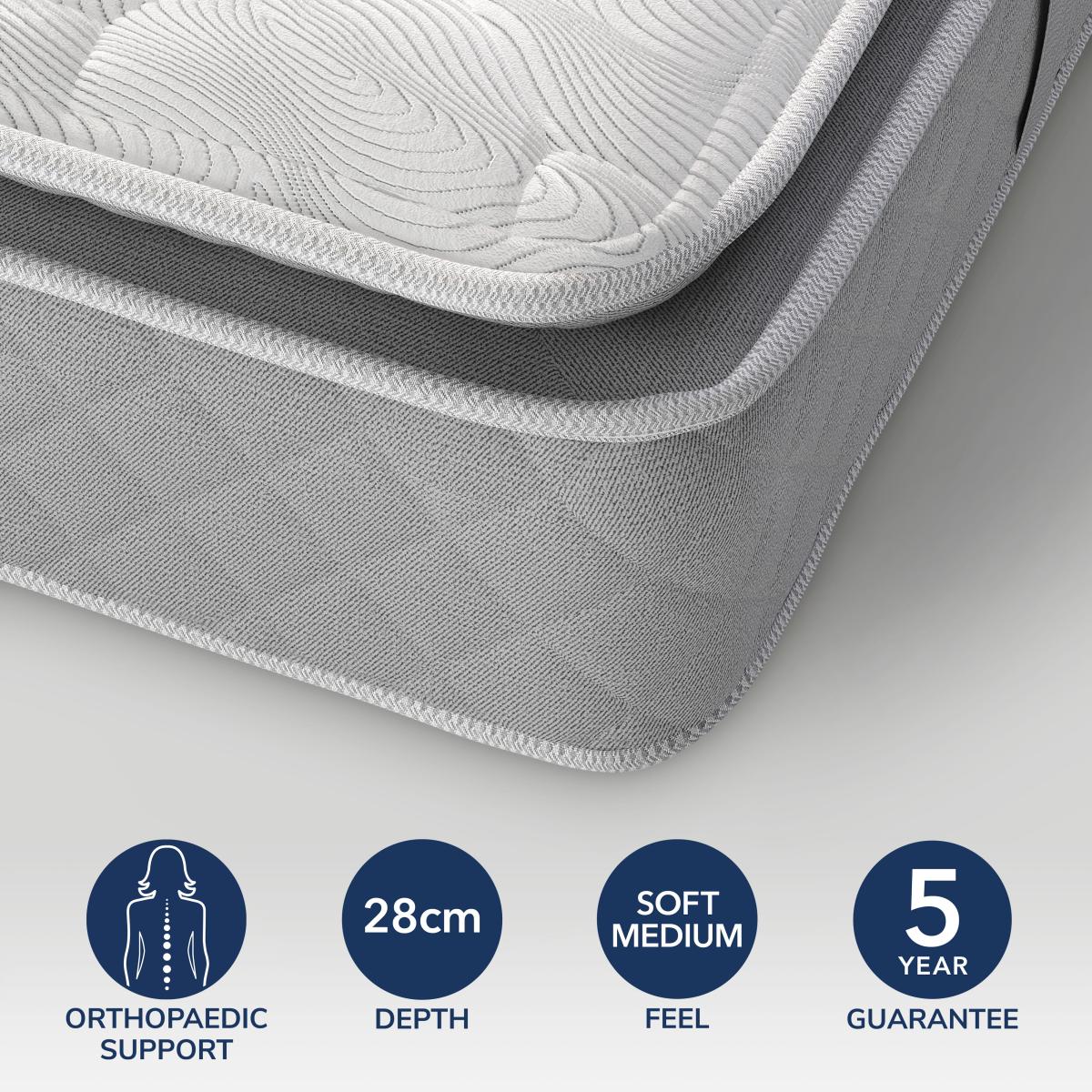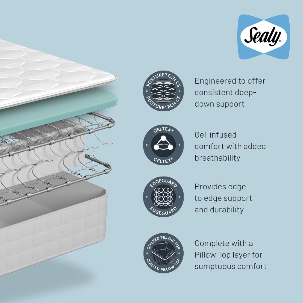 * Soft to medium feel* Orthopaedic support* Posture Tech spring system* Gel top* Edge to edge support Fans of soft to medium feel mattresses will love this sumptuously soft gel topped mattress from Sealy. The Posture Tech spring system is designed to provide long lasting support, with each spring reacting to individual shape and movement and applying support where it’s needed the most. The edge support extends the sleeping area and provides additional durability. The top is finished with carefully selected fabrics, designed to offer a luxuriously soft feel. This mattress is handmade in Britain and comes with a 5-year guarantee.
