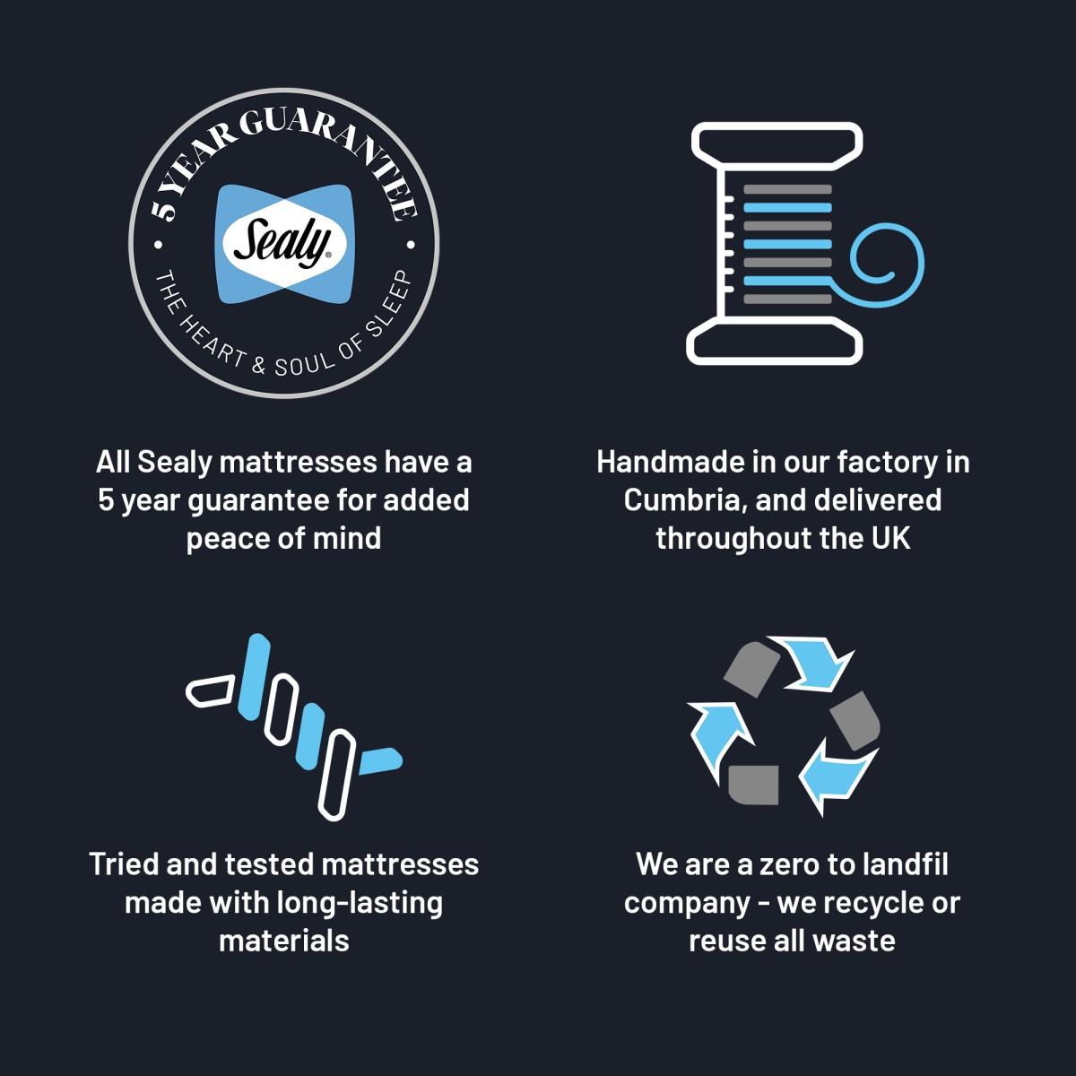 * Soft to medium feel* Edge sprung* Orthopaedic support* Posture Tech Core Support spring system* 1400 mini pockets for extra comfort* Moisture wicking top layer* Hypoallergenic – endorsed by Allergy UK This mattress is perfect for people who are looking for a soft to medium mattress with a cocooning, yet supportive feel. The Posture Tech Core Support spring system provides long-lasting support, with springs that get firmer as pressure increases for deep down support and pressure relief. The edge sprung system extends the sleeping area and adds durability. An additional layer of 1400 mini pockets sit alongside the spring unit for added comfort, and a Memory Sense foam layer provides extra comfort where it’s needed the most. It responds to your shape for a cocooning feel, with a layer of medium foam to finish. The top layer is quilted and the Smar Tex fibres are moisture wicking, working to keep you cool as you sleep. This mattress is supported by a 5-year guarantee and is handmade in Britain.
