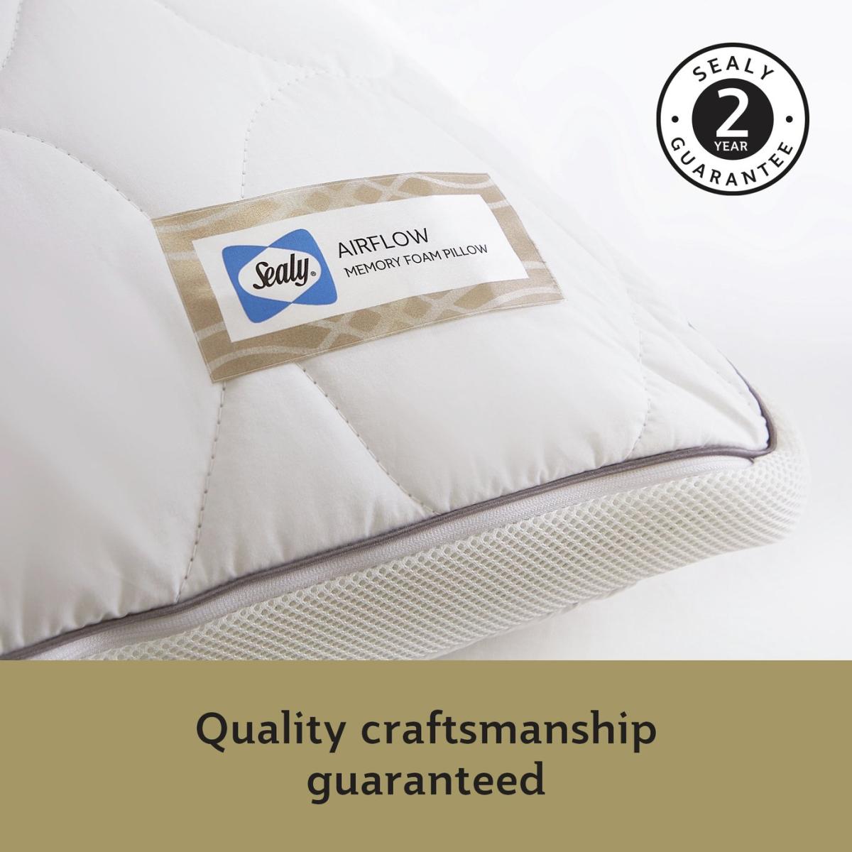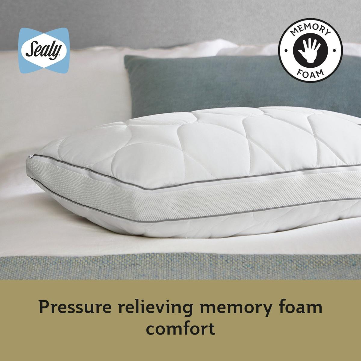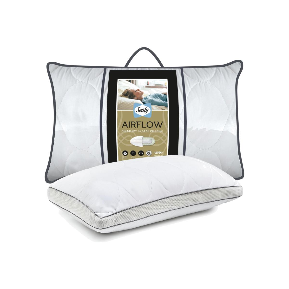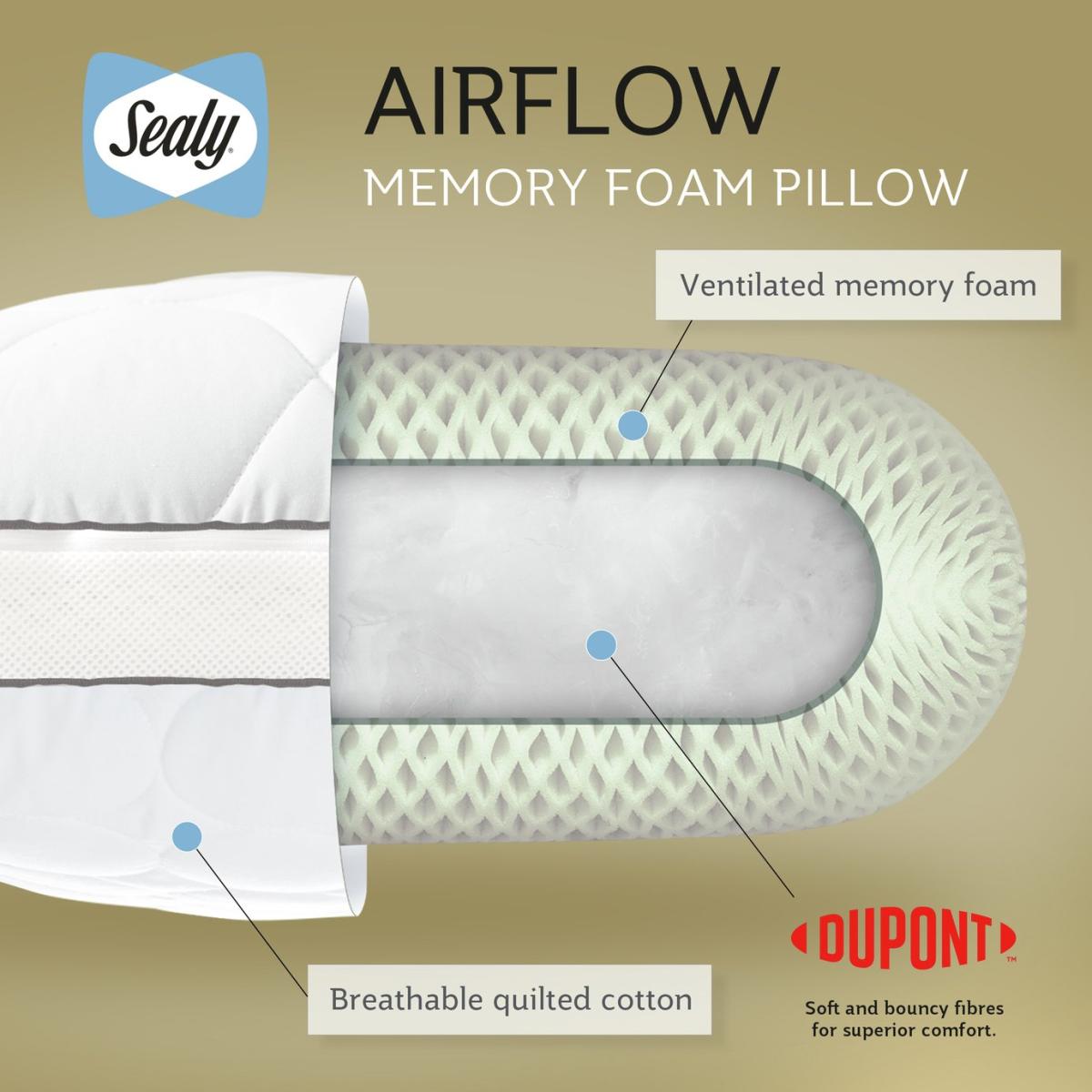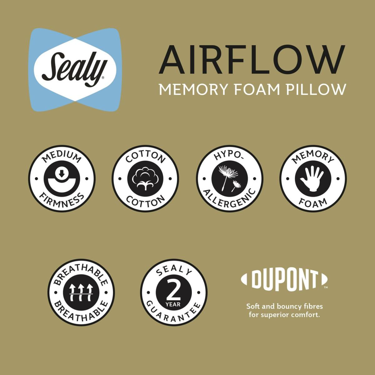 The Sealy Airflow Memory Foam Pillow offers breathability, pressure relief, comfort and support – the very foundation to rejuvenate the body and mind. The innovative ventilated memory foam encourages air flow around the pillow to keep your fresh and comfortable, whilst the memory foam offers responsive pressure relief for optimum comfort. The centre of the pillow is filled with bouncy DuPont™ hollowfibre. The pillow is covered in a smooth cotton which is breathable and naturally cooling. It's even cushioned for a little bit of extra comfort.