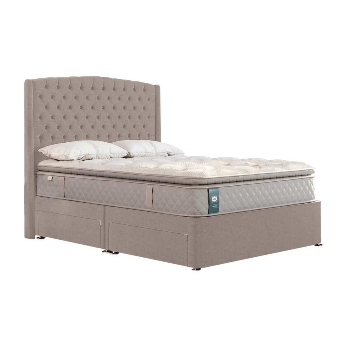 You’ll sleep better with a mattress or divan set from the Sealy Ashton range. Mattresses have 1,000 individually pocketed springs in king size and are layered with Geltex for the perfect combination of support and pressure relief. A sumptuous pillow top adds that all-important luxury feel. Divan bases are beautifully upholstered in a wide selection of colours and come with your choice of optional storage drawers or ottoman storage. Enjoy the reassurance of Sealy’s bed-crafting expertise plus exceptional value pricing. Handmade in the UK, the Sealy Ashton range is a Furniture Village online exclusive. Sleep in style and comfort with this beautiful – and great-value – divan set from Sealy. Handmade in the UK, it comprises a pocket sprung mattress and upholstered divan base with optional storage. Why you'll love it A great-value, stylish and exceptionally comfortable storage divan set by Sealy. Mattress has body-responsive pocket springs for gentle support and to reduce movement. With Geltex for personalised pressure-relieving comfort plus breathability. Sumptuous pillowtop for luxurious comfort. With a beautifully upholstered platform top divan base. In single, double, king and super king sizes. Built-in storage drawers available in double, king and super king sizes. Handmade in the UK. A Furniture Village online exclusive. This divan set is part of the Sealy Ashton range. What you need to know Headboard is an optional extra. Mattress type: Pocket spring. Depth: 32 cm. Firmness: Medium. Springs: 1,000 in king size. Pillow top:Yes. Fillings: Geltex. Cover: Knit fabric. Requires turning: No. Base type: Platform top with optional storage drawers. Sizes: Single, double, king and super king. Mattress care:Air for 4 hours before using to remove any odour. Allow at least 4 hours for springs to settle and for mattress to attain its full size. Indentations caused by settlement of fillings or body weight are normal and are not considered defects. If used on a slatted bed frame, the space between slats must be no wider than 7.5 cm. Spaces wider than this may cause excess dipping of the mattress and invalidate the guarantee. Always use a mattress protector. Rotate regularly. Divan base care: Clean upholstery weekly using a soft brush or vacuum with the curtain attachment. Professional cleaning advised for oil- and grease-based stains. Some fabrics can show wear on areas of more use or in direct sunlight.