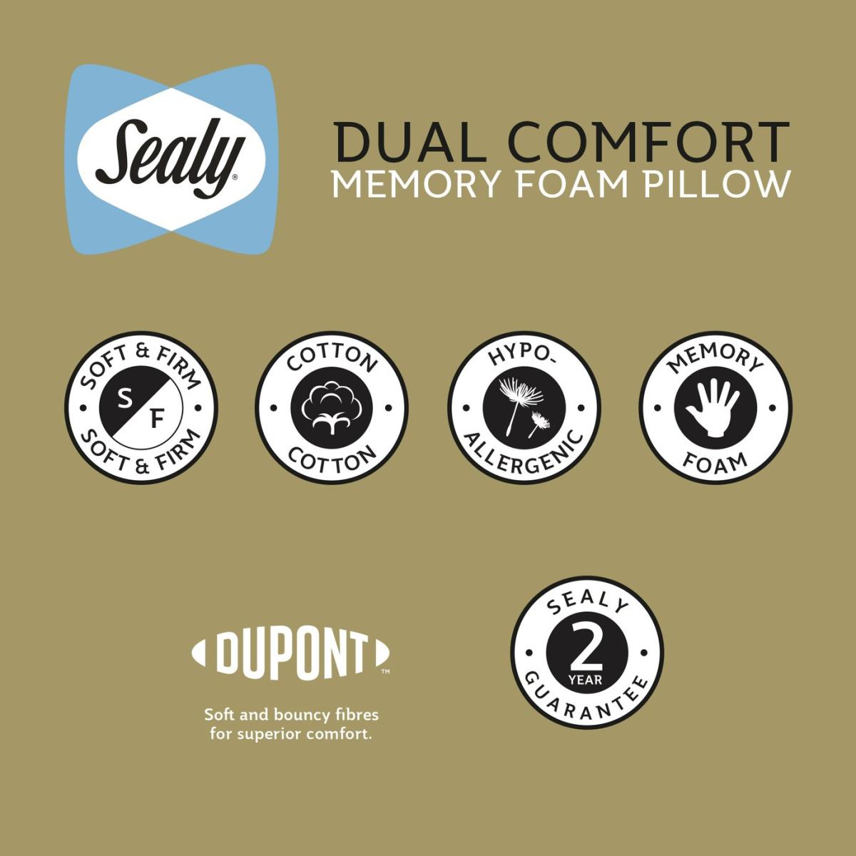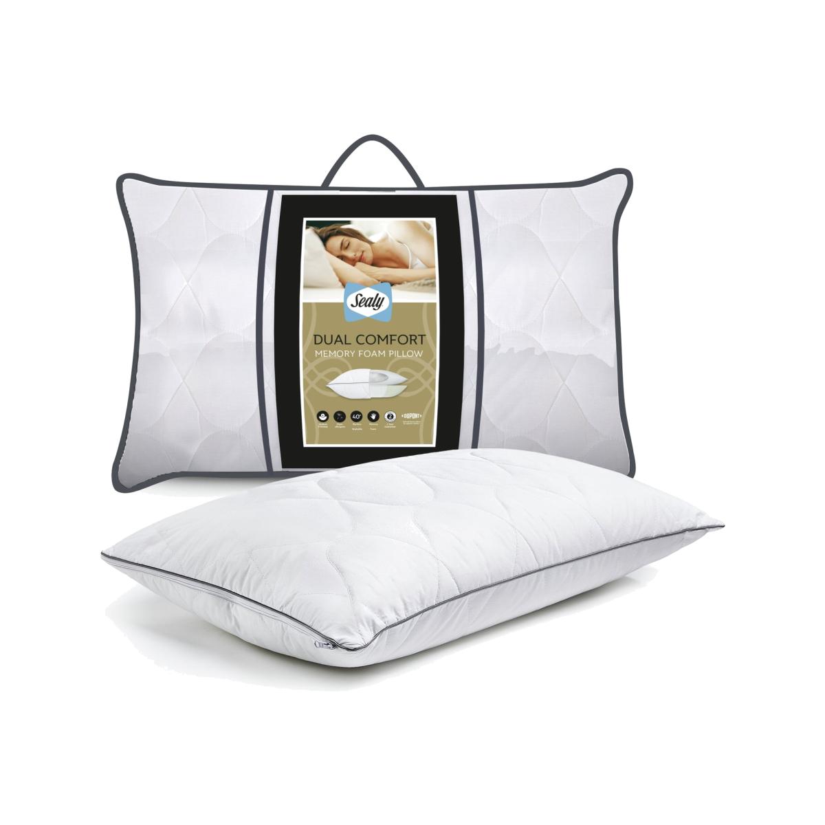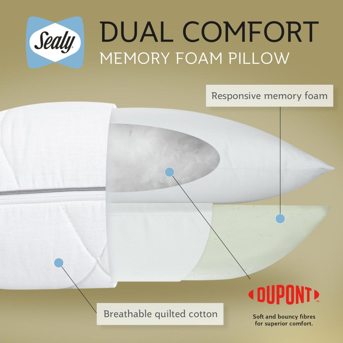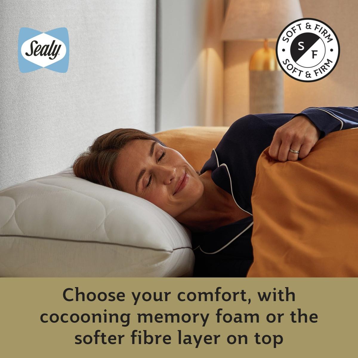 The Sealy Dual Comfort Memory Foam Pillow has been meticulously crafted with a softer side and a firmer side on the reverse so you can choose your comfort. The soft side of the pillow is filled with luxurious DuPont™ hollowfibre which offers a soft, cushioned feel, whilst the reverse features firmer memory foam layer to provide relief and disperse pressure where it is needed most. The pillow is covered in silky smooth cotton which is breathable and naturally cooling. It's even cushioned for a little bit of extra comfort. Sealy is the world's number one bed brand. With a wealth of experience, we are committed to helping everyone enjoy the beauty of quality sleep. Pack quantity: 1. Cover made from 100% cotton. Filling made from 50% cotton and 50% polyester. Memory foam. Medium firm pillow. Suitable for any sleepers. Size L75, W45cm. 0.95kg. Sponge clean only. Suitable for tumble drying.