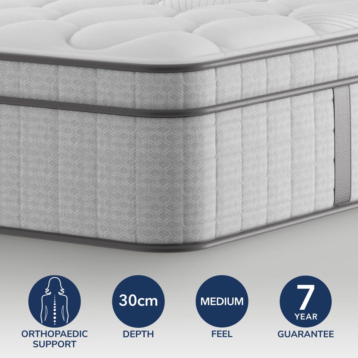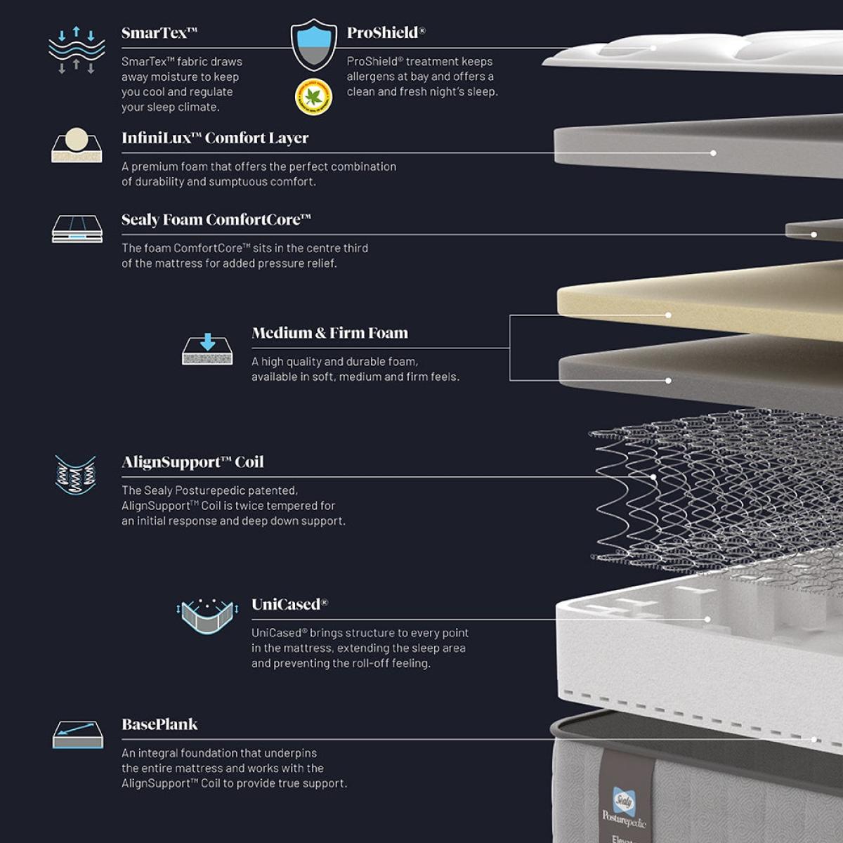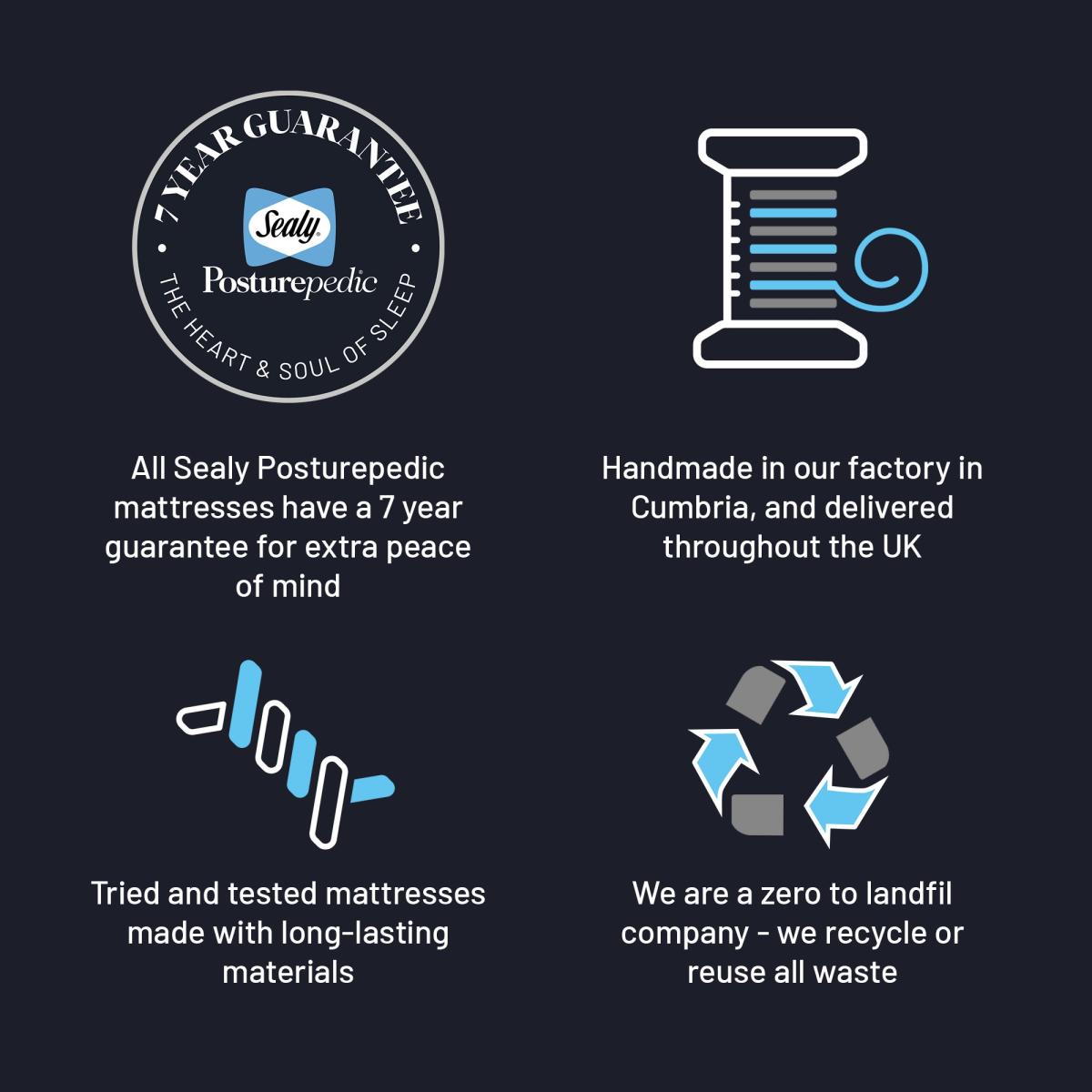 * Alignsupport coil system* Posturepedic technology* Edge to edge stability* Medium feel* Hypoallergenic – endorsed by Allergy UK* Temperature regulating Sealy Posturepedic technology works in two stages to bring ultimate comfort and support while you sleep. The Alignsupport coil senses your body’s shape and responds to provide unique support to maintain your natural posture and evenly distribute your body’s weight. The patented Uni Cased XT structure system provides edge to edge support, preventing that ‘rolling off’ feeling towards the edge of the mattress, allowing you a more stable and larger sleeping surface. Comfort Core is in the centre third of the mattress for ultimate hip and back pressure relief, and a combination of medium and soft foams provide an in-between medium feel – not too firm but not too soft. The mattress is finished with Infini Lux™ premium foam for resilient, long-lasting comfort. Sealy are on a mission to create mattresses that last, so this comes with a 7-year guarantee and is handmade in Britain.