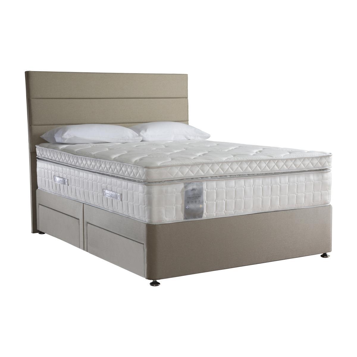 Relax in sumptuous comfort with the Sealy Latex Box Top 2800 collection. This handcrafted range includes a superb 36 cm soft-feel mattress with luxurious box top, edge to edge support and 2800 springs in king size – 1400 pocket springs and 1400 mini springs. Layers of body-responsive and anti-bacterial latex plus Allergy-UK endorsed Sealy Smart Fibres ensure that this wonderful mattress is entirely hypoallergenic. Pair it with a beautifully upholstered platform top divan base, choosing one of several optional storage drawer configurations or, if you need extra room, an end lift ottoman compartment. The Sealy Latex Box Top 2800 range is beautifully made in Britain and exclusively available at Furniture Village. Headboard is an optional extra. With its wonderfully deep mattress and stylish base, the handcrafted Sealy Latex Box Top 2800 divan set is the kind of bed you may never want to leave. This sumptuous bed comprises a soft-feel 36 cm mattress with box top, plus 2800 pocket springs in king size, including 1400 mini springs, arranged in zones to help relieve pressure and improve posture. Springs are encased in Unirail for edge to edge support. Layers of anti-bacterial, body-contouring latex plus Sealy Smart Fibres, endorsed by Allergy UK, help keep you cool while banishing dust mites. Finished with a knitted cover, this luxurious mattress rests on a traditional platform top base upholstered in a selection of fabrics. Choose from a range of useful storage drawer configurations. Exclusively available at Furniture Village, the British-made hypoallergenic Sealy Latex Box Top 2800 divan set is part of the Sealy Latex Box Top 2800 range. Product images are representative. Find out more. Please note. The mattress should be aired for four hours after delivery to freshen and remove any aroma from storage. It may take time for your mattress to attain its full size once the springs have settled to the correct position. This is due to the mattress being upright during transit. Settlement of fillings and indentations caused by body weight compressing the fillings are natural and not considered defects. This can be minimised by regular rotating. Top Tip. To keep your fabric divan base looking good, use a soft brush or vacuum with the curtain attachment weekly. Ideally clean professionally annually. Some fabrics can show wear on areas of more use or in direct sunlight.