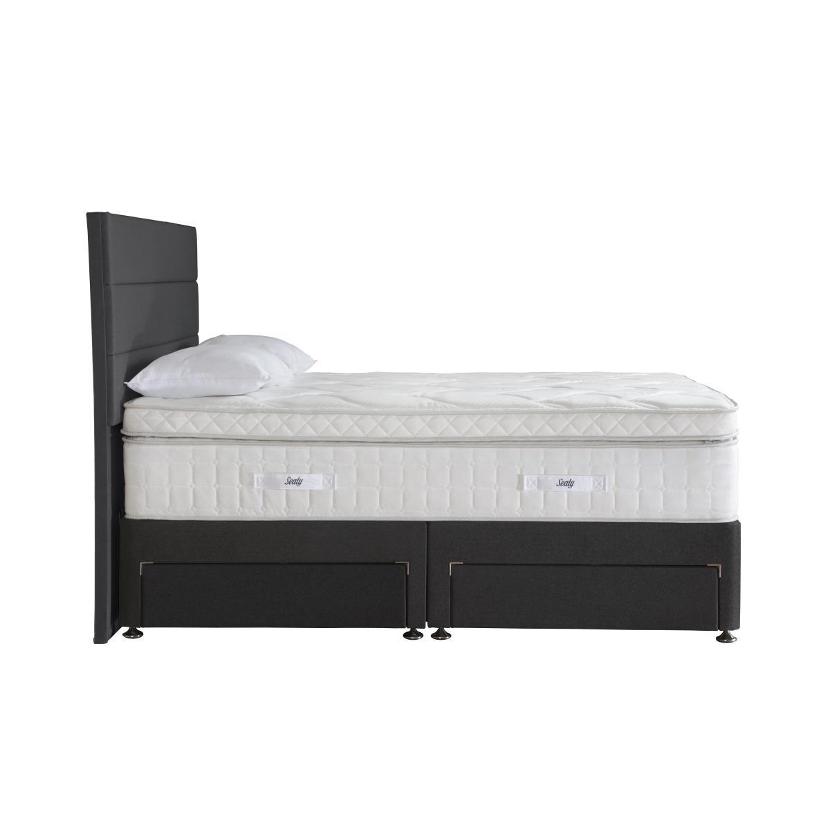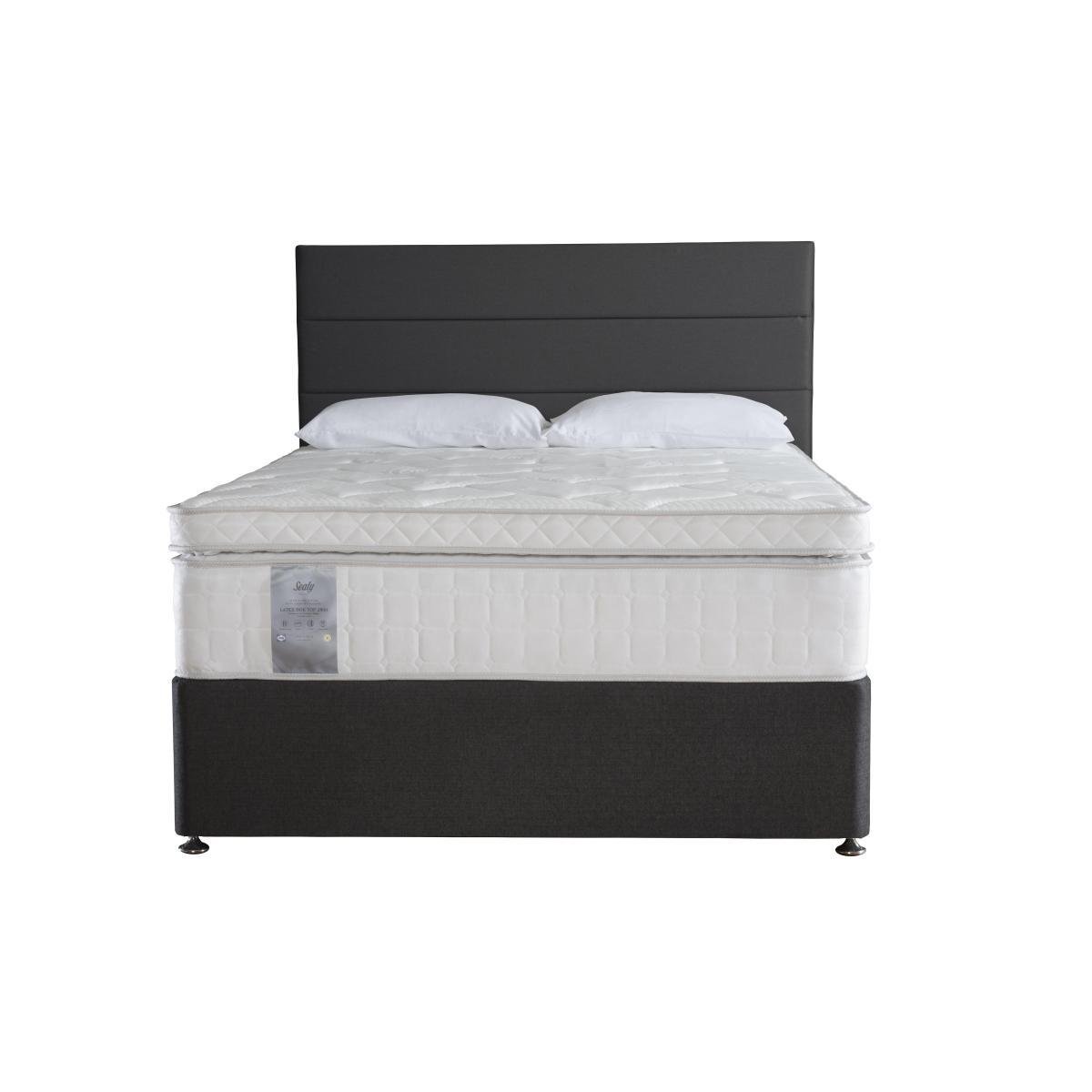 Relax in sumptuous comfort with the Sealy Latex Box Top 2800 collection. This handcrafted range includes a superb 36 cm soft-feel mattress with luxurious box top, edge to edge support and 2800 springs in king size – 1400 pocket springs and 1400 mini springs. Layers of body-responsive and anti-bacterial latex plus Allergy-UK endorsed Sealy Smart Fibres ensure that this wonderful mattress is entirely hypoallergenic. Pair it with a beautifully upholstered platform top divan base, choosing one of several optional storage drawer configurations or, if you need extra room, an end lift ottoman compartment. The Sealy Latex Box Top 2800 range is beautifully made in Britain and exclusively available at Furniture Village. Headboard is an optional extra. With its wonderfully deep mattress and stylish base, the handcrafted Sealy Latex Box Top 2800 divan set is the kind of bed you may never want to leave. This sumptuous bed comprises a soft-feel 36 cm mattress with box top, plus 2800 pocket springs in king size, including 1400 mini springs, arranged in zones to help relieve pressure and improve posture. Springs are encased in Unirail for edge to edge support. Layers of anti-bacterial, body-contouring latex plus Sealy Smart Fibres, endorsed by Allergy UK, help keep you cool while banishing dust mites. Finished with a knitted cover, this luxurious mattress rests on a traditional platform top base upholstered in a selection of fabrics. Choose from a range of useful storage drawer configurations. Exclusively available at Furniture Village, the British-made hypoallergenic Sealy Latex Box Top 2800 divan set is part of the Sealy Latex Box Top 2800 range. Product images are representative. Find out more. Please note. The mattress should be aired for four hours after delivery to freshen and remove any aroma from storage. It may take time for your mattress to attain its full size once the springs have settled to the correct position. This is due to the mattress being upright during transit. Settlement of fillings and indentations caused by body weight compressing the fillings are natural and not considered defects. This can be minimised by regular rotating. Top Tip. To keep your fabric divan base looking good, use a soft brush or vacuum with the curtain attachment weekly. Ideally clean professionally annually. Some fabrics can show wear on areas of more use or in direct sunlight.