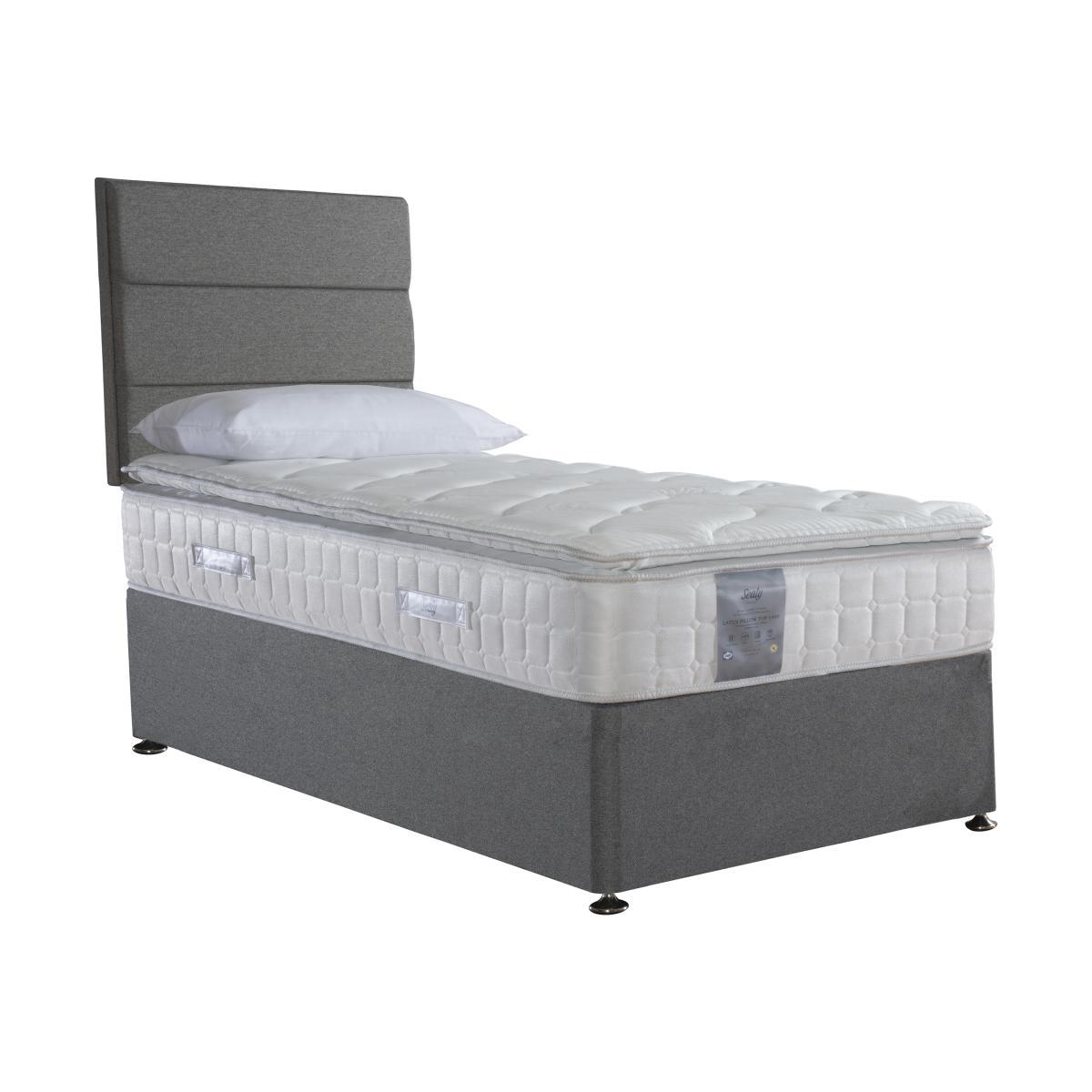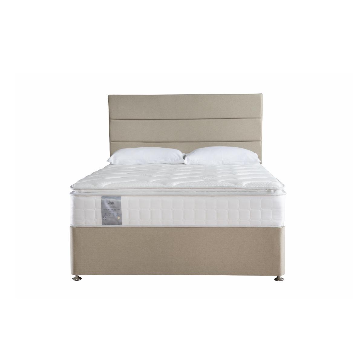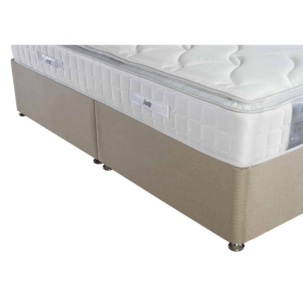 Comfort and convenience go hand in hand with the Sealy Latex Pillow Top 1400 range. Beautifully handcrafted in Britain, this collection includes a mattress, a divan base and mattress set, and an ottoman base with mattress. The mattress is finished with a soft and cushiony pillow top and features 1400 individually-responsive pocket springs in king size layered with equally responsive latex, a natural material which is hypoallergenic, anti-bacterial and anti-fungal. The upholstered platform top base is available with optional storage drawers in a choice of configurations or with roomy ottoman storage. The Sealy Latex Pillow Top 1400 range is exclusively available at Furniture Village. Headboard is an optional extra. Combining comfort, style and convenience, the Sealy Latex Pillow Top 1400 divan set comprises a latex and pocket sprung mattress plus upholstered platform top divan base. The 29 cm deep medium-feel mattress has 1400 individually-responsive and encased pocket springs in king size for edge-to-edge support, and arranged in posture-improving zones. Layers of pressure-relieving latex help create a cleaner sleeping environment – latex is anti-bacterial, anti-fungal and hypoallergenic. Temperature-regulating Smart Fibres, endorsed by Allergy UK, help combat dust mites. A cushiony pillow top and soft knitted cover completes this comfortable mattress. It comes with a traditional platform top divan base, beautifully upholstered in your choice of sophisticated fabric, and with useful optional storage drawers that are perfect for extra bedding. The Sealy Latex Pillow Top 1400 divan set is part of the Sealy handcrafted and British-made the Sealy Latex Pillow Top 1400 range. Only at Furniture Village. Product images are representative. Find out more. Please note. The mattress should be aired for four hours after delivery to freshen and remove any aroma from storage. It may take time for your mattress to attain its full size once the springs have settled to the correct position. This is due to the mattress being upright during transit. Settlement of fillings and indentations caused by body weight compressing the fillings are natural and not considered defects. This can be minimised by regular rotating (unless yours is a dual tension mattress).