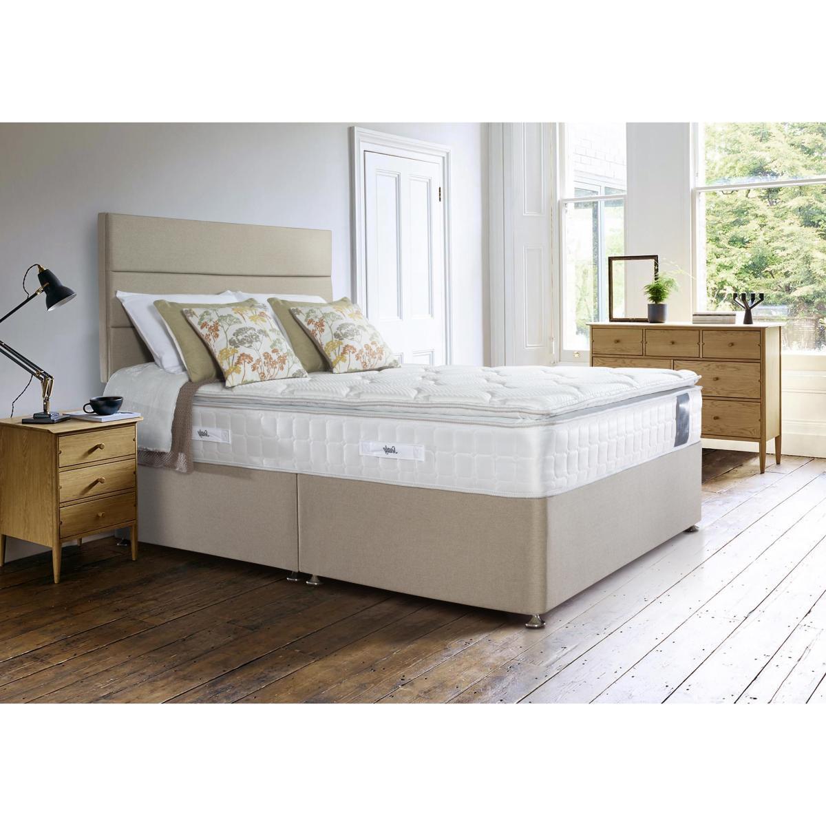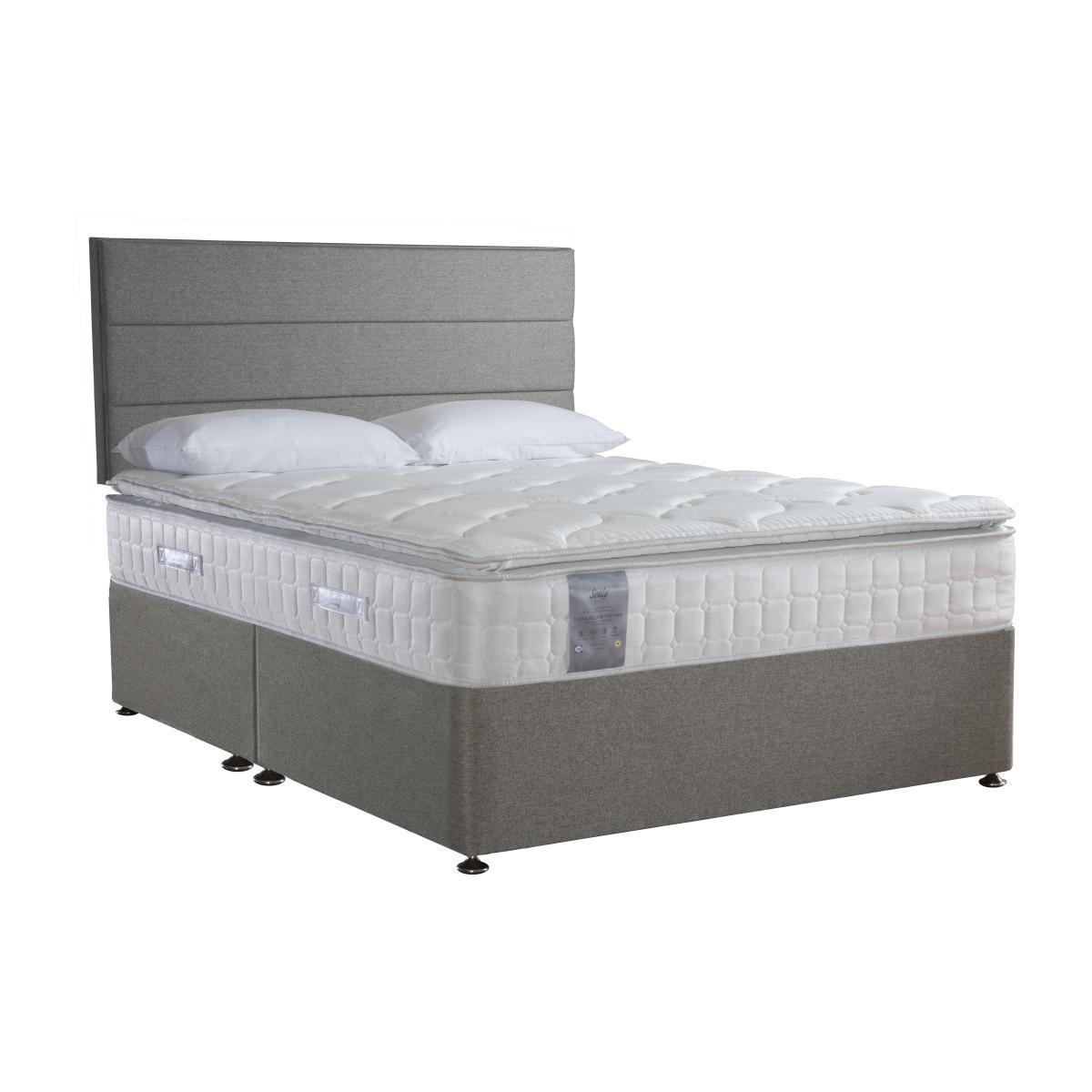 Comfort and convenience go hand in hand with the Sealy Latex Pillow Top 1400 range. Beautifully handcrafted in Britain, this collection includes a mattress, a divan base and mattress set, and an ottoman base with mattress. The mattress is finished with a soft and cushiony pillow top and features 1400 individually-responsive pocket springs in king size layered with equally responsive latex, a natural material which is hypoallergenic, anti-bacterial and anti-fungal. The upholstered platform top base is available with optional storage drawers in a choice of configurations or with roomy ottoman storage. The Sealy Latex Pillow Top 1400 range is exclusively available at Furniture Village. Headboard is an optional extra. Combining comfort, style and convenience, the Sealy Latex Pillow Top 1400 divan set comprises a latex and pocket sprung mattress plus upholstered platform top divan base. The 29 cm deep medium-feel mattress has 1400 individually-responsive and encased pocket springs in king size for edge-to-edge support, and arranged in posture-improving zones. Layers of pressure-relieving latex help create a cleaner sleeping environment – latex is anti-bacterial, anti-fungal and hypoallergenic. Temperature-regulating Smart Fibres, endorsed by Allergy UK, help combat dust mites. A cushiony pillow top and soft knitted cover completes this comfortable mattress. It comes with a traditional platform top divan base, beautifully upholstered in your choice of sophisticated fabric, and with useful optional storage drawers that are perfect for extra bedding. The Sealy Latex Pillow Top 1400 divan set is part of the Sealy handcrafted and British-made the Sealy Latex Pillow Top 1400 range. Only at Furniture Village. Product images are representative. Find out more. Please note. The mattress should be aired for four hours after delivery to freshen and remove any aroma from storage. It may take time for your mattress to attain its full size once the springs have settled to the correct position. This is due to the mattress being upright during transit. Settlement of fillings and indentations caused by body weight compressing the fillings are natural and not considered defects. This can be minimised by regular rotating (unless yours is a dual tension mattress).