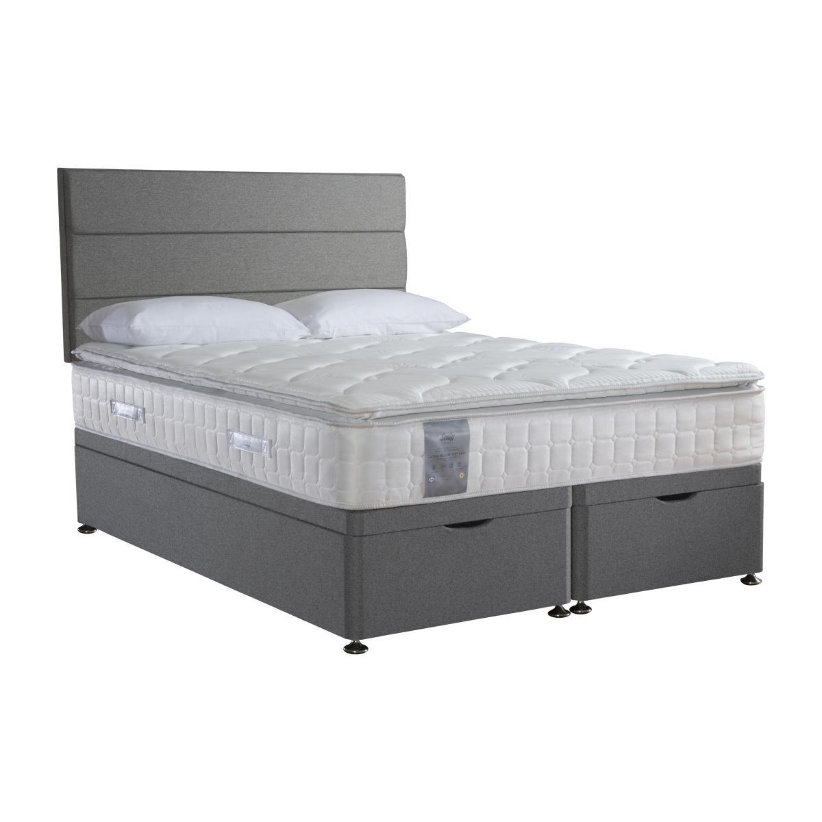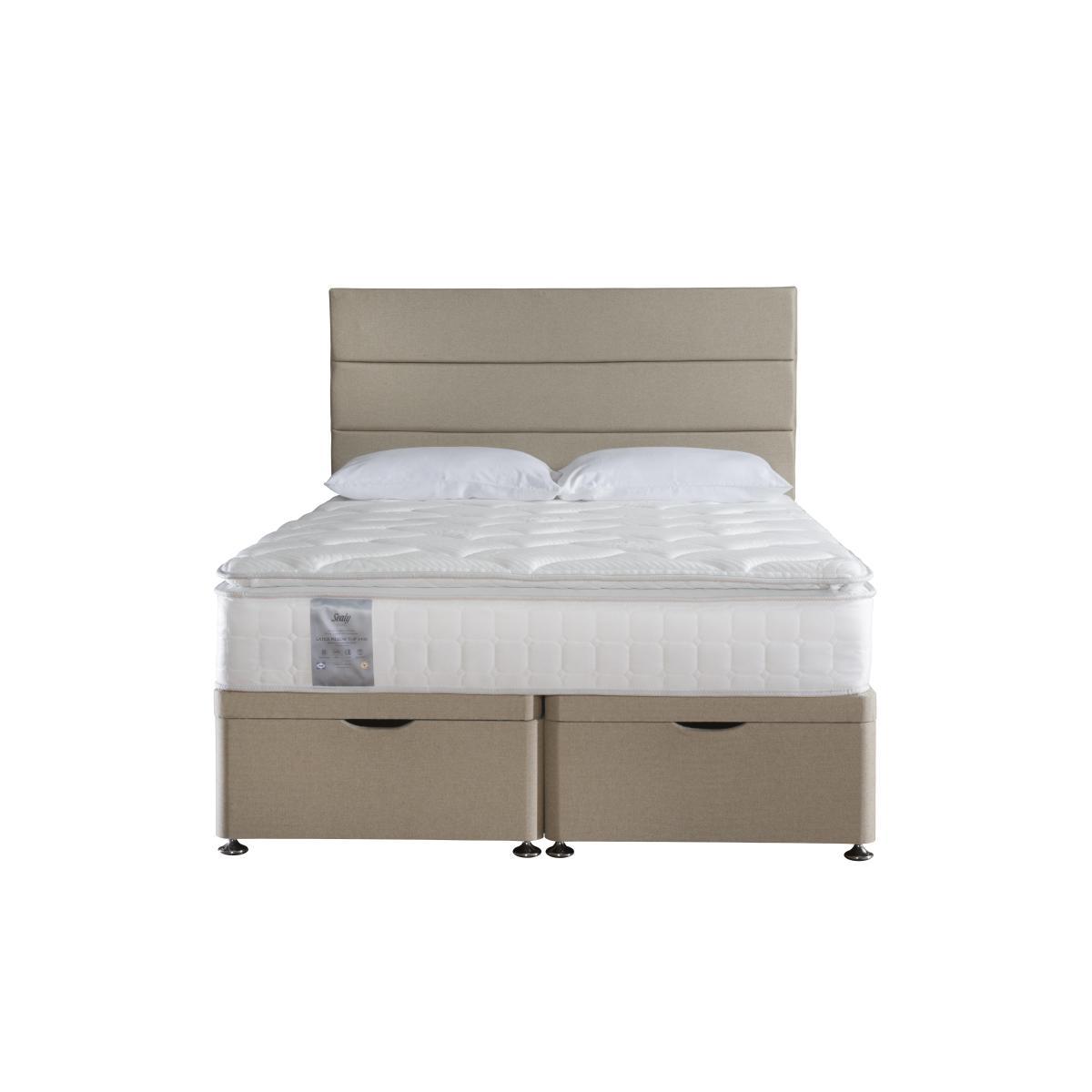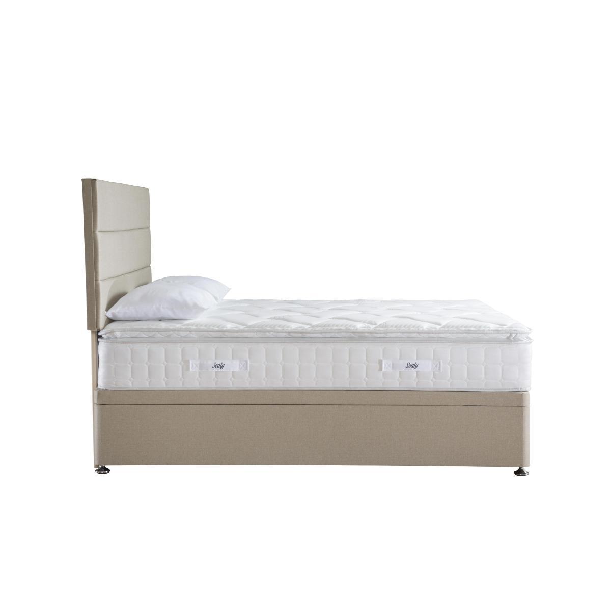 Comfort and convenience go hand in hand with the Sealy Latex Pillow Top 1400 range. Beautifully handcrafted in Britain, this collection includes a mattress, a divan base and mattress set, and an ottoman base with mattress. The mattress is finished with a soft and cushiony pillow top and features 1400 individually-responsive pocket springs in king size layered with equally responsive latex, a natural material which is hypoallergenic, anti-bacterial and anti-fungal. The upholstered platform top base is available with optional storage drawers in a choice of configurations or with roomy ottoman storage. The Sealy Latex Pillow Top 1400 range is exclusively available at Furniture Village. Headboard is an optional extra. Offering space-saving convenience and natural latex comfort, the Sealy Latex Pillow Top 1400 ottoman set is a superbly crafted divan set. The medium-feel mattress is 29 cm deep and has a pillow top for extra cushioning, and a soft knit cover. Individually-responsive pocket springs – 1400 in king size – are encased for edge-to-edge support. And layers of latex, a naturally anti-bacterial and anti-fungal material, promote a clean and fresh sleeping environment, as well as relieving pressure and improving posture. Smart Fibres, endorsed by Allergy UK, help regulate temperature and also combat dust mites. This divan set also includes an upholstered platform top divan base with spacious lift-up ottoman compartment, designed to solve all your bedroom storage needs. Handcrafted in Britain, the Sealy Latex Pillow Top 1400 ottoman set is part of the Sealy Latex Pillow Top 1400 range. A Furniture Village exclusive. Product images are representative. Find out more. Please note. The mattress should be aired for four hours after delivery to freshen and remove any aroma from storage. It may take time for your mattress to attain its full size once the springs have settled to the correct position. This is due to the mattress being upright during transit. Settlement of fillings and indentations caused by body weight compressing the fillings are natural and not considered defects. This can be minimised by regular rotating (unless yours is a dual tension mattress).