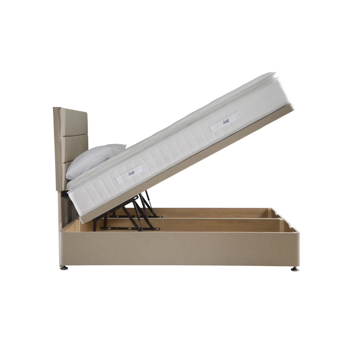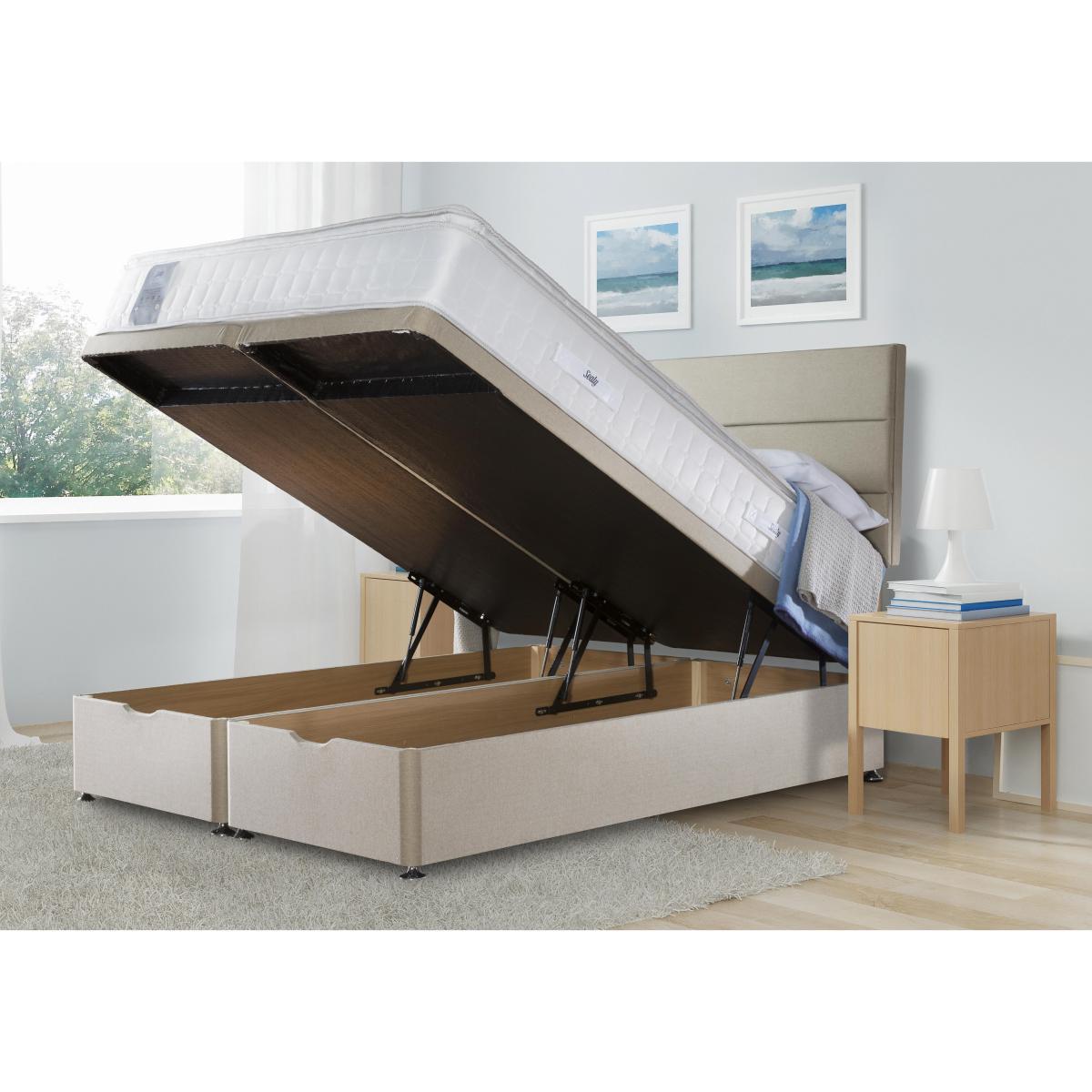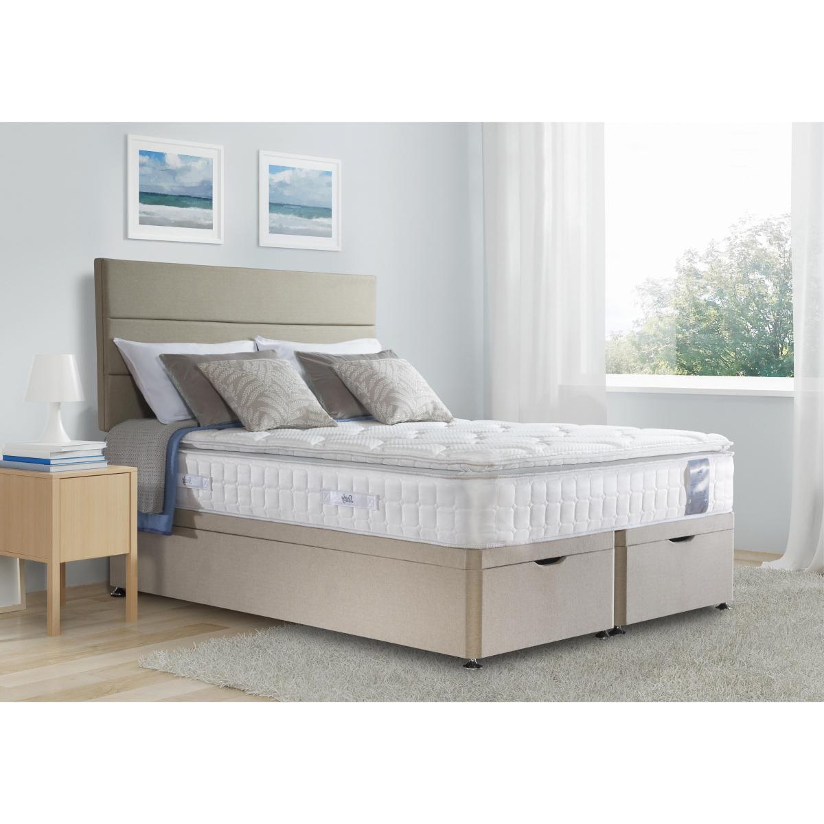 Comfort and convenience go hand in hand with the Sealy Latex Pillow Top 1400 range. Beautifully handcrafted in Britain, this collection includes a mattress, a divan base and mattress set, and an ottoman base with mattress. The mattress is finished with a soft and cushiony pillow top and features 1400 individually-responsive pocket springs in king size layered with equally responsive latex, a natural material which is hypoallergenic, anti-bacterial and anti-fungal. The upholstered platform top base is available with optional storage drawers in a choice of configurations or with roomy ottoman storage. The Sealy Latex Pillow Top 1400 range is exclusively available at Furniture Village. Headboard is an optional extra. Offering space-saving convenience and natural latex comfort, the Sealy Latex Pillow Top 1400 ottoman set is a superbly crafted divan set. The medium-feel mattress is 29 cm deep and has a pillow top for extra cushioning, and a soft knit cover. Individually-responsive pocket springs – 1400 in king size – are encased for edge-to-edge support. And layers of latex, a naturally anti-bacterial and anti-fungal material, promote a clean and fresh sleeping environment, as well as relieving pressure and improving posture. Smart Fibres, endorsed by Allergy UK, help regulate temperature and also combat dust mites. This divan set also includes an upholstered platform top divan base with spacious lift-up ottoman compartment, designed to solve all your bedroom storage needs. Handcrafted in Britain, the Sealy Latex Pillow Top 1400 ottoman set is part of the Sealy Latex Pillow Top 1400 range. A Furniture Village exclusive. Product images are representative. Find out more. Please note. The mattress should be aired for four hours after delivery to freshen and remove any aroma from storage. It may take time for your mattress to attain its full size once the springs have settled to the correct position. This is due to the mattress being upright during transit. Settlement of fillings and indentations caused by body weight compressing the fillings are natural and not considered defects. This can be minimised by regular rotating (unless yours is a dual tension mattress).