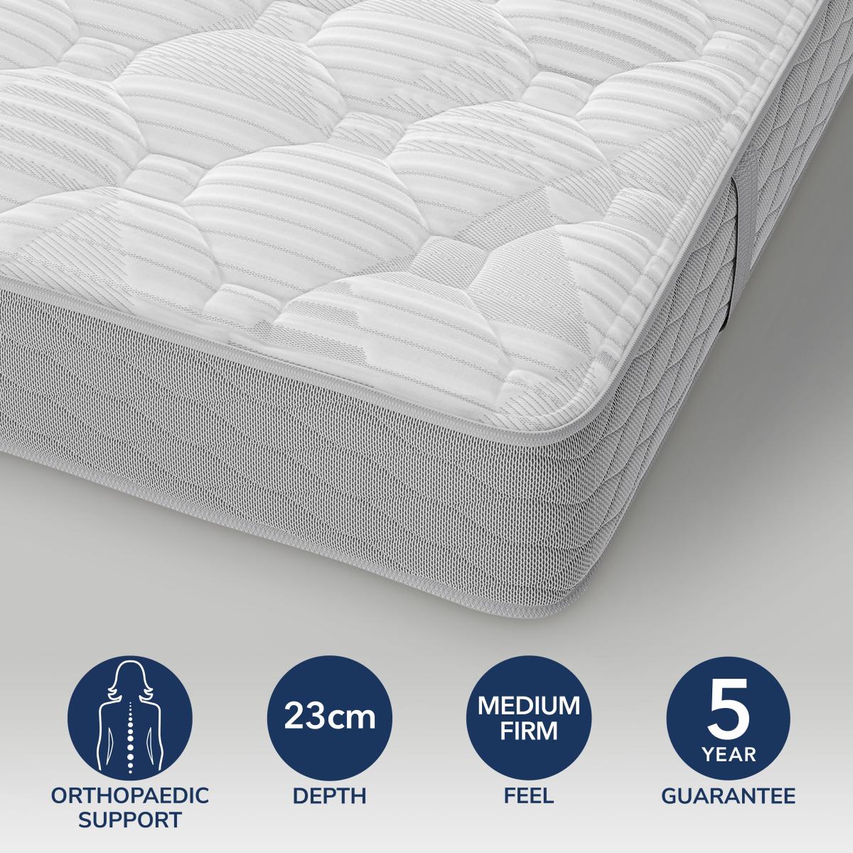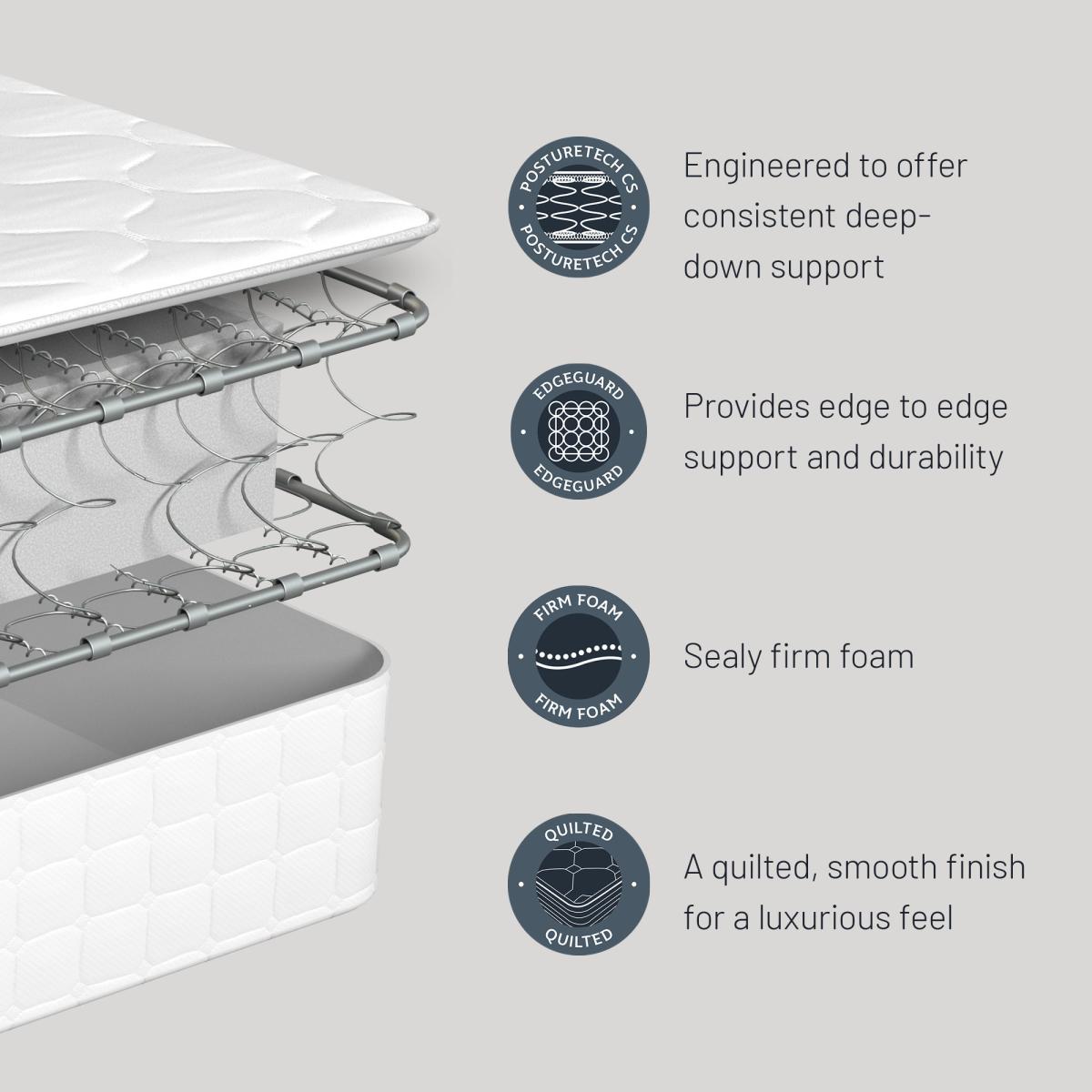 * Posture Tech Core Support spring system* Medium to firm feel* Orthopaedic support* Quilted top This mattress is great for people who prefer a medium to firm feel. The Posture Tech Core Support spring system delivers consistent support where your body needs it the most. Edge to edge support maximises the sleeping surface and ensures greater stability. A combination of premium foams in medium and firm densities work to offer comfort and cushioning, and the quilted top adds a smooth finish. This mattress is handmade in Britain and comes with a 5-year guarantee.