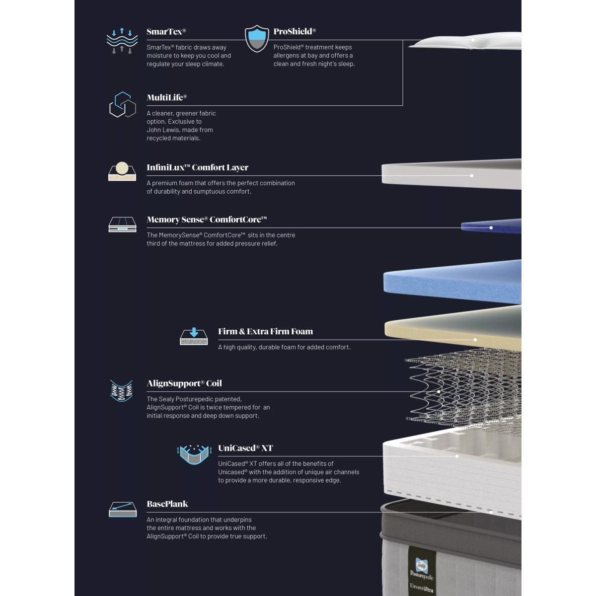 The Sealy Restore mattress, available only at John Lewis, offers a comfortable firm feel; exclusive to a Sealy Posturepedic mattress. AlignSupport® Uniquely designed and tested, the Align. Support® has been carefully constructed and evolved over time to be a two stage spring. First, it senses your individual shape as you rest into the mattress, followed by an instant response that applies deep-down, consistent support. Also, you can sleep soundly knowing that the spring unit is twice tempered which means it’s twice as strong and durable. Securing everything in place. UniCased® XT Working collaboratively with the spring system is the patented Uni. Cased® XT Edge Support. Encompassing the entire edge, the tailored keys lock into the Align. Support® system to create greater stability and allow you to sleep right up to the very edge. The coil inspired air channels also offer greater breathability and a robust seating edge. Strong and resilient, Uni. Cased® XT is supported by Base. Plank, a firm foundation and an integral piece that underpins the entire mattress, working with the Align. Support® spring system to provide true support. MemorySense® Comfort. Core™ Sealy’s Memory. Sense® Comfort. Core™ placed in the centre third of the mattress to target your hips and lower back for the ultimate pressure relief. Teamed up with a combination of Sealy foams, the mattress offers a sumptuous, cocooning feel as you drift off to sleep in the morning, night or whenever you like to take a snooze. MultiLife® Exclusive to John Lewis, Sealy have introduced a cleaner, greener fabric option: Multi. Life® fabric is made from recycled materials for a comfortable, eco-friendly night’s sleep. Complete with Smar. Tex® and Pro. Shield® for a clean and comfortable night’s rest. Smar. Tex® is designed to wick away moisture to regulate your sleep climate, whilst Pro. Shield® keeps allergens at bay. Mattress Care To prolong the life of your mattress and to ensure even wear, rotate it from head to foot regularly. Try before you buy This is an important purchase and it's worthwhile to try your choice of mattress in store to make sure it's right for you. Our store Partners will be able to tell you more about its benefits, and recommend options based on your needs.