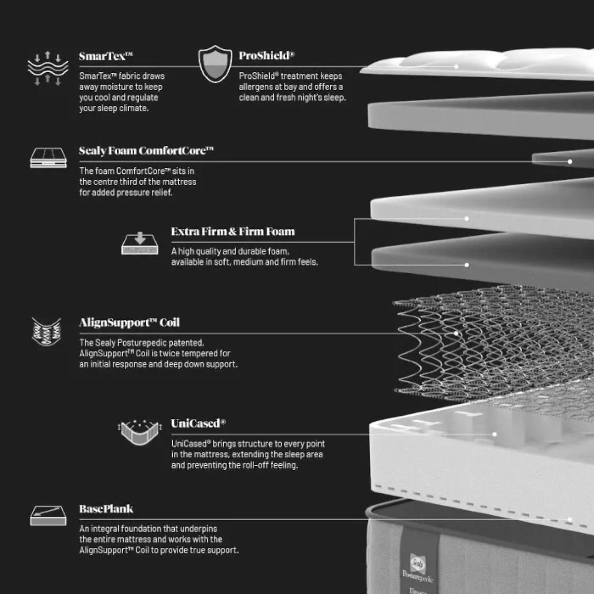 Explore the Sealy Riley Mattress, brought to you by Sealy's renowned Elevate series. Engineered to cater to individuals of all weights, the Riley mattress offers targeted support, making it an ideal choice for those seeking unparalleled comfort and restful sleep. Crafted with precision and innovation, this mattress combines advanced technology with luxurious materials to ensure a truly rejuvenating sleep experience. Features Sealy’s patented Align Support springs, as well as layers of firm and extra firm foam. Unicased edge to edge support means the whole of the mattress sleeping surface can be used, The foam comfort core, positioned in the centre third of the mattress, provides additional pressure relief for the hips and lower backs. Base plank technology provides a robust foundation for a hard wearing, long lasting finish. Firm – Good for people who change their sleeping position. Single sided mattress 28cm depth Available in Single, Double, King and Super King sizes. ProShield is endorsed by the experts at Allergy UK. All Sealy mattresses are handmade right here in Britain and come with a 5 year guarantee for added peace of mind. Mattress Dimensions: Single - W 90cm (3ft) x L 190cm (4ft6) x D 31cm (11”) Double - W 135cm (4ft6) x L 190cm (6ft3) x D 31cm (11”) King Size - W 150cm (5ft) x L 200cm (6ft6) x D 31cm (11") Super King Size - W 180cm (6ft) x L 200cm (6ft6) x D 31cm (11”) (Available in Zip and Link)