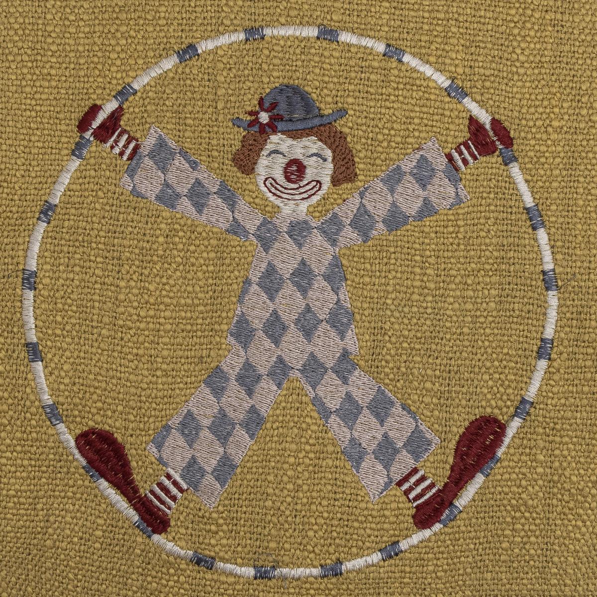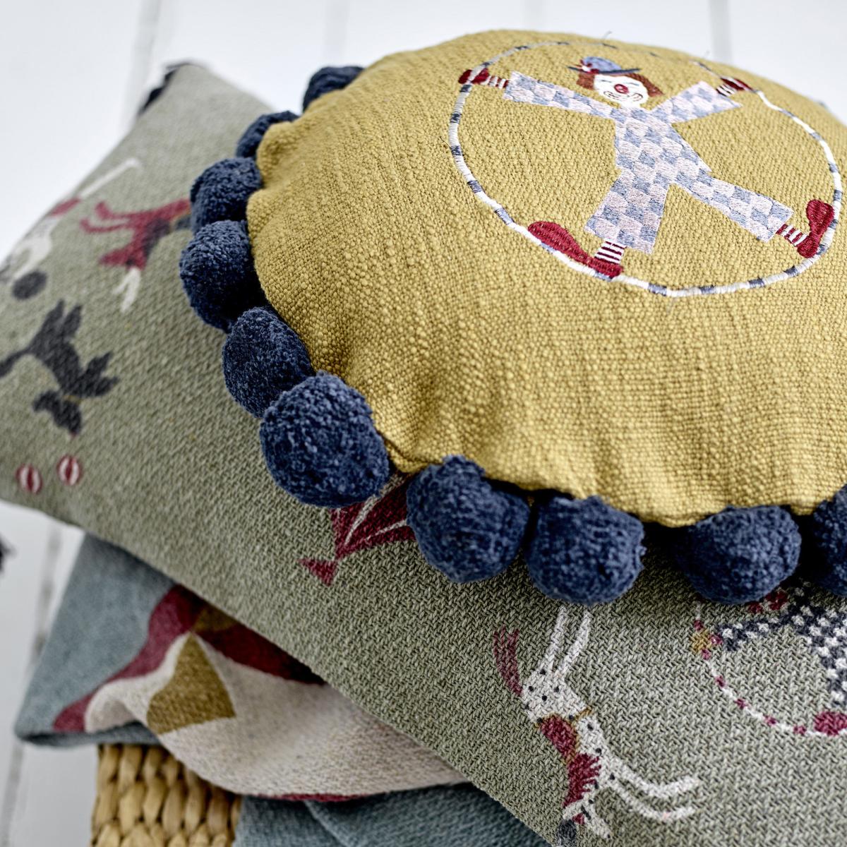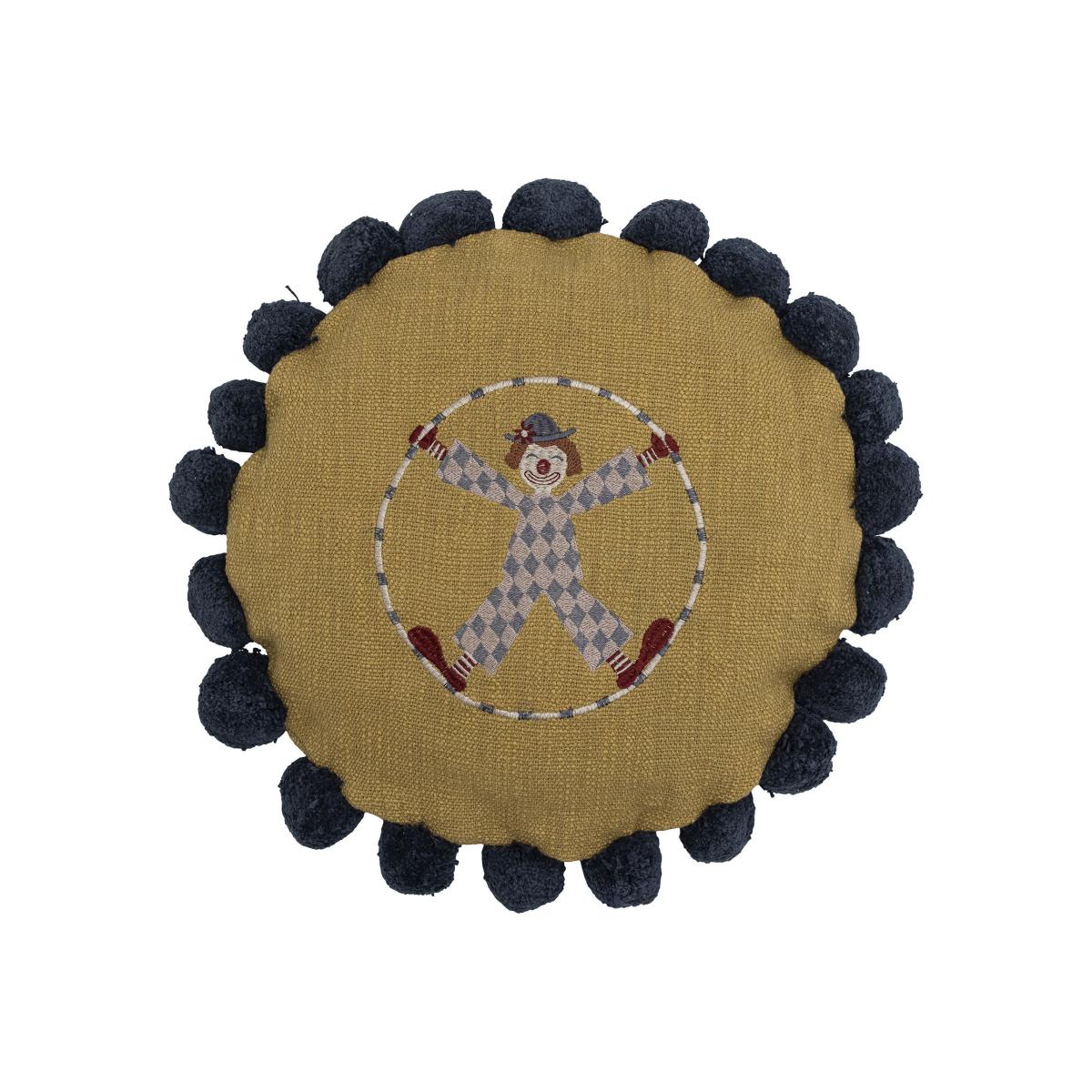 This gorgeous cushion is decorated with an adorable embroidered clown, inspired by the magic of the circus. The delicate, vintage pattern comes in warm and soothing colours. It's decorated with delightful blue pompoms.