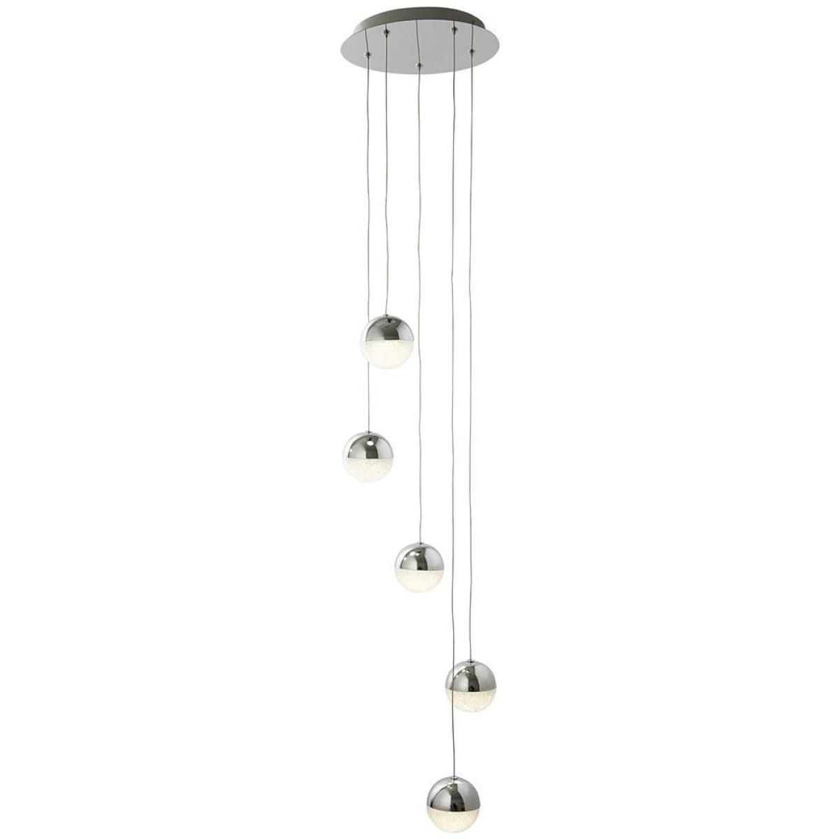 Searchlight Marbles LED 5 Light Ceiling Light Polished Chrome. The Marbles LED 5 Light Ceiling Light is a beautiful fitting from Searchlight. Finished in polished chrome, 5 globe shaped shades suspend elegantly from a round ceiling plate. Each shade boasts a chrome top half and an acrylic, crushed ice effect bottom half, offering a gorgeous diffusion of light when lit.