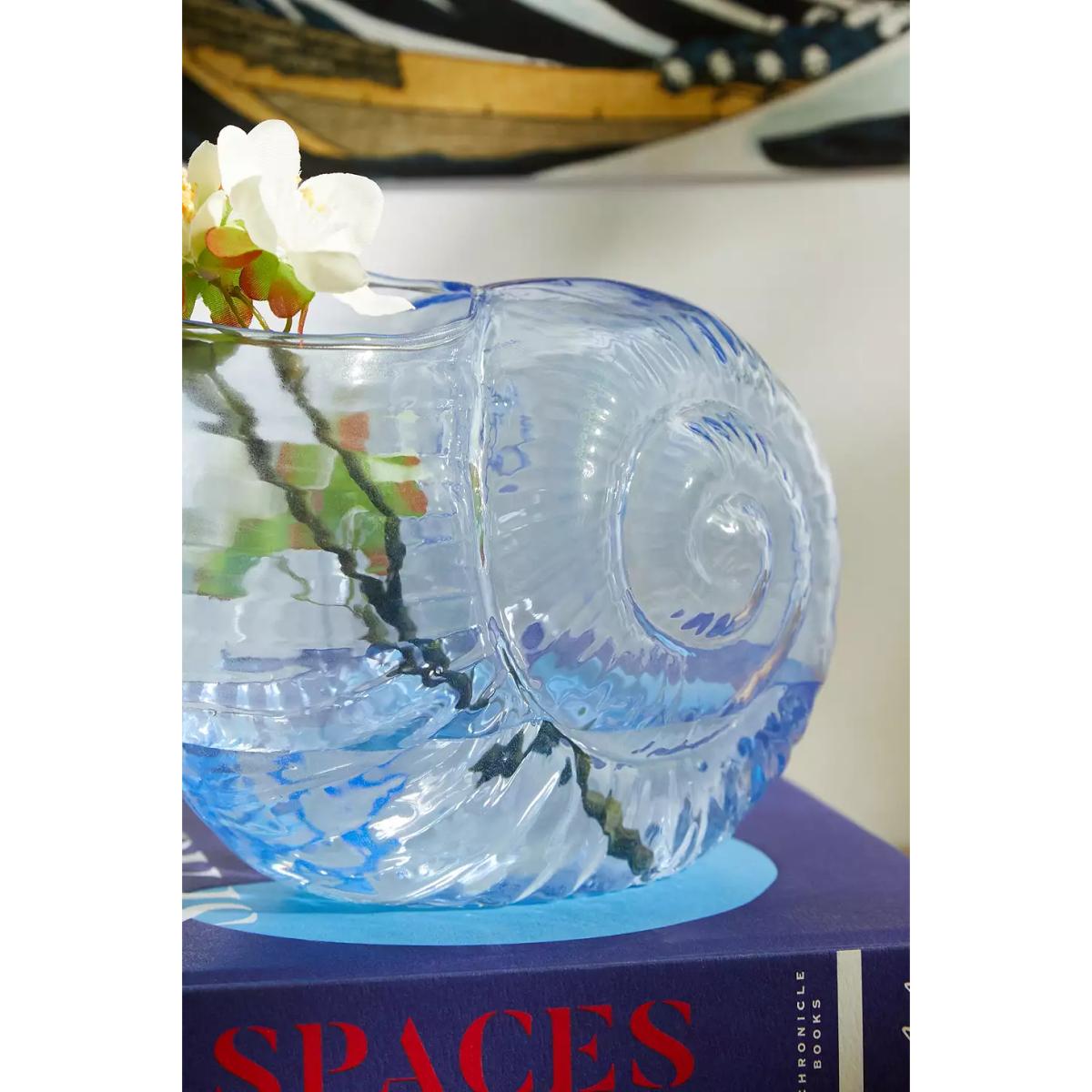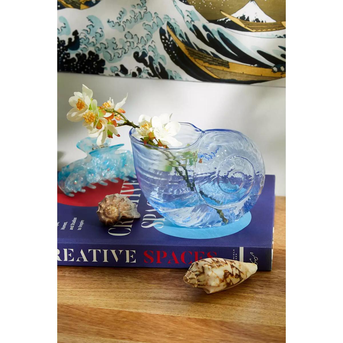 I love this blue seashell glass vase for its versatile colour and sculptural form, which makes it a real statement piece. It works particularly well in coastal-inspired interiors or modern spaces that embrace colour and texture. Its transparent material and soft blue hue help it blend seamlessly with natural elements like fresh flowers, greenery, or even dried botanicals for a more preserved look. Practical styling tips include pairing it with simple, understated florals or small plant cuttings to highlight its shape and colour, and placing it on open shelving or coffee tables to add a touch of colour and visual interest without overwhelming the space. Its size and unique form make it a great focal point in both clutter-free minimal setups and more eclectic arrangements.