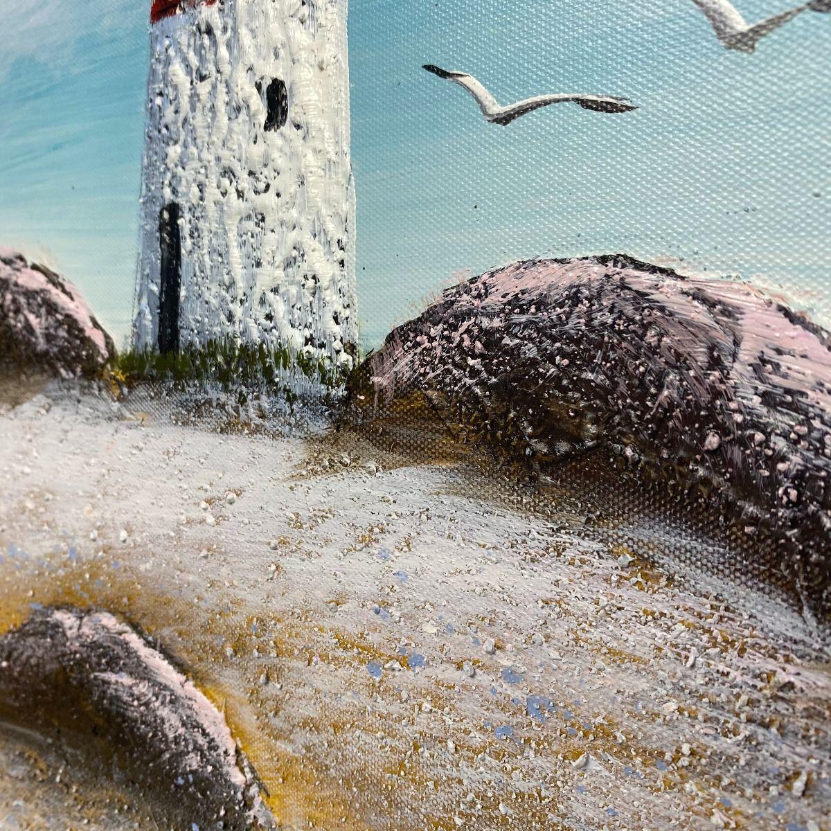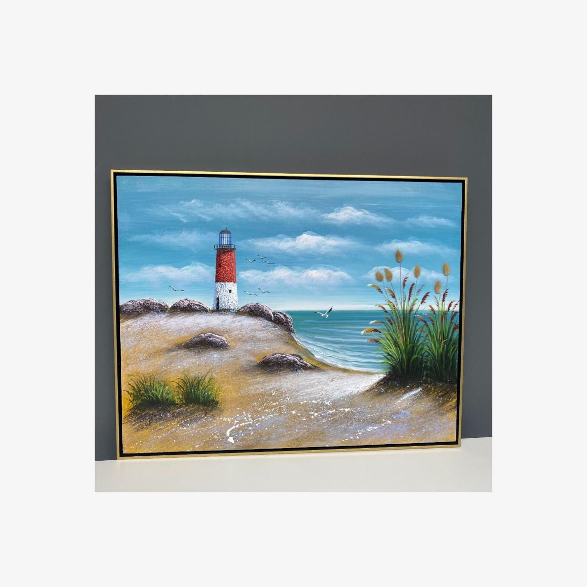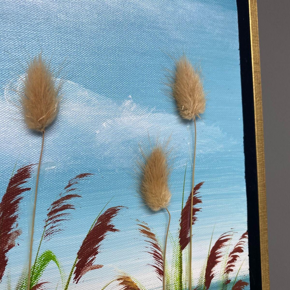 Scenic Coastal Seaside Summer Painted Canvas Add a touch of summer all year round to your home with this scenic coastal hand painted canvas. Featuring a lighthouse scene and 3D natural bunny tails. Additionally the painting features a subtle contemporary speckle paint effect. Perfect for any lounge, bedroom, dining room or hallway.  Scenic Coastal Seaside Summer Painted Canvas Add a touch of summer all year round to your home with this scenic coastal hand painted canvas. Featuring a lighthouse scene and 3D natural bunny tails. Additionally the painting features a subtle contemporary speckle paint effect. Perfect for any lounge, bedroom, dining room or hallway.