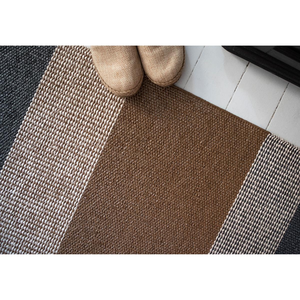 Seasons rug cacao (brown, black) from Brita Sweden is made in Sweden using old, traditional craft methods, and is a woven plastic rug with thick, block-like stripes. The durable but soft and comfortable carpet can be placed both outdoors and indoors. The rug is available in several different sizes and can easily be matched with different interior design styles and colours.