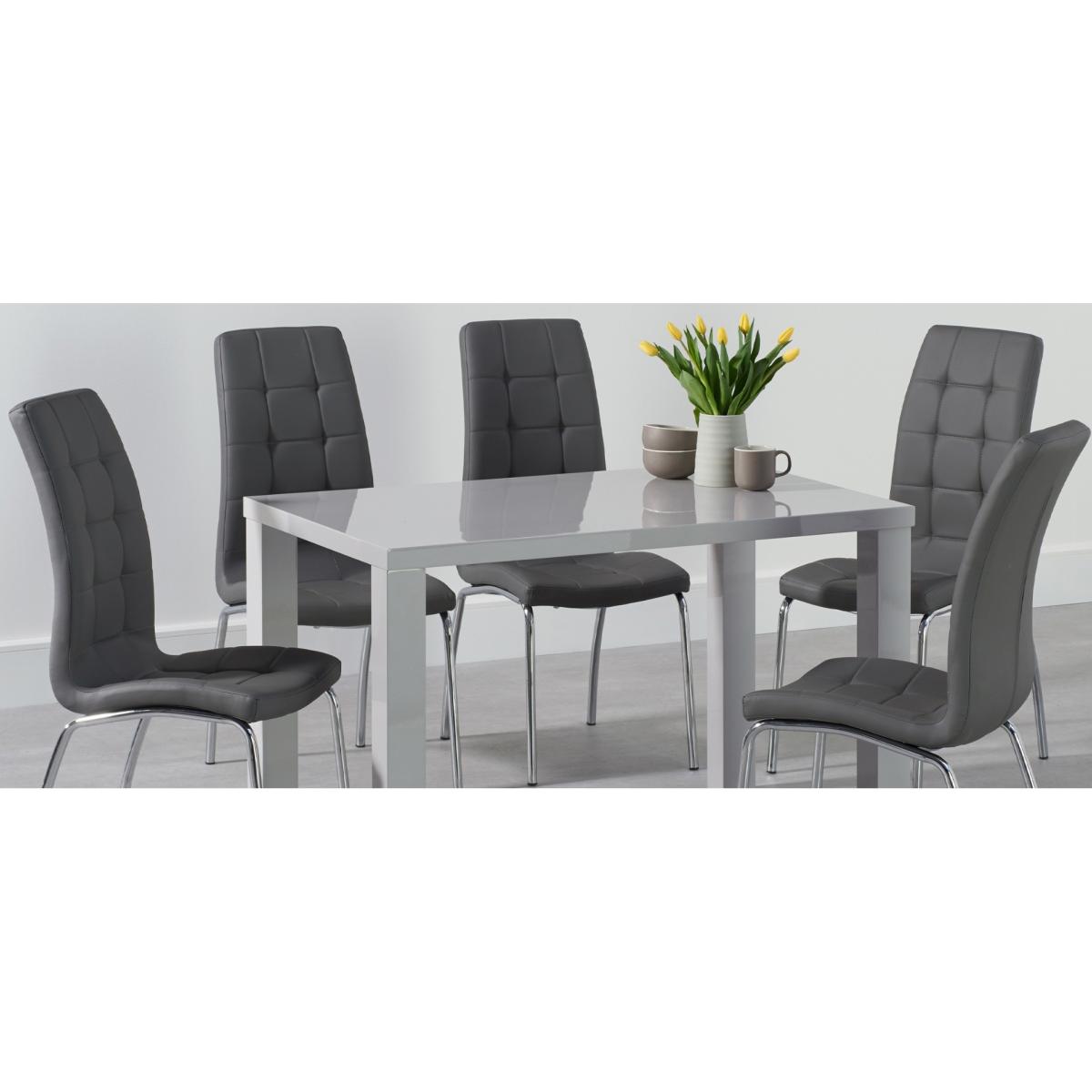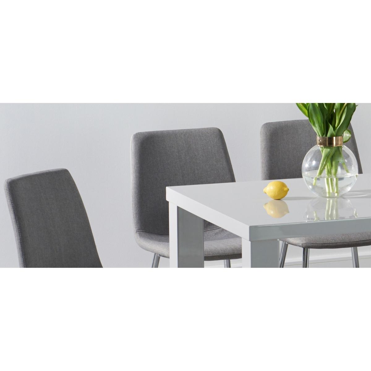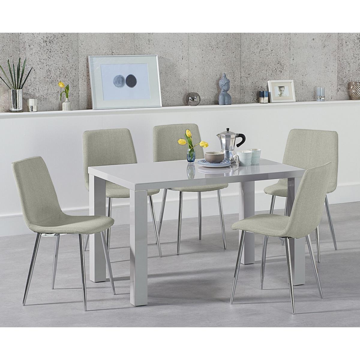 The Seattle 120cm High Gloss Dining Table with Astrid Chairs features a light grey, high gloss finish and striking upholstered chairs for ultimate comfort