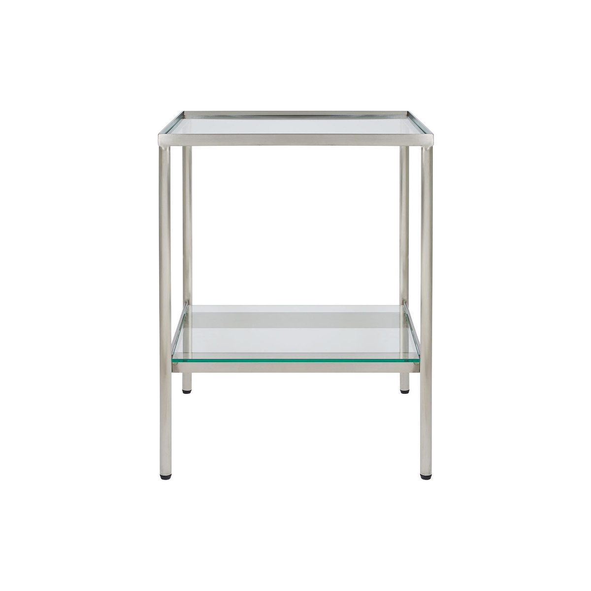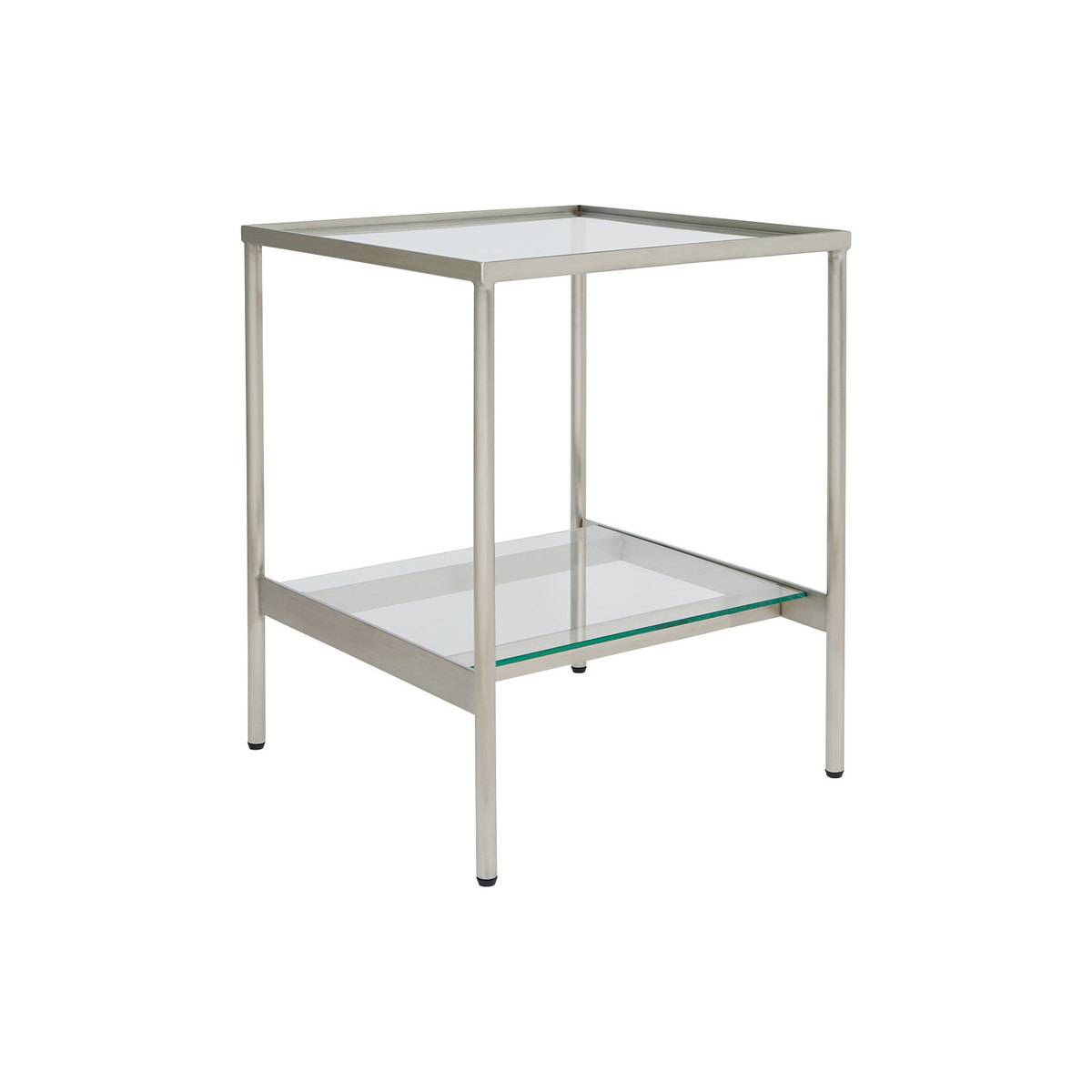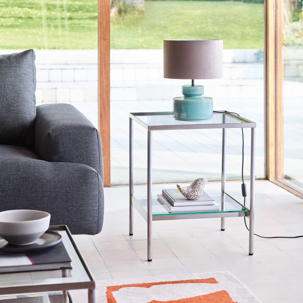 The Seattle chromed metal and glass side table is a sleek, clean-lined design that provides a sharp visual counterpoint to upholstered pieces. The strengthened glass sits within the table's frame and the smaller lower shelf provides additional storage books and magazines. The design works equally well as a bedside table and a Seattle glass coffee table is also available.