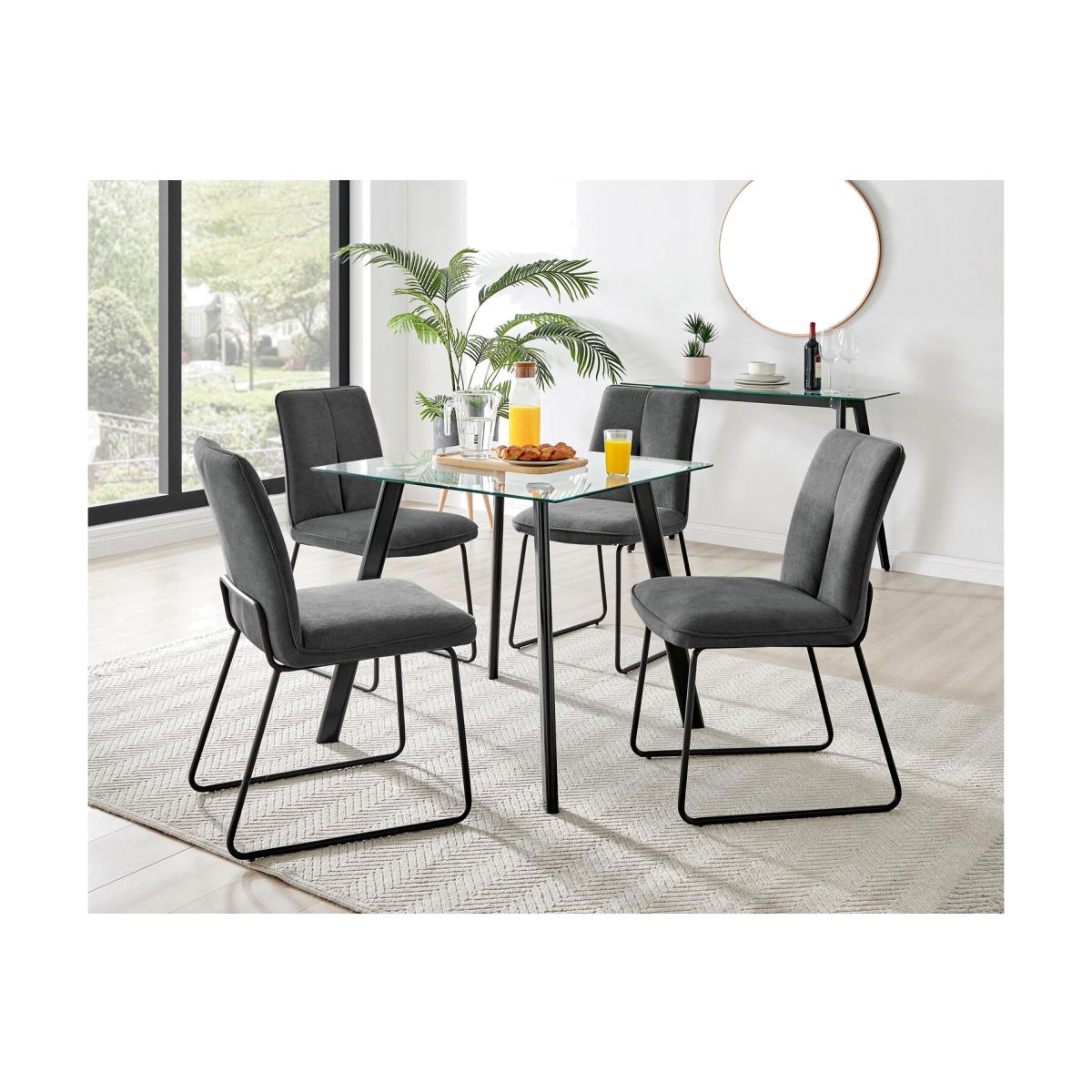 Our Seattle square glass dining table features simple and effortless clear glass and black tapered metal legs, perfect for modern homes. This dinner table has a 8mm thick tempered glass tabletop sat on four round tapered black powder-coated metal legs. It will comfortably seat 4 so perfect for family dinners or for entertaining guests. This design is all about keeping things unfussy and light with that minimalist Industrial look and laid-back Scandinavian touch. This beautifully designed dining table will set the scene for a stylish and contemporary dining room. Want to complete the look Shop our range of on-trend dining room furniture and gorgeous dining chairs!