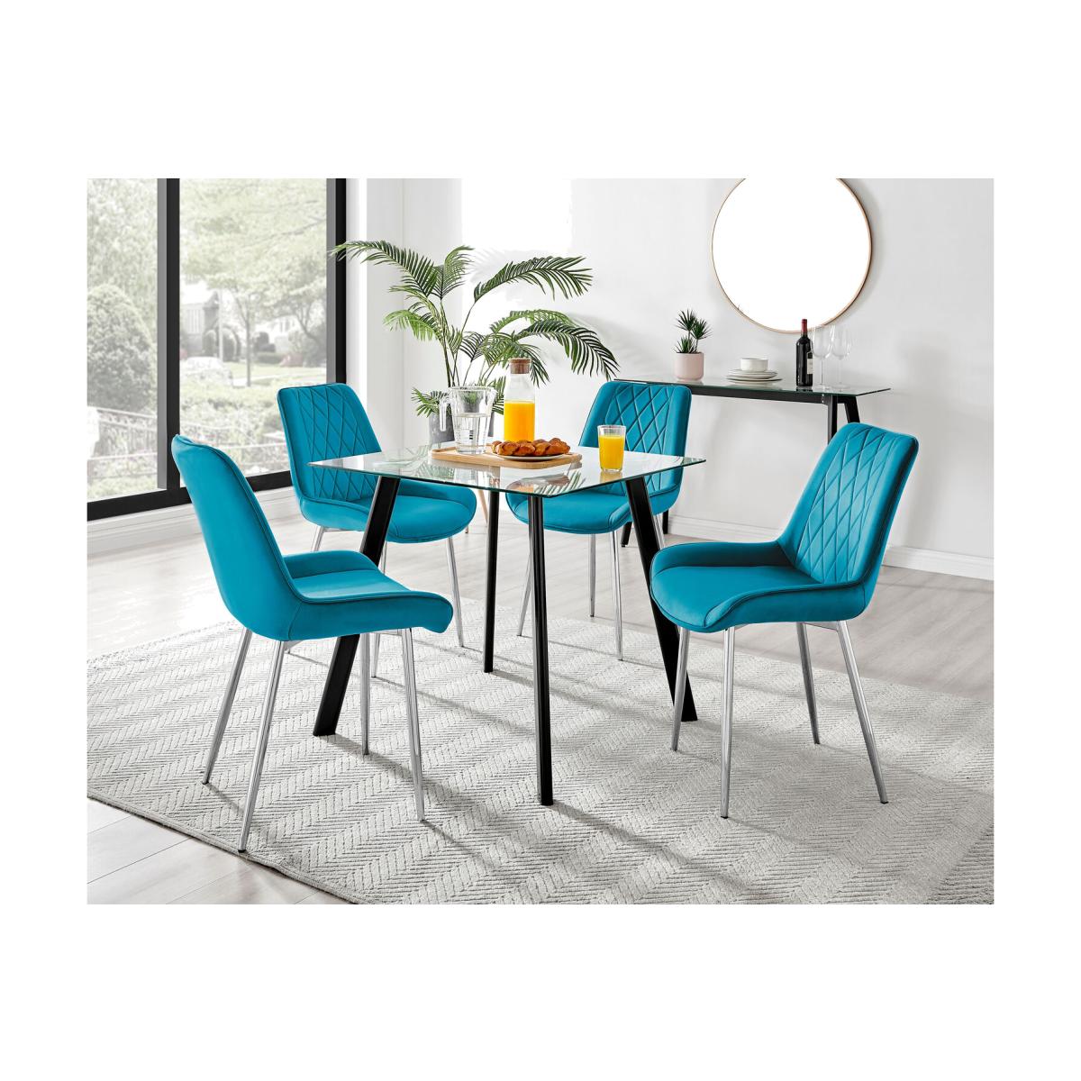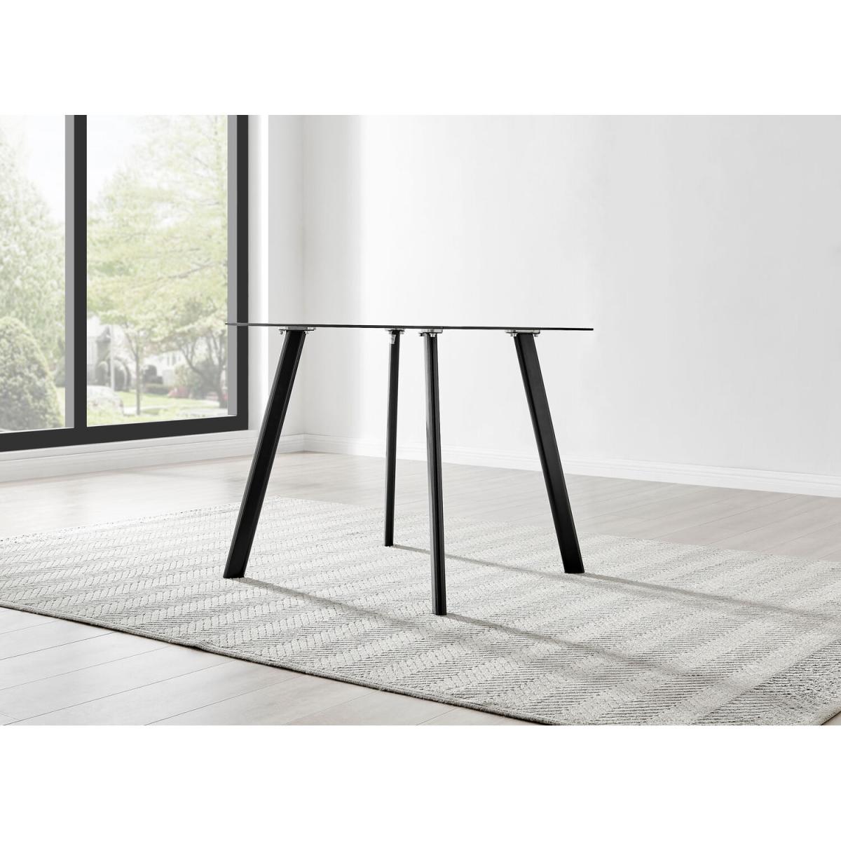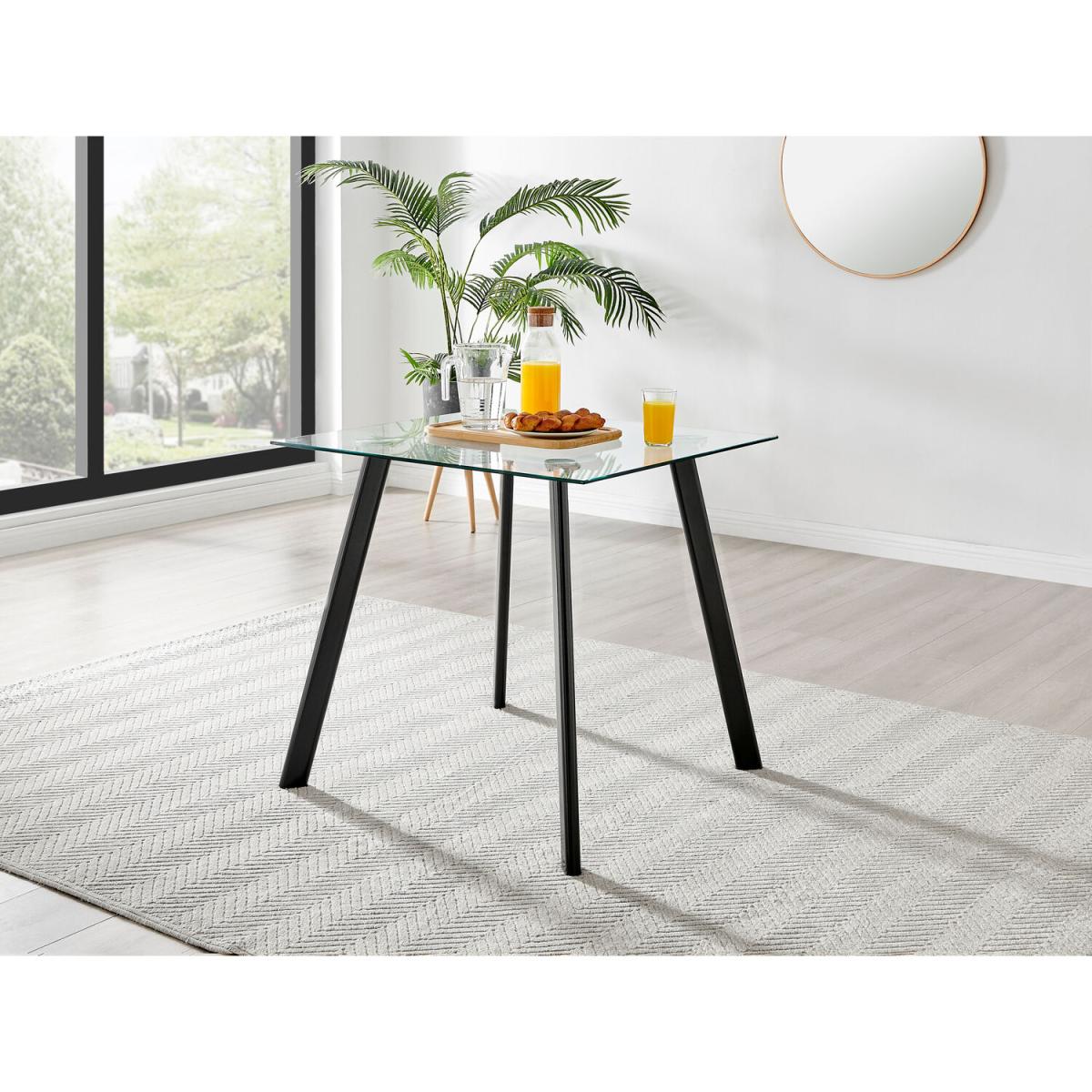 Our Seattle square glass dining table features simple and effortless clear glass and black tapered metal legs, perfect for modern homes. This dinner table has a 8mm thick tempered glass tabletop sat on four round tapered black powder-coated metal legs. It will comfortably seat 4 so perfect for family dinners or for entertaining guests. This design is all about keeping things unfussy and light with that minimalist Industrial look and laid-back Scandinavian touch. This beautifully designed dining table will set the scene for a stylish and contemporary dining room. Want to complete the look Shop our range of on-trend dining room furniture and gorgeous dining chairs!
