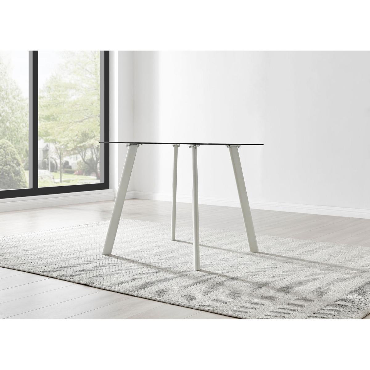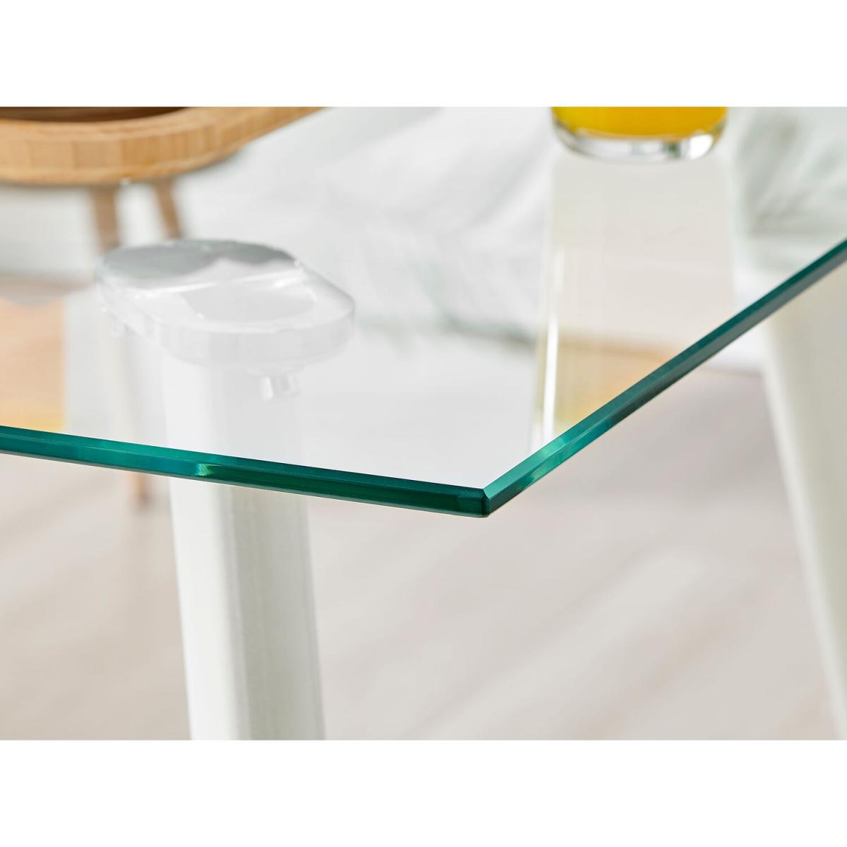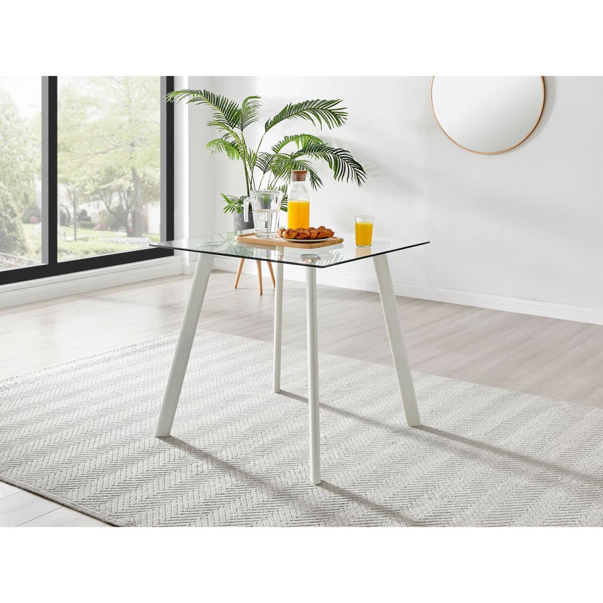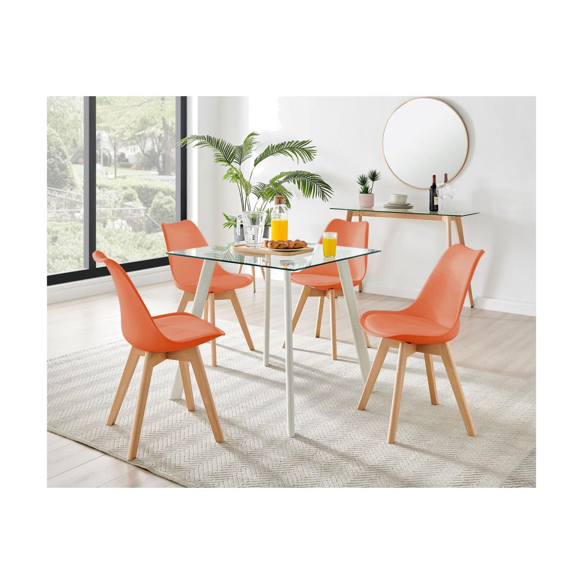 Our Seattle square glass dining table features simple and effortless clear glass and white tapered metal legs, perfect for modern homes. This dinner table has a 8mm thick tempered glass tabletop sat on four round tapered white powder-coated metal legs. It will comfortably seat 4 so perfect for family dinners or for entertaining guests. This design is all about keeping things unfussy and light with that minimalist look and laid-back Scandinavian touch. Our Stockholm chairs are all about that stripped-back chic Scandi vibe. The simple wooden angled legs look great paired with the faux leather chair and creates a stunning bright and breezy dining chair that will add some modern minimalist touches to your home and dining area. These chairs are the perfect combination of comfort and original style, suiting almost any wooden dining table. Ergonomically curved chair backs perfectly adapt to the shape of your body providing brilliant comfort. The wooden legs not only add to the aesthetic, but provide stability for use in a variety of environments. Our designs are fantastic value for money and are sure to give any dining room a touch of class, or make a great one off style statement.