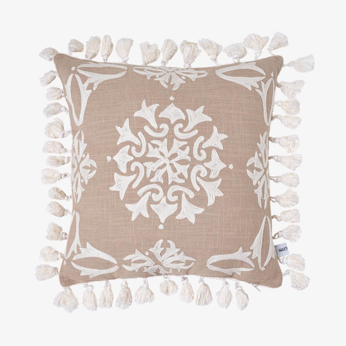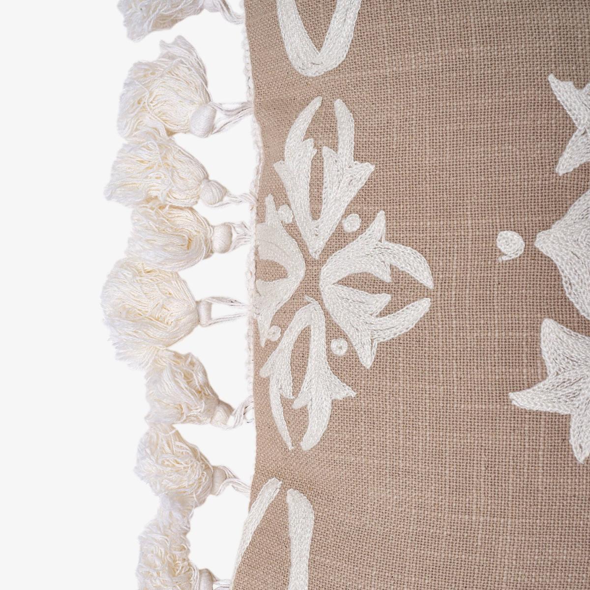 Celebrate bohemian style with our natural cotton cushion cover with an artistic white embroidery motif design, complete with tassel detailing for a playful touch. Perfect for adding soft texture and extra layers of comfort to neutral decors. Style with cushions in similar hues and patterns for an ode to bohemian style. Celebrates craft traditions - craftmanship of cushion is skilfully handwoven in India by local talented artisans.