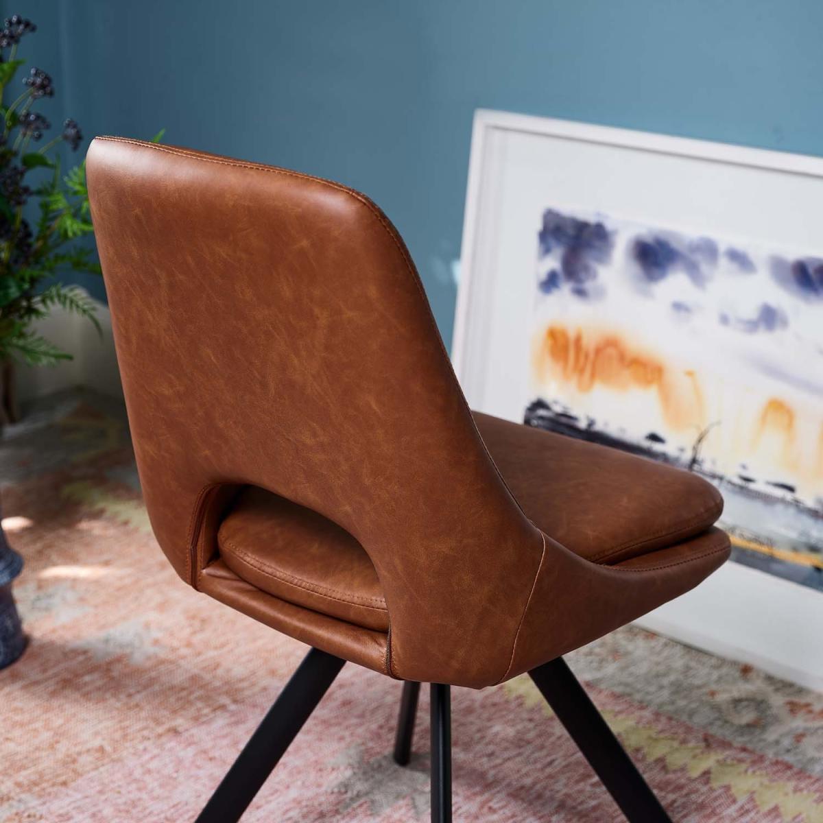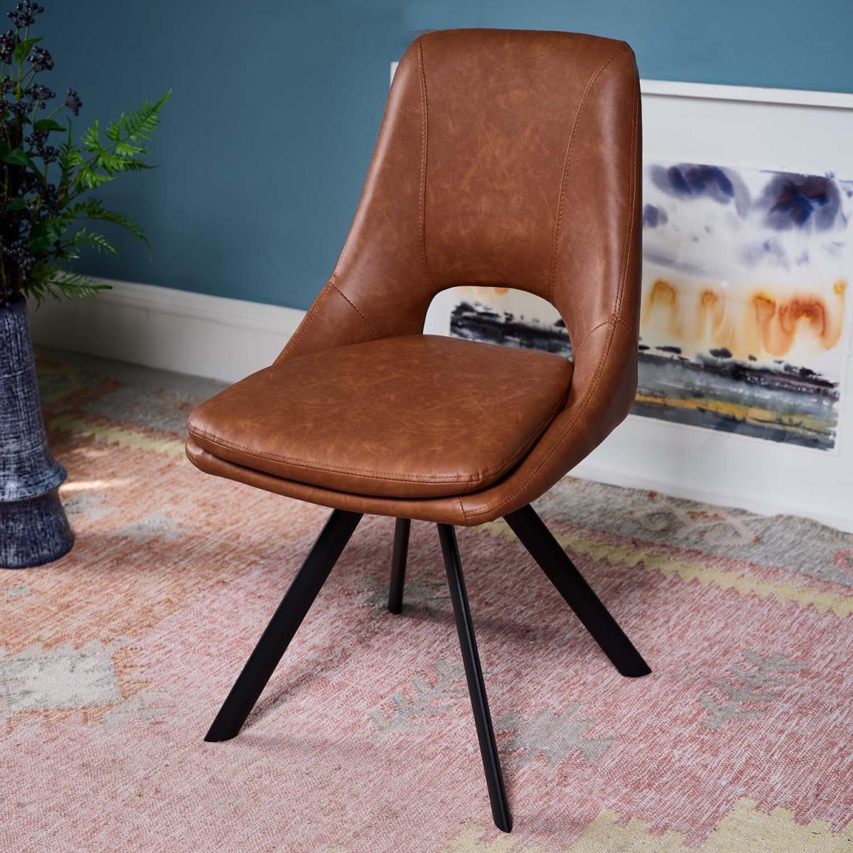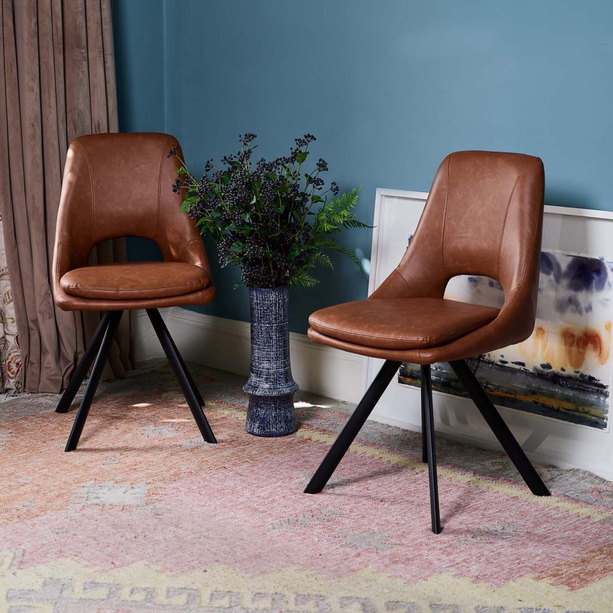 The Sebastian dining chair is both stylish and practical. With tan faux leather upholstery and black angled metal legs, this chair does not shy away from classic sophistication. Added comfort comes from the padded seat, while the gap in the back acts as a handle, protecting the fabric from extra degradation. Sold as a pair, these contemporary dining chairs are also available in grey for an even more on-trend look.
