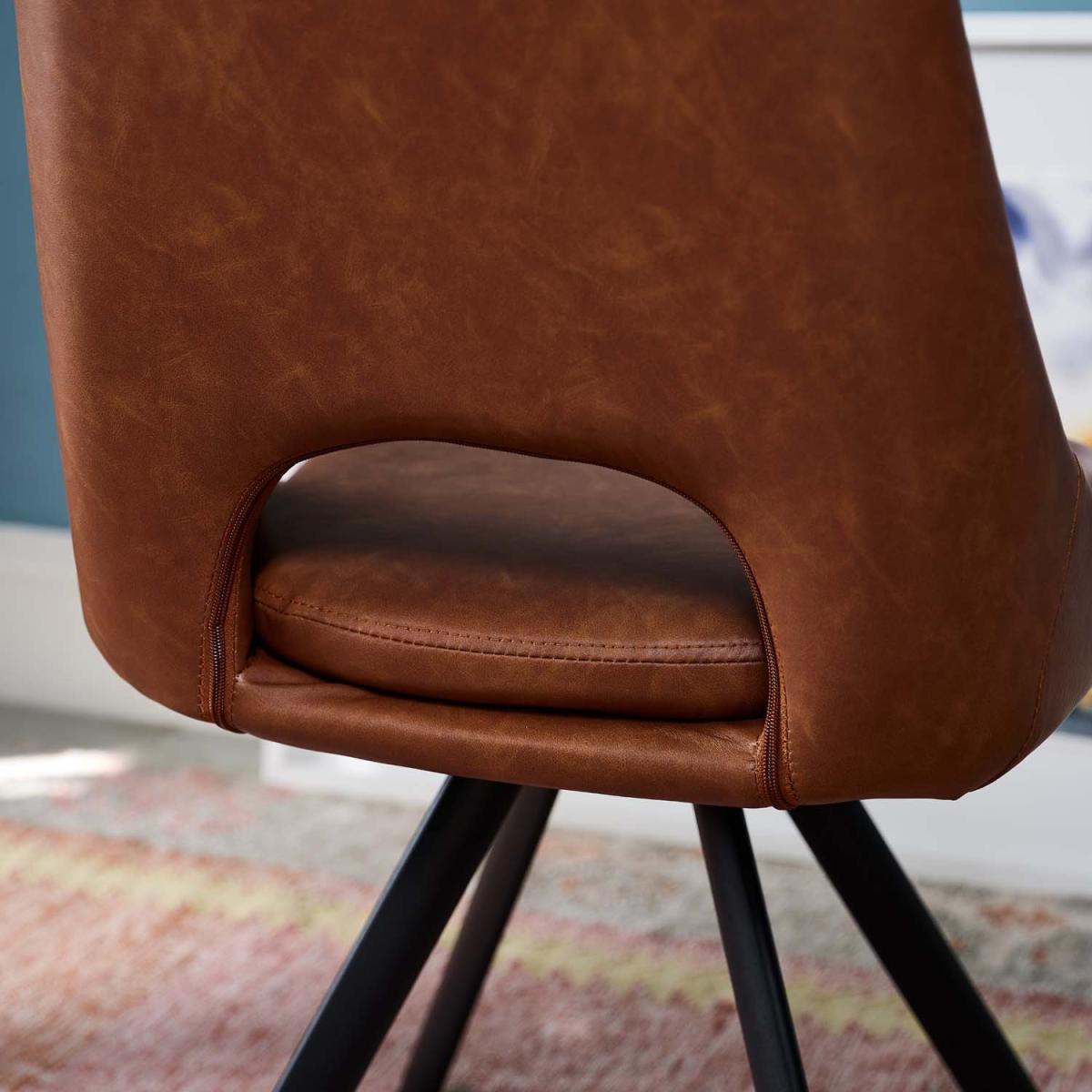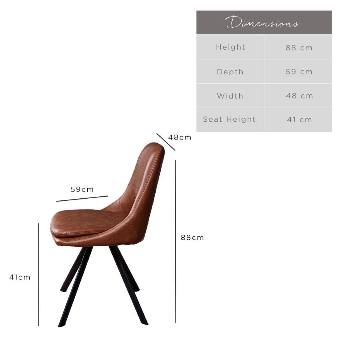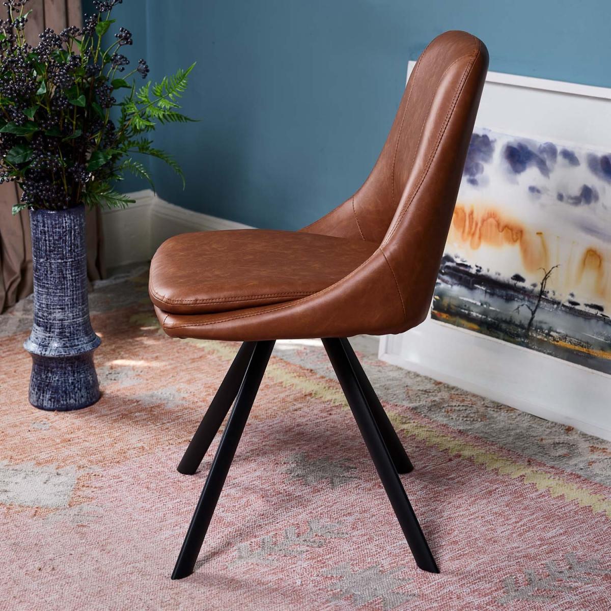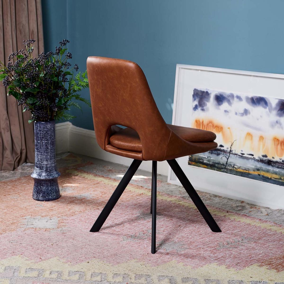 The Sebastian dining chair is both stylish and practical. With tan faux leather upholstery and black angled metal legs, this chair does not shy away from classic sophistication. Added comfort comes from the padded seat, while the gap in the back acts as a handle, protecting the fabric from extra degradation. Sold as a pair, these contemporary dining chairs are also available in grey for an even more on-trend look.