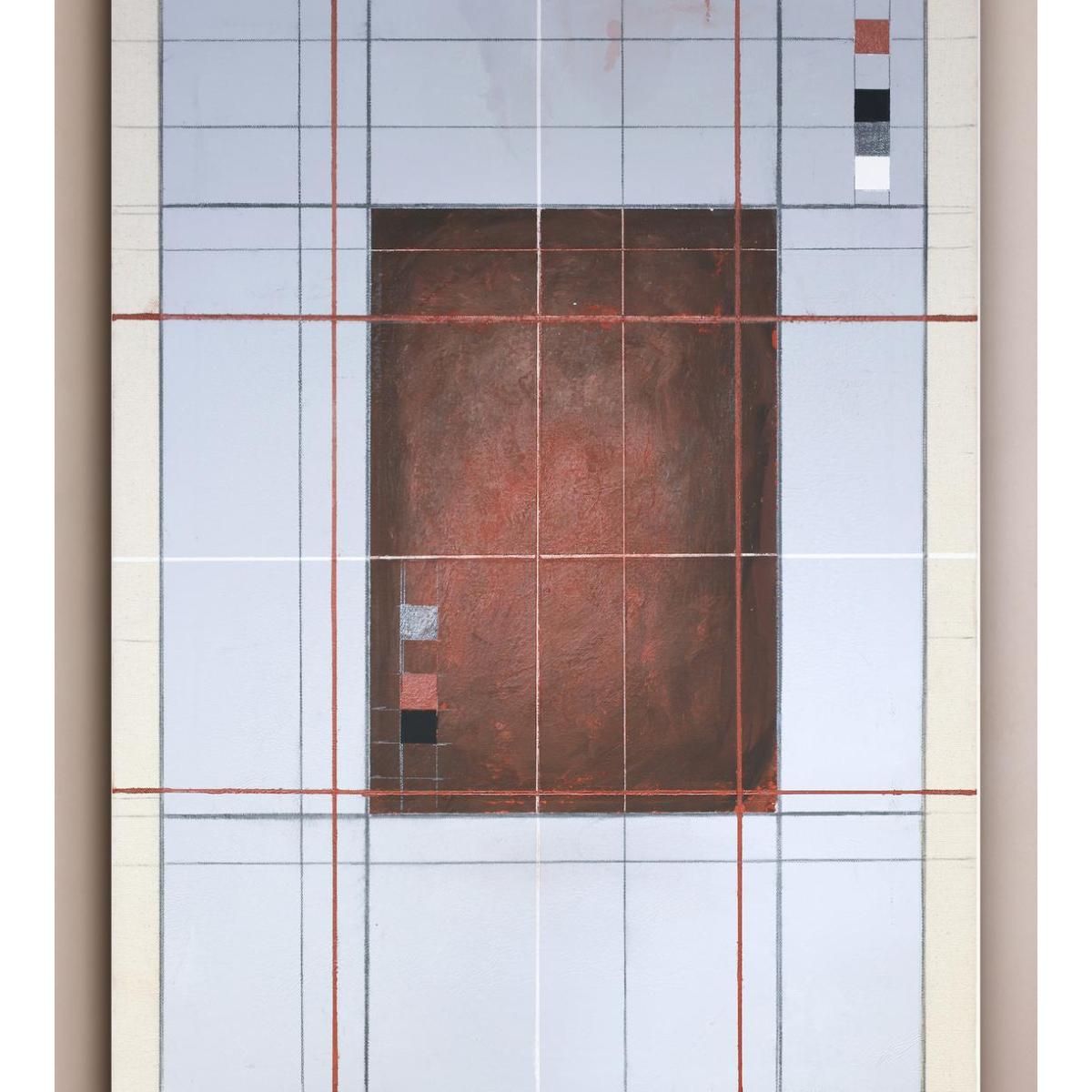 An original mixed-media abstract painting made using acrylic, gesso and high-visibility vinyl on canvas. Born in Germany and based in London, Sabrina Brouwers creates artworks inspired by Sol Le. Witt, a pioneering figure in the Conceptual Art movement. She challenges manmade principles by combining grid-like forms with fluid, circular shapes.