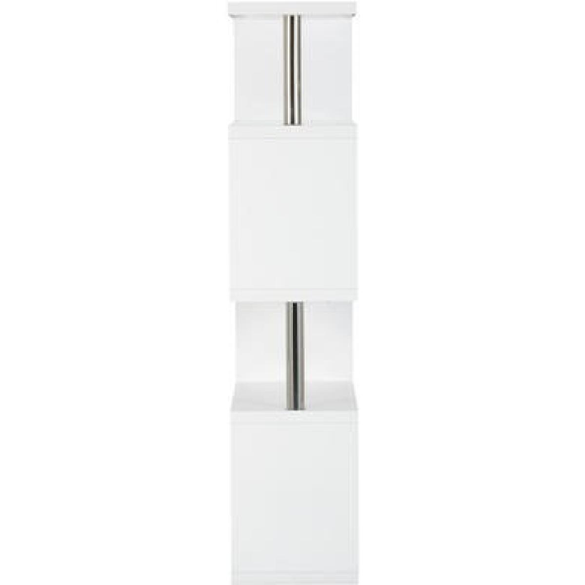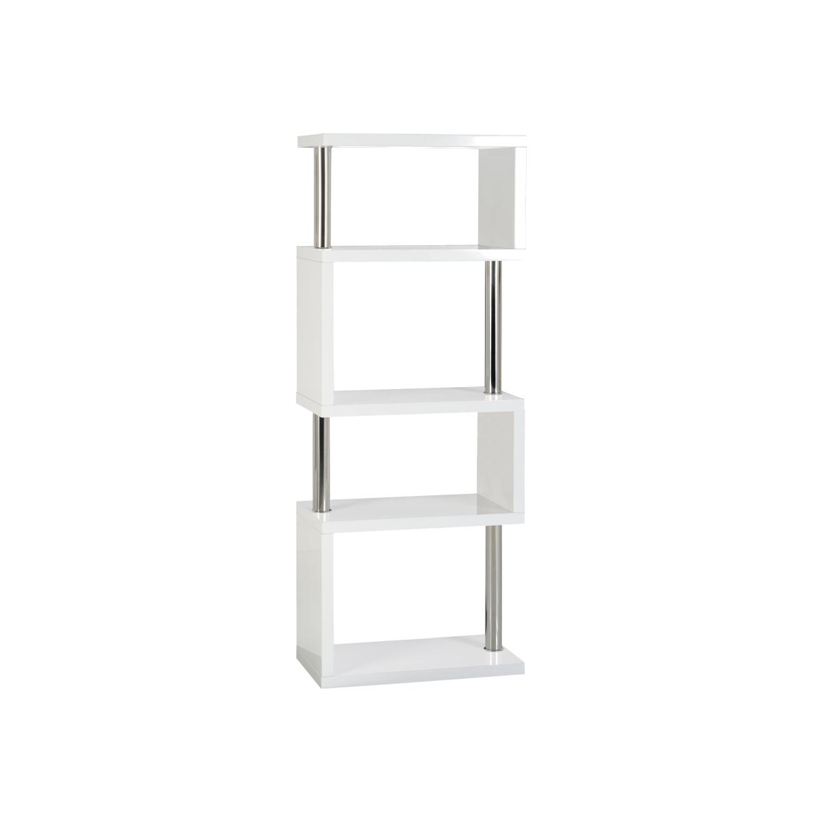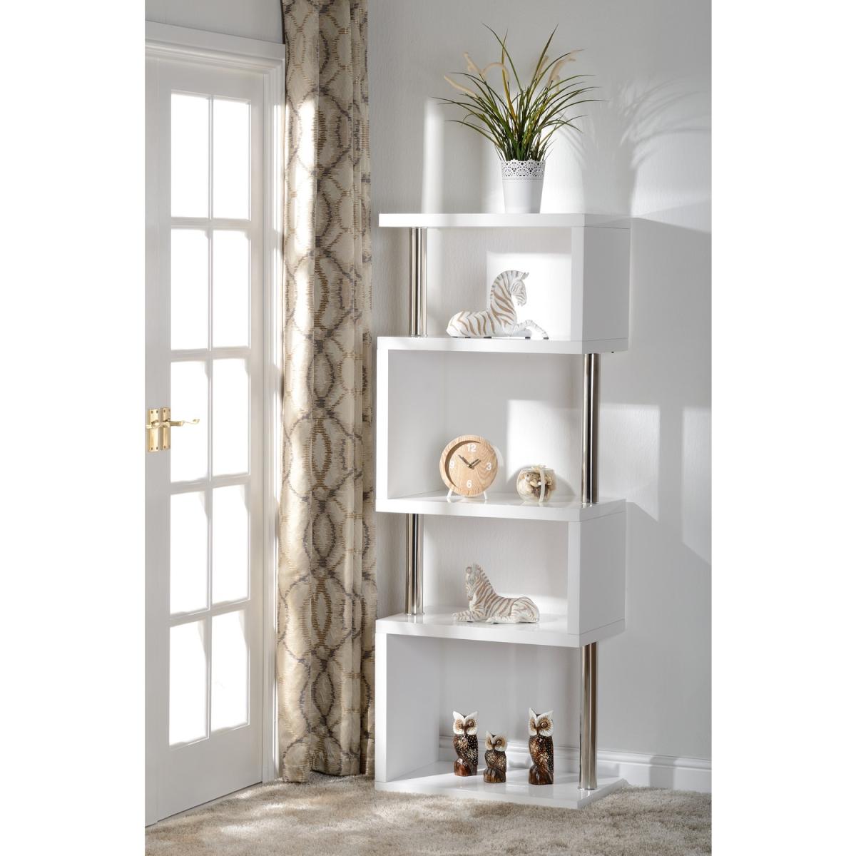 Dimensions W60cm x D35cm x H160cm Features. Modern 5 shelf unit. White high gloss finish. Attractive chrome tubing. Ideal for displaying ornaments. Assembly required..