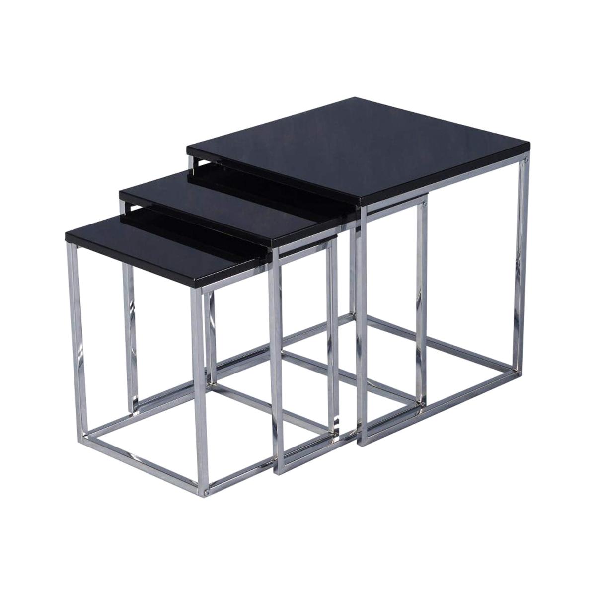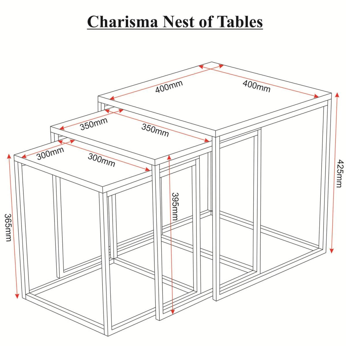 . Not only are these tables sleek and stylish there also highly practical! A great item to have in your homeSMAL. L TABLE. H36.8 x W30.5 x D30.5 cm MEDIUM TABLE. H39.4 x W34.9 x D34.9 cm LARGE TABLE. H41.9 x W40 x D40 cm FEATURES. Set of 3 tables. Fit perfectly under one another. Saves floor space Contemporary style Sleek high gloss finish. Chrome frames. Square table tops. Coordinating furniture available. . HOW BIG AM I? These Charisma tables were designed with space saving in mind. Each table perfectly fits under another saving you precious floor space when not in use. The nest includes three tables giving you the option to select a table to suit your use. HOW DO I LOOK? Sleek high gloss combines with shiny chrome to create a highly modern set of tables. Simplistic and contemporary a stylish addition to your home. WHAT AM I MADE OF? Constructed from MDF and finished with a smooth coating of black high gloss giving the tables a desirable modern look. The table frames are stylish shiny chrome enhancing the contemporary look of these tables. TREAT ME RIGHT Simply wipe over with a duster or dry cloth to keep a dust free surface. As theses tables have high gloss table tops a hint of polish now and again will really bring out their natural shine. HOW EASY AM I TO PUT TOGETHER? These tables are delivered flat packed so self-assembly is required. Easy to follow step by step instructions are included but you will need to provide your own tools .