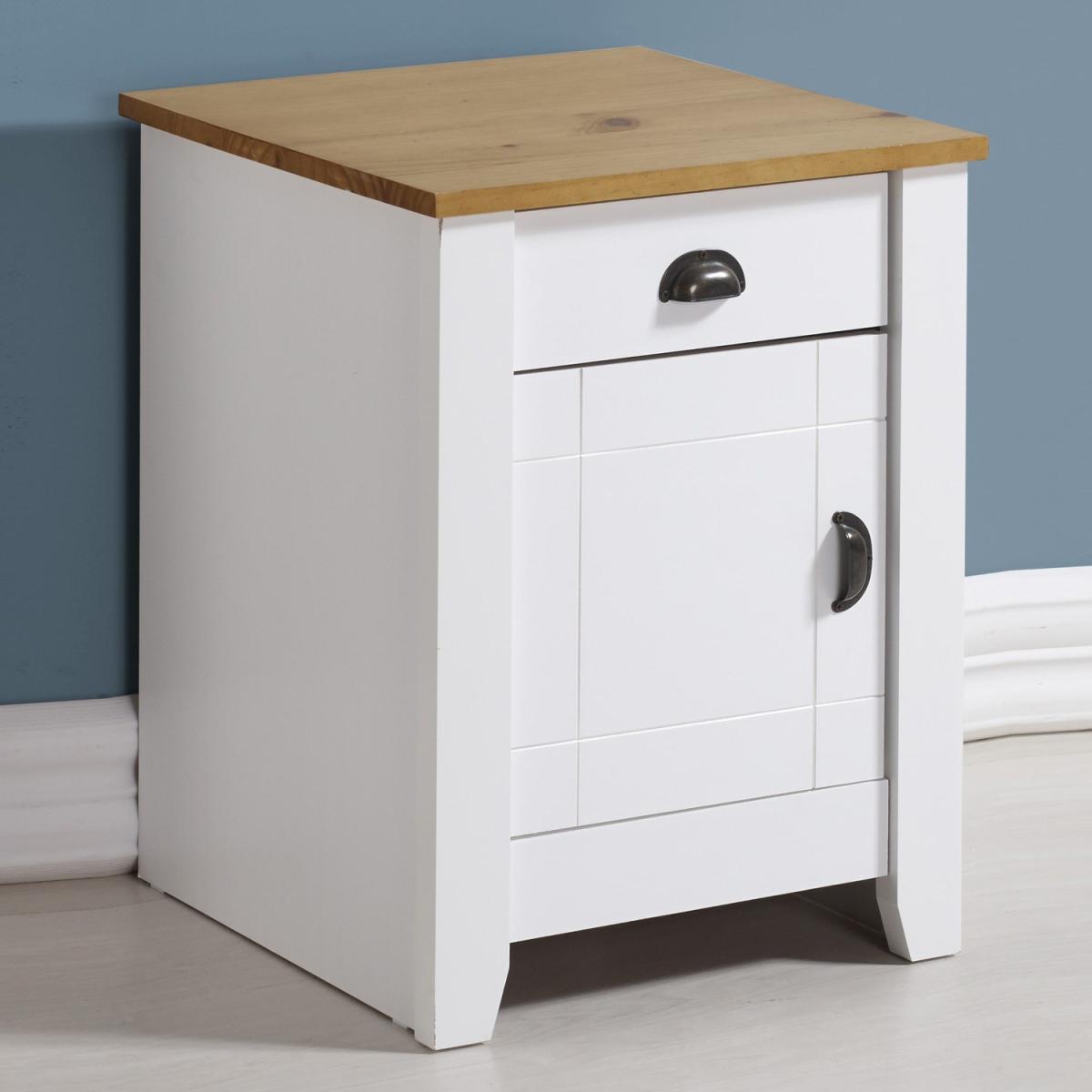 Dimensions. W46.5 x D41 x H59.5cm Drawer. W26.5 x D33 x H7.5cm Cupboard. W39 x D37 x H31cm Features. Contemporary two tone design. Oak effect top White painted finish1 drawer and 1 cupboard Rustic metal cup handles. Made from solid pine and MDFAssembly required..