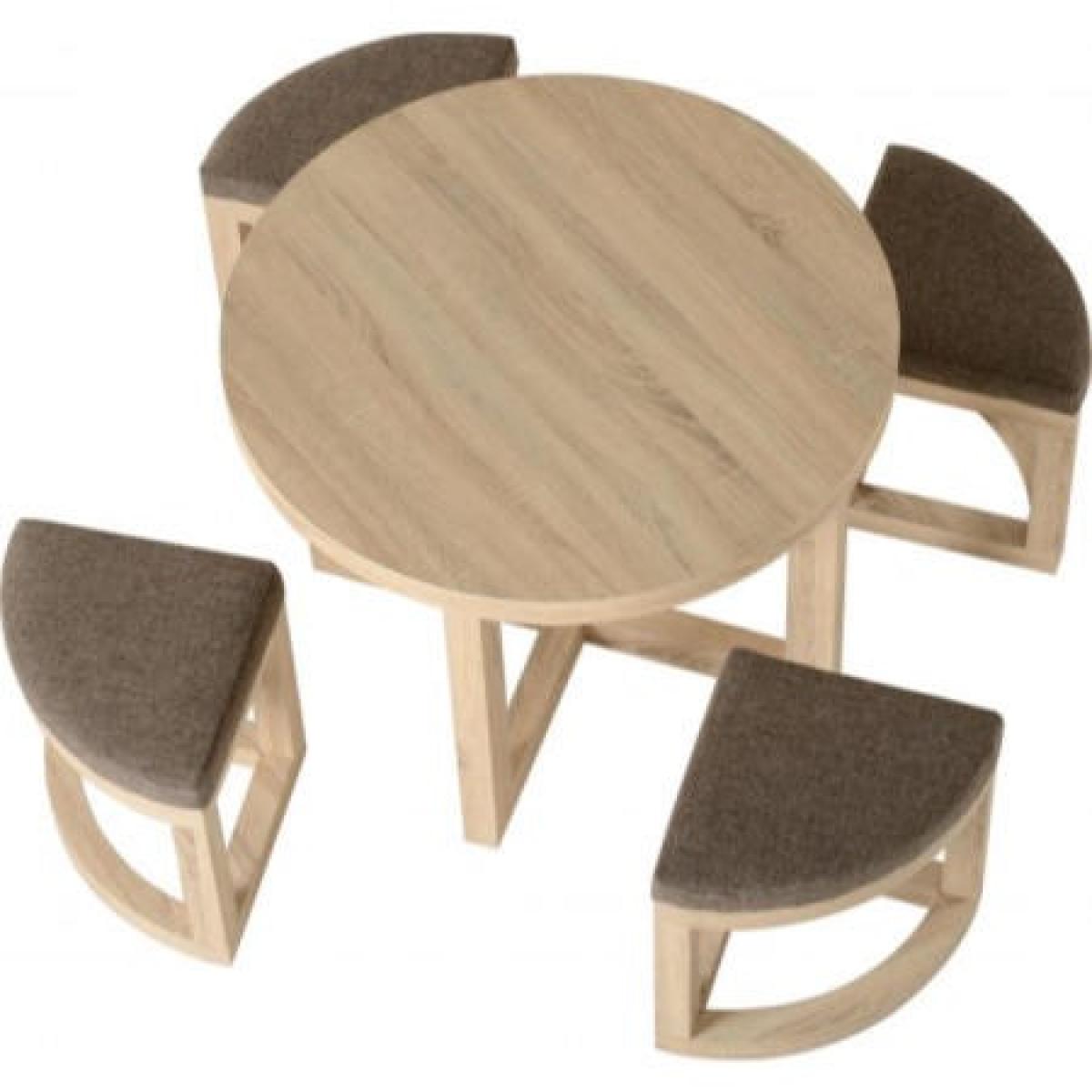 Table - W90 x D90 x H70 cm. Chairs - W52 x D38 x H46 cm Key features: Includes table and 4 chairs Practical stowaway dining set Comfy foam filled seat pads Ideal for small spaces Simple assembly required Table Top Thickness: W5 cm Underside of table: 6.5 cm Stool Leg Thickness: 5 cm Item Code: WHDS399S.