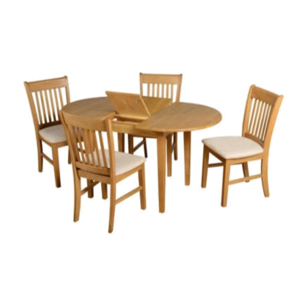 Traditional contemporary furniture for modern living the Oxford range of dining sets will save you space and provide a dining destination. The Oxford Extending Dining Set in Natural Oak effect is an excellent space-saving design and a complete dining experience. Extending from the centre the round table becomes oval but loses none of its timeless appeal. The accompanying chairs provide comfort and support with high backs and cream upholstered seats. Finish Natural Oak effect/ Rubberwood finish Sizes Dining Table W106 - 136cm x D80cm x H74cm. Dining Chairs W48cm x D41cm x H89cm Features. Dining Table and 4 Chairs Table Extends from CentreSpace-. Saving Design Cream Upholstered Seats..