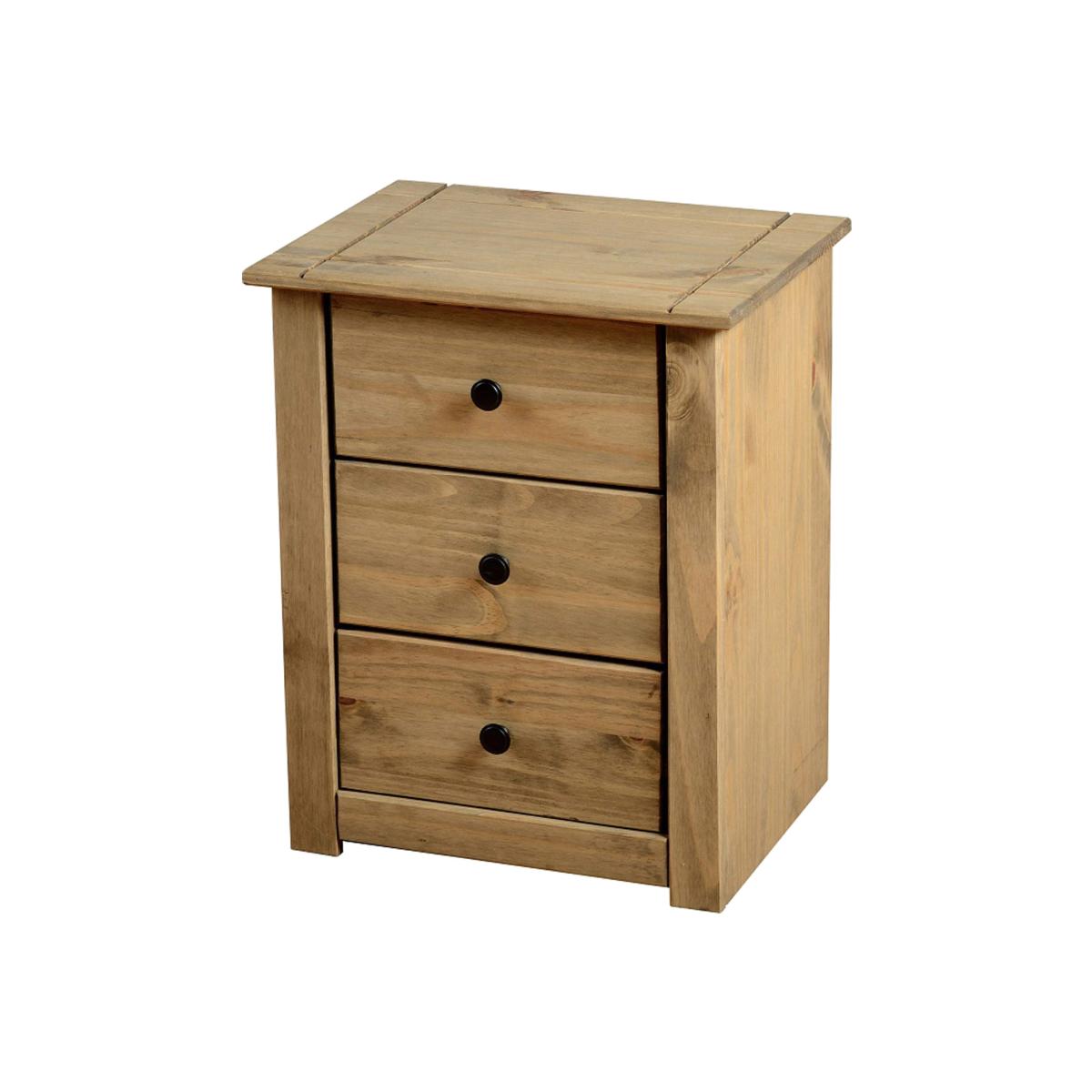 Dimensions. W46.5 x D40.5 x H57cm. Internal Drawer Space. W28.5 x D31 x H10.5cm Features. 3 Drawer bedside table Traditional design. Made from solid pine Waxed finish. Black metal handles. Rustic styling. Assembly required. Perfectly Proportioned This Panama bedside table offers excellect storage with 3 drawers and a spacious top perfect for all your night time essentials. Solid build Made from solid pine wood with a waxed finish this bedside table will stand the test of time and be by your side no matter what. The Panama has a classic and traditional design featuring a warm and neutral finish with contrasting black metal drawer handles for a rustic feel. Assembly This product is delivered flat packed so you can get it through the door and up the stairs with ease. Accompanied with easy to follow step-by-step instructions and all the fittings and fixtures you need so it can be managed by one person..