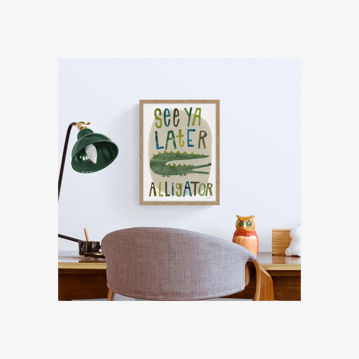 The “See Ya Later Alligator” framed print adds a touch of playful charm to any space, making it ideal for casual, colourful interiors or a child's bedroom. I love how its whimsical design and vibrant colours can introduce a lively, conversational element without overwhelming the surroundings. It's versatile enough to work well in a variety of settings, from a cosy study nook to a contemporary living room. For styling, consider pairing it with simple wooden or neutral-toned frames to let the artwork stand out, and balance the colour palette by incorporating complementary accents nearby. This piece is a great way to inject personality and a bit of humour into your decor, making it both a fun focal point and a conversation starter.