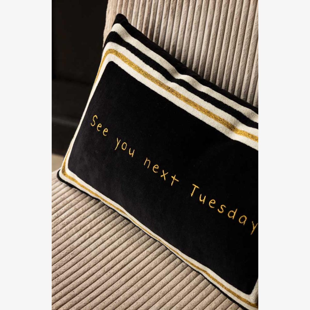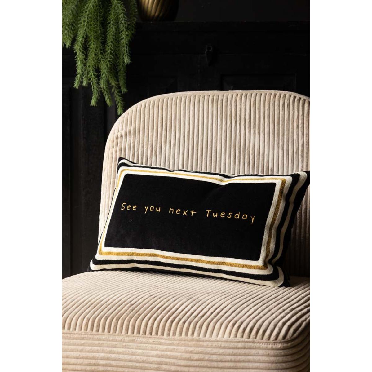 For those who appreciate a dash of daring decor, the See You Next Tuesday Cushion is all about tongue-in-cheek humour with a luxurious twist. This isn't meant to offend; it's designed for those who embrace a little sweary style in the home, guaranteed to spark smiles and perhaps a few raised eyebrows! Crafted from sumptuous black cotton velvet, this cushion is a tactile delight, featuring bold gold embroidered lettering with a chic piped edge. Measuring H30cm x W50cm, it's filled and ready to go as the ultimate statement piece, bringing character and personality to any space. Whether it's for your sofa, bed, or favourite armchair, this cushion is the perfect quirky addition to your decor; or a fun gift for someone who loves a touch of cheeky humour! - See You Next Tuesday Black & Gold Cushion - Measures H30cm x W50cm - Material: Cotton Velvet - Cushion comes with inner