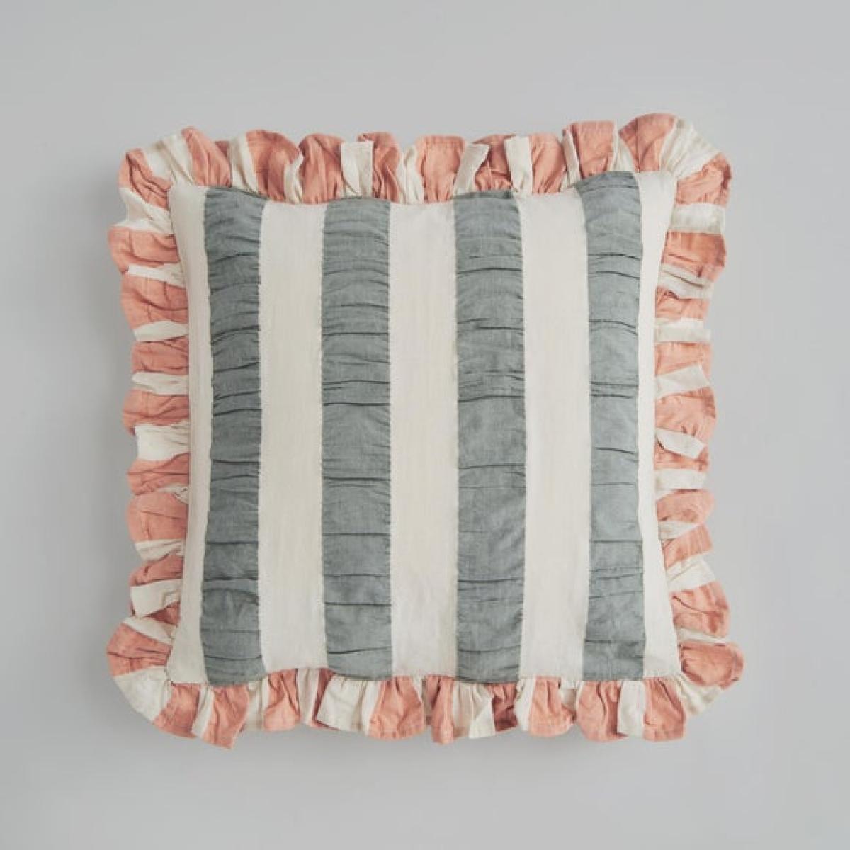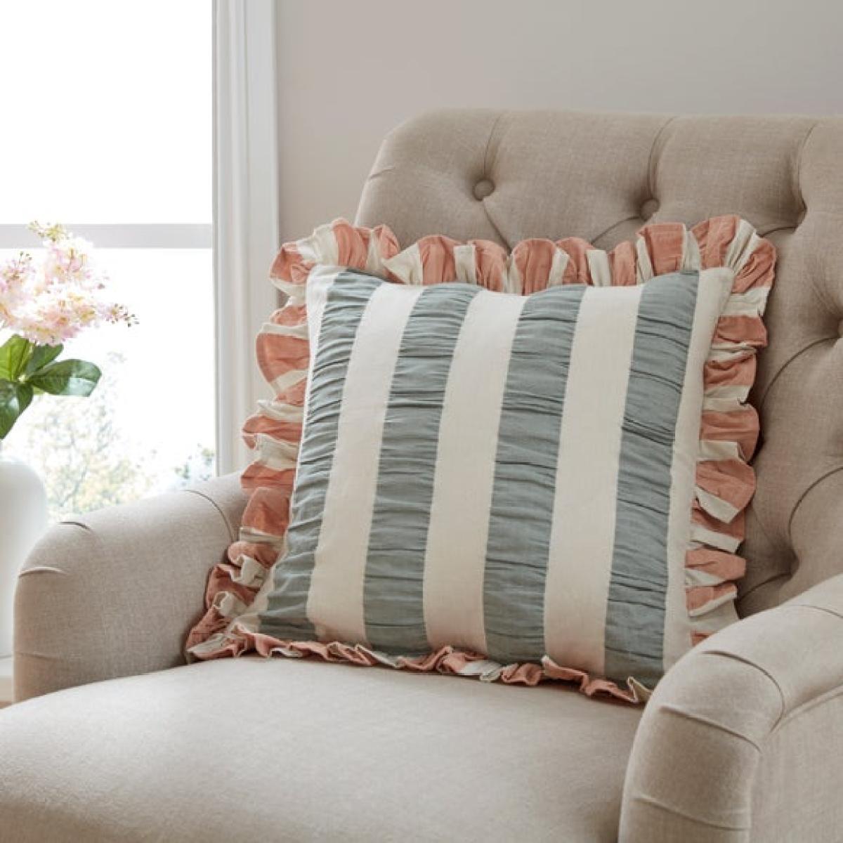 * Stripe design * Zip closure * Frill edge finish * 100% Cotton * Machine washable Classic stripes with a playful twist. This square cushion features contrast frill edging and soft seersucker cotton for a light, textured finish. Machine washable and easy to care for, it's a fresh update for beds, chairs or sofas.
