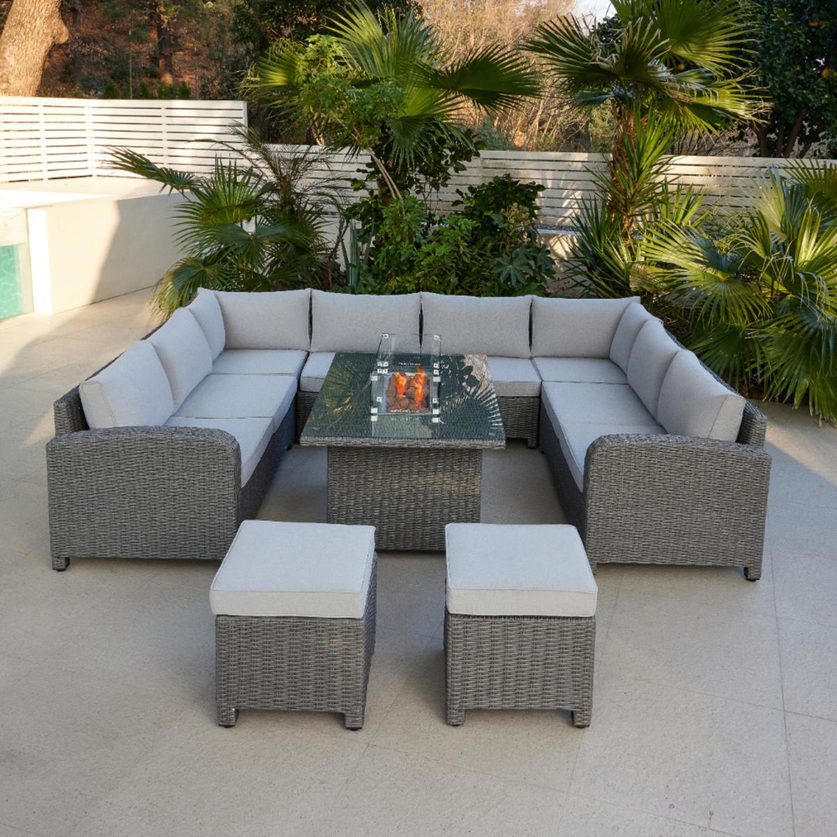 Introducing our Segrada Garden Furniture range. Upgrade your outdoor space with this dark grey rattan U Shaped finished with grey padded cushions. Paired with either a Fire Pit table or Rising Table to take you from lounging to dining. Choose from a 8,9 or 10 seater U shape set to create your garden space your way. We recommend that you use the provided garden furniture cover when not in use, and bring your cushions indoors for longevity. Our garden cushions and fabric are delivered vacuum-packed, which might result in a slightly wrinkled and flattened appearance upon arrival. Segrada Garden set is also available in 5,6 or 7 seater L shaped options if you are looking for a smaller seating arrangement. If you are choosing the fire pit, you can use propane gas. The maximum diameter of the gas bottle is 30cm, and the maximum height must be 43cm. Please check your gas bottle measurements prior to purchase. This garden set is a large item, therefore we require you to ensure it will fit through any access doors and walkways up to and within around your property. Minimum door width of 80cm. All sizes are approximate, please allow for small variations. Delivery Information: Delivered by our friendly couriers on a 2man delivery service within 3-7 working days. The courier will deliver to a room of your choice. Care instructions: When not in use, use the provided garden cover&bring the cushions indoors. We recommend you do not remove the cushion covers, to clean please use an upholstery cleaner following the manufacturer's instructions Screen resolution: Rattan finish and fabric appearance may vary due to differences in lighting and screen resolution on devices Segrada U-shaped 10 Seater Dark Grey Rattan Fire Pit Table This garden set is a large item, therefore we require you to ensure it will fit through any access doors and walkways up to and within around your property. Minimum door width of 80cm. All sizes are approximate, please allow for small variations. Please note this item will arrive across several packages. 10 Seater Sofa: W: 424cm D: 221cm H: 70.5cm Fire Pit Table: W: 130cm D: 79.5cm H: 61cm Footstool: W: 45cm D: 45cm H: 38cm Total Product Weight:85.6kg Package Dimensions: 7 Boxes Box 1 W88cm x D87cm x H74cm Box 2 W86cm x D74cm x H72cm Box 3 W78cm x D48cm x H37cm Box 4 W132cm x D84cm x H14.5cm Box 5 W161.5cm x D91cm x H76cm Box 6/7 W75cm x D72cm x H71cm Total Packaging Weight:160.18kg